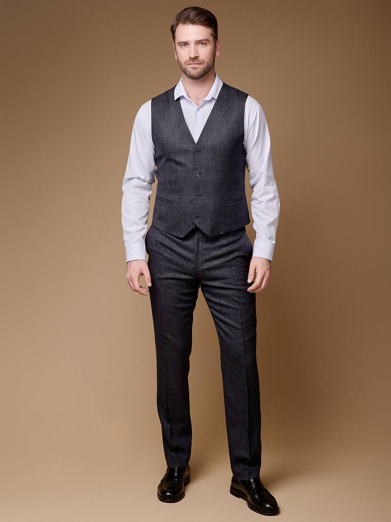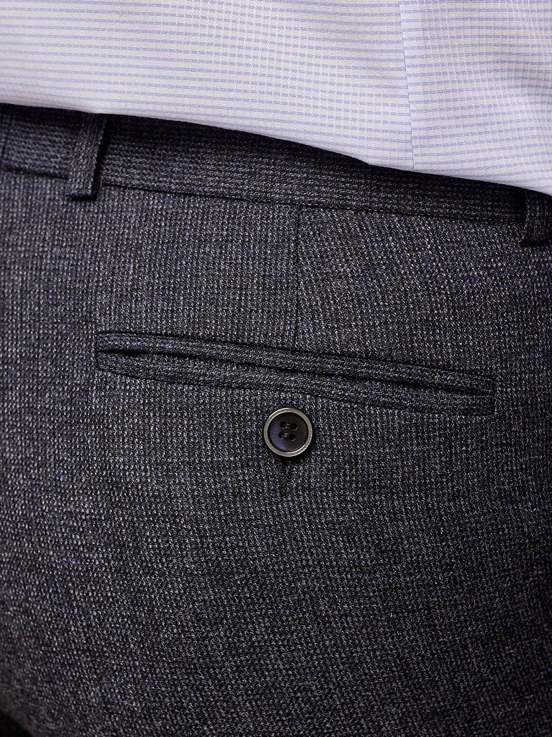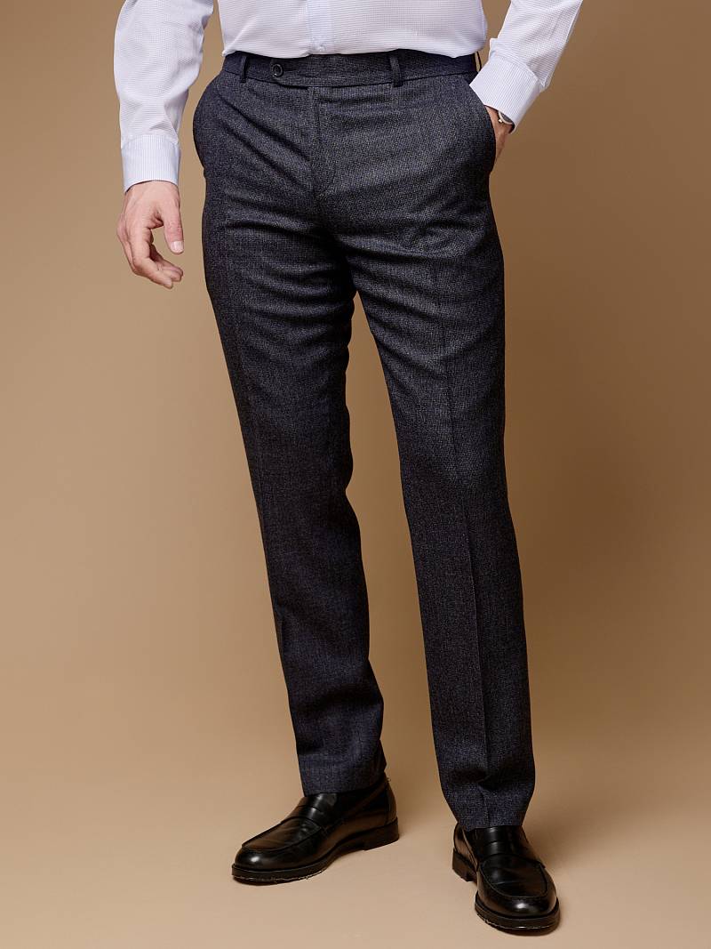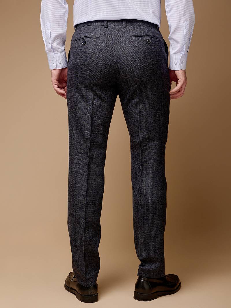 Slim fit (ПРИЛЕГАЮЩИЙ СИЛУЭТ), рекомендуется брать на размер больше. Брюки без защипов, с боковыми наклонными карманами и двумя задними карманами «в рамку». Передние половинки на подкладке. Верхний срез брюк обработан поясом с корсажной лентой и шлевками под ремень. Застежка обработана на тесьму-молнию, с петлей-пуговицей на поясе и усилен металлическим крючком.