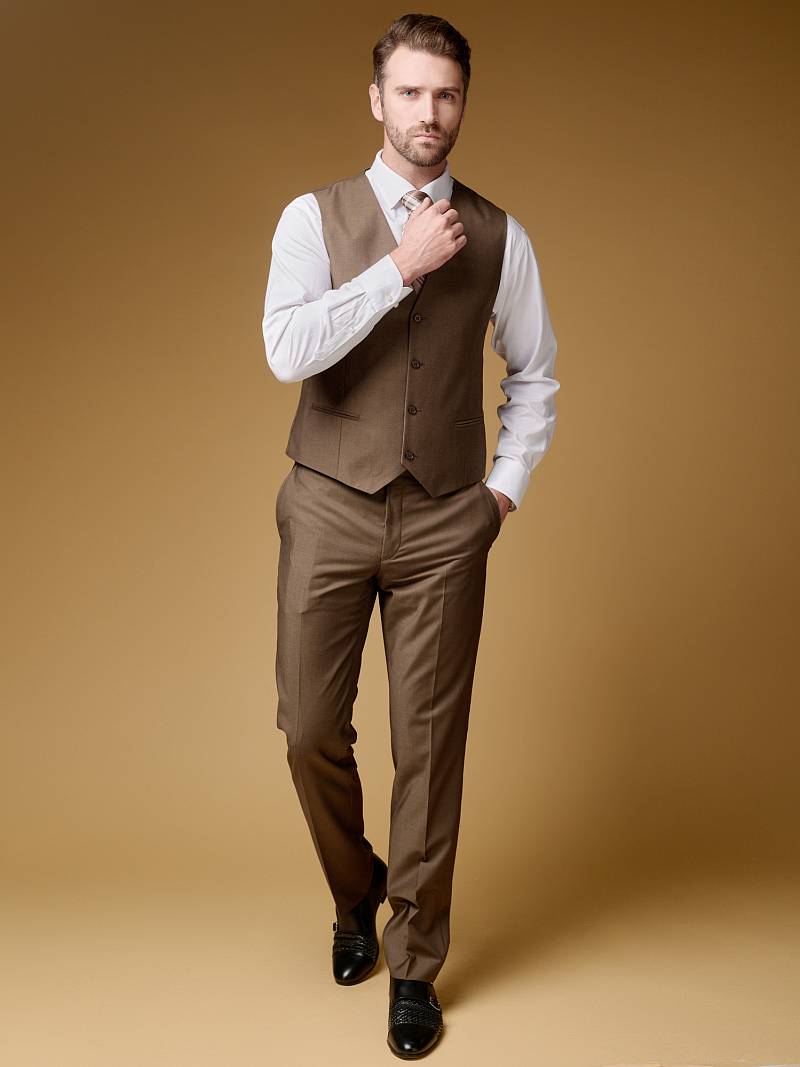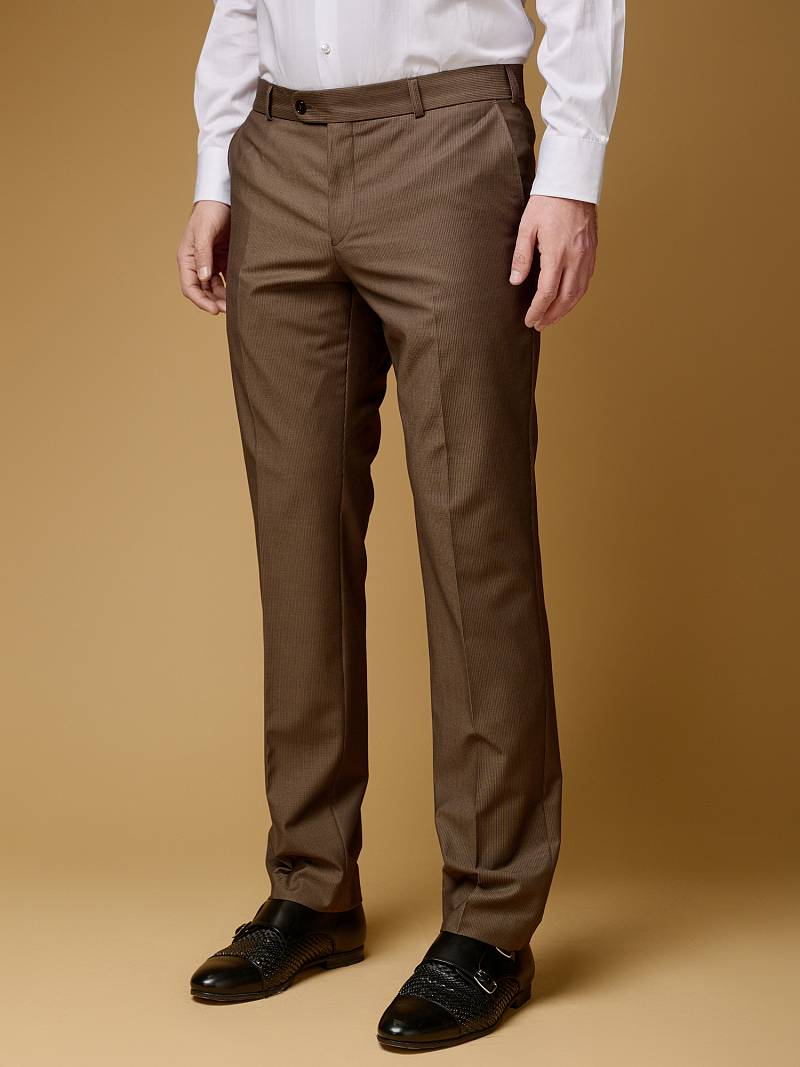 Classic fit (ПОЛУПРИЛЕГАЮЩИЙ СИЛУЭТ). Брюки без защипов, с боковыми наклонными карманами и двумя задними карманами «в рамку». Передние половинки на подкладке. Верхний срез брюк обработан поясом с корсажной лентой и шлевками под ремень. Застежка обработана на тесьму-молнию, с петлей-пуговицей на поясе и усилен металлическим крючком.