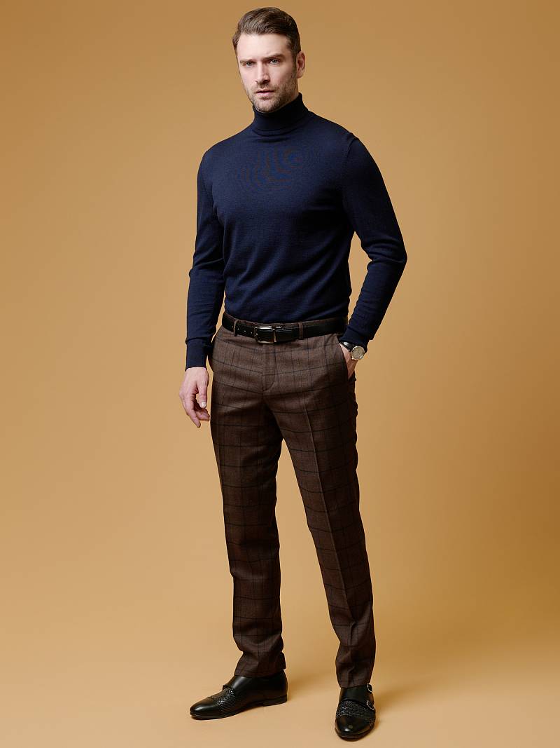 Slim fit (ПРИЛЕГАЮЩИЙ СИЛУЭТ), рекомендуется брать на размер больше. Брюки без защипов, с боковыми наклонными карманами и двумя задними карманами «в рамку». Передние половинки на подкладке. Верхний срез брюк обработан поясом с корсажной лентой и шлевками под ремень. Застежка обработана на тесьму-молнию, с петлей-пуговицей на поясе и усилен металлическим крючком.
