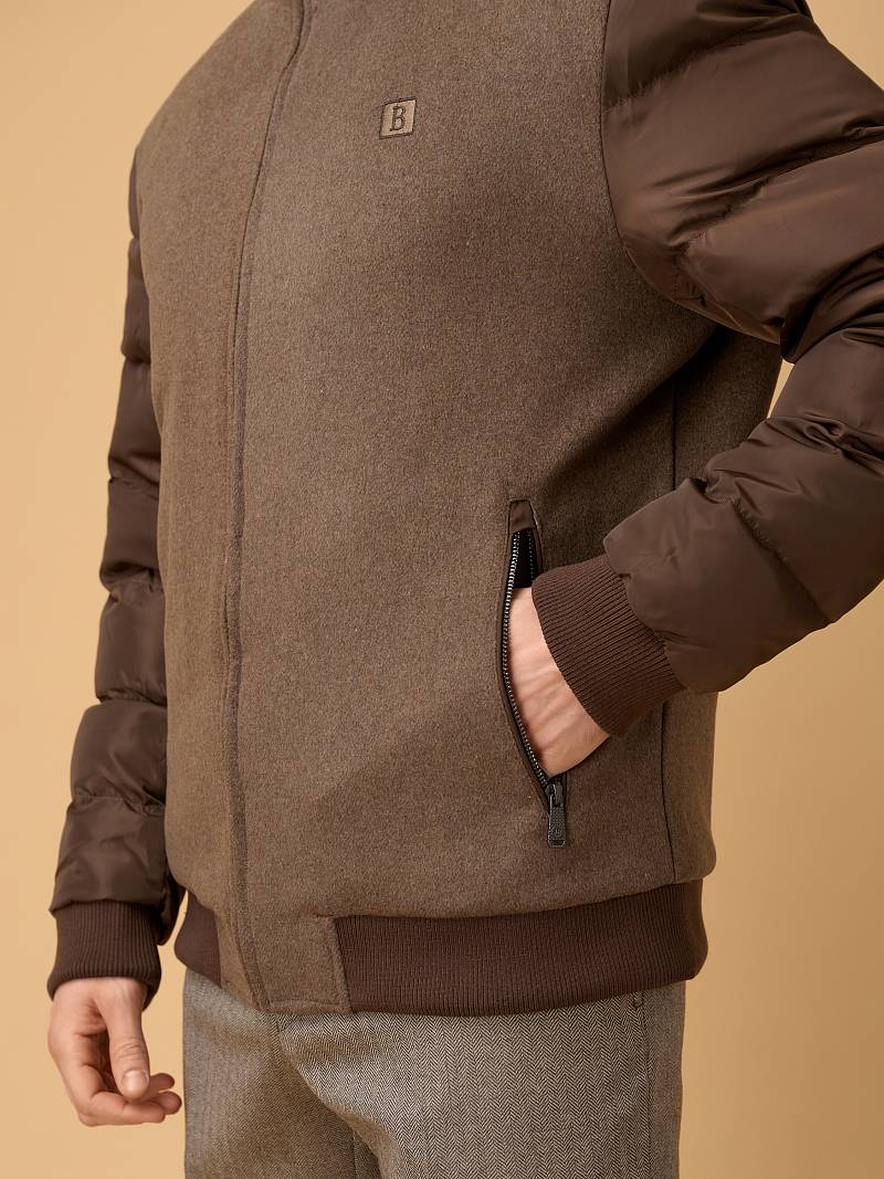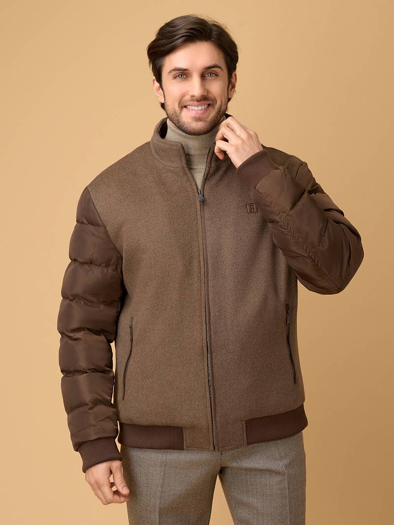 Современная комбинированная куртка-бомбер торговой марки BAZIONI изготовлена в духе стиля smart casual. Она сочетает в себе актуальный силуэт, премиальные материалы и продуманные детали для тепла и комфорта. Куртка сшита из премиальной 100% шерсти, эффективно сохраняющей тепло,создающей благородную, мягкую фактуру и отличающейся легкостью. Комбинированные утепленные рукава, выполненные из стеганой плащевой ткани, гармонируют с основным материалом, придают модели динамичный и современный вид. Центральная застежка на молнию с фирменным брендированным бегунком , Аккуратный воротник-стойка с внутренней отделкой из трикотажа защищает от ветра. Два вместительных вертикальных кармана на молниях c брендированными бегунками добавляют стильности и удобства. Для сохранения тепла и комфорта манжеты на рукавах и низ куртки собраны на широкую резинку с фактурой в рубчик. Для дополнительного тепла используется стеганая подкладка, на которой расположены два кармана на молниях. Внутри куртки выполнена отделка из контрас