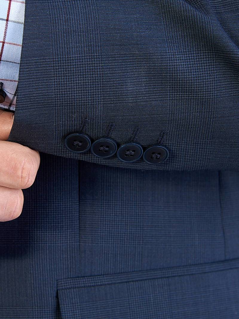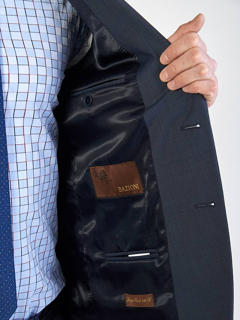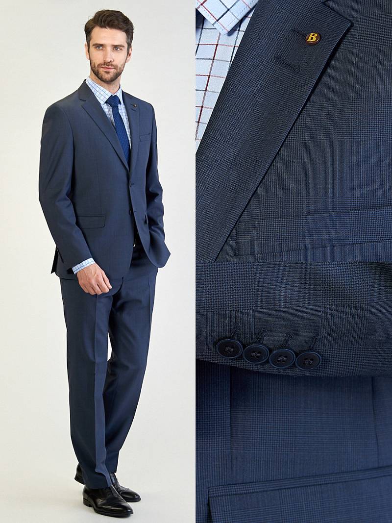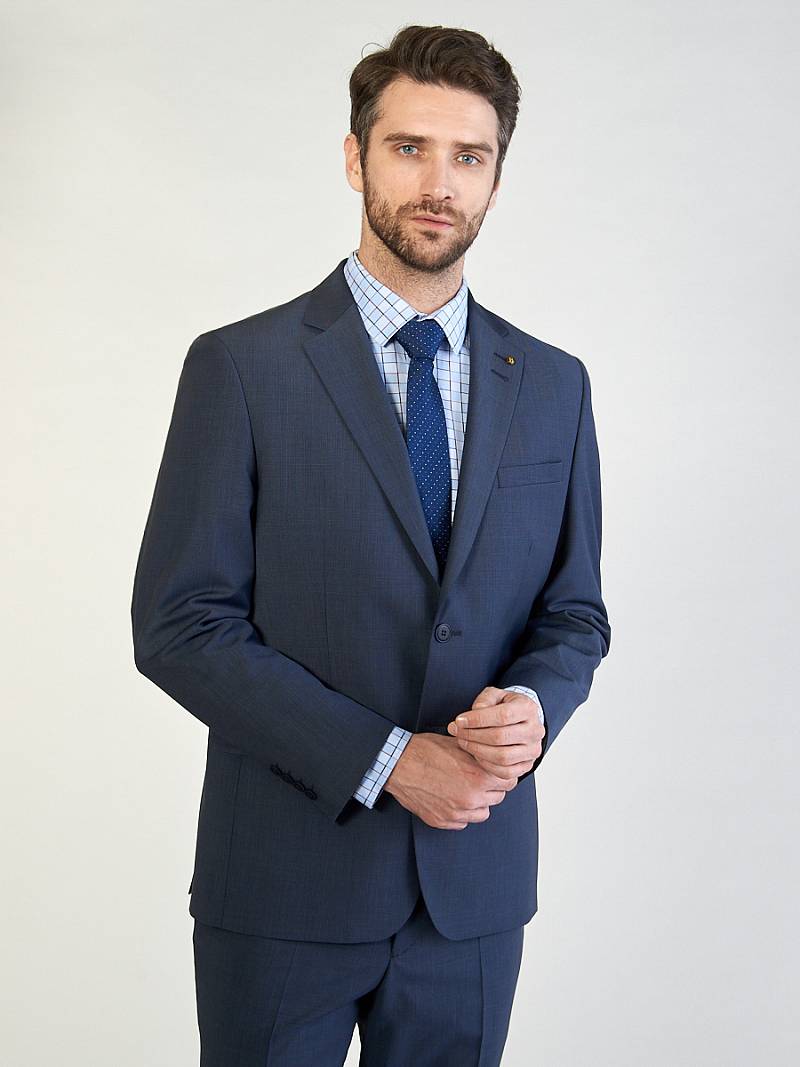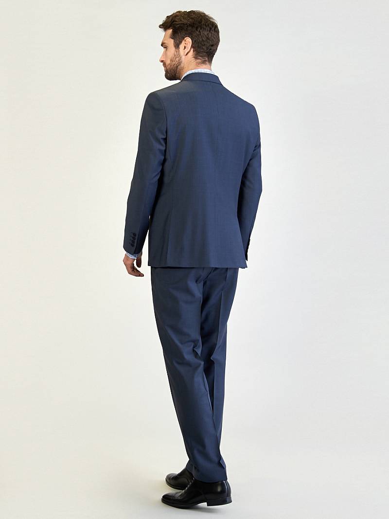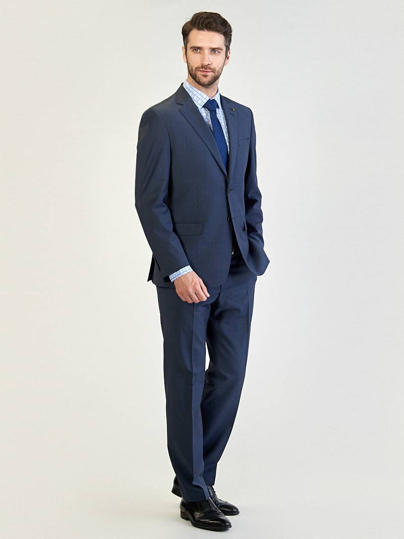 Классический костюм двойка Classic fit. Пиджак на две пуговицы, с боковыми и нагрудным карманами, по спинке две шлицы. Брюки без защипов с боковыми и одним задним карманом.