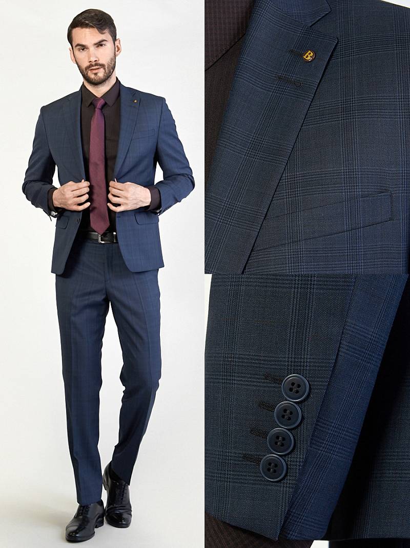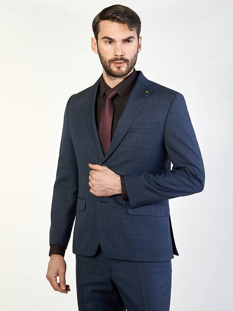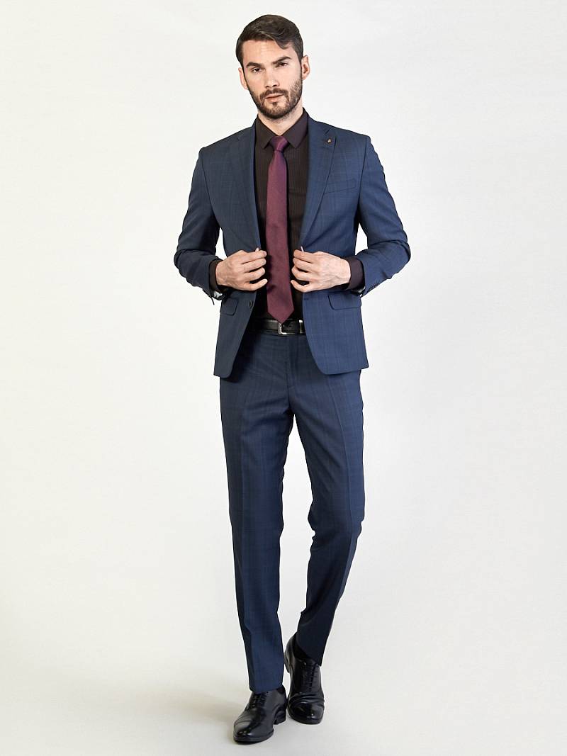 Классический костюм двойка Classic fit. Пиджак на две пуговицы, с боковыми и нагрудным карманами, по спинке две шлицы. Брюки без защипов с боковыми и одним задним карманом.