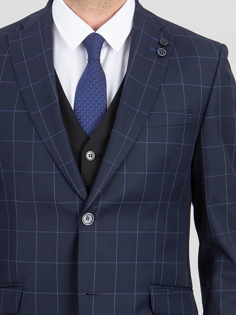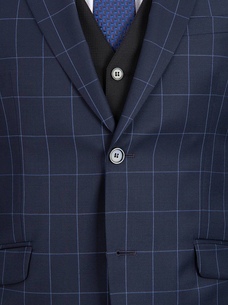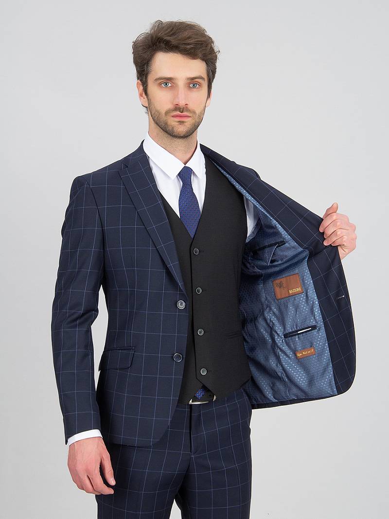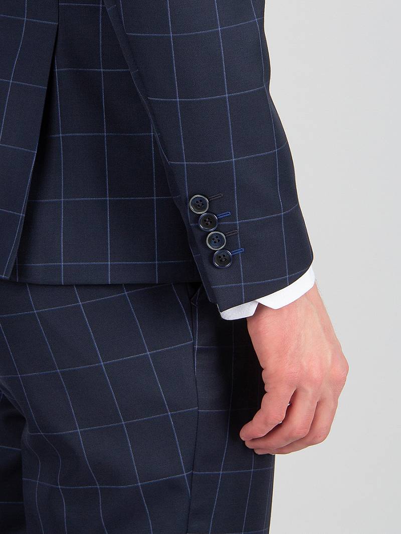 Slim fit, две пуговицы, две шлицы. Фасонная петля с пуговицей на лацкане.