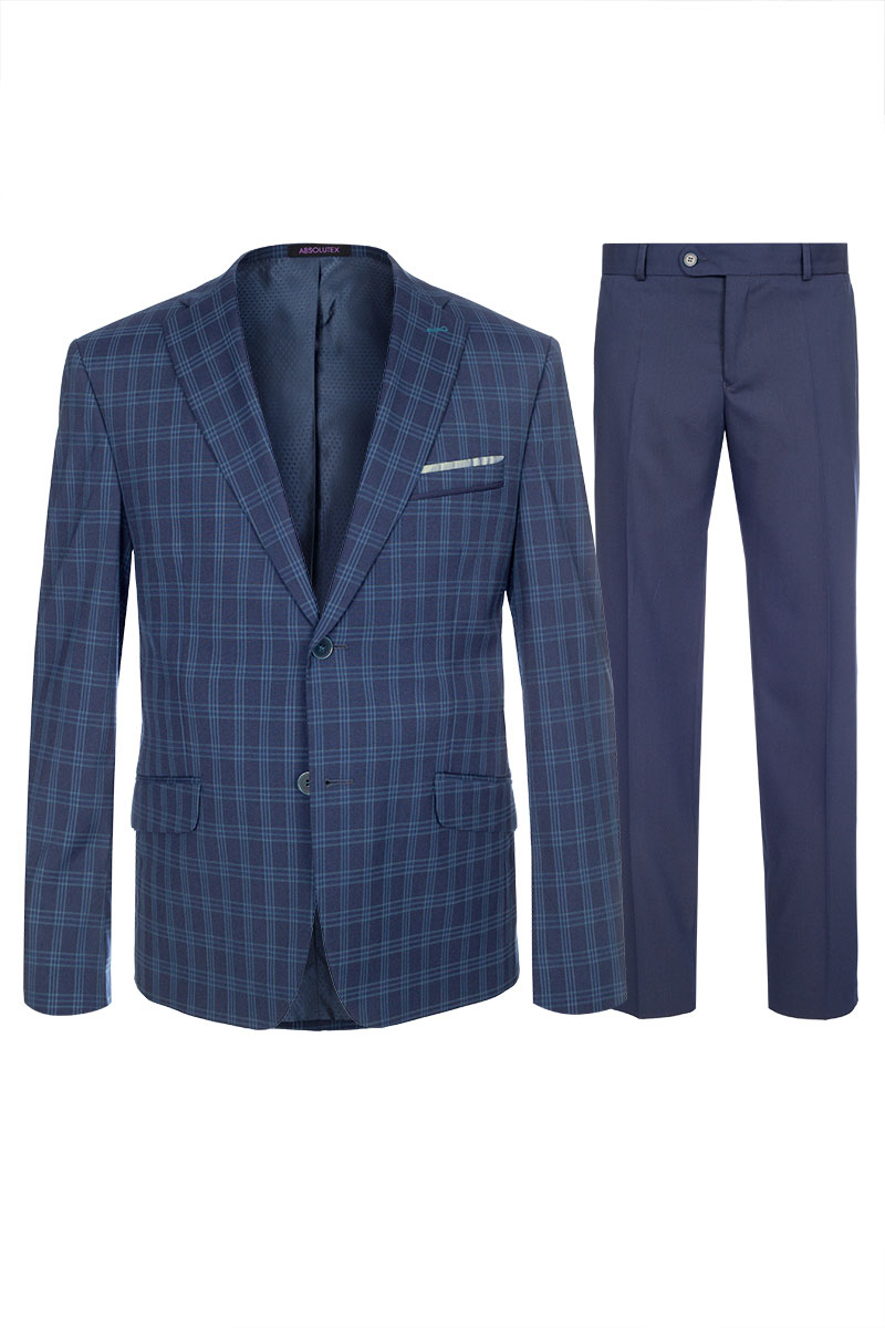 Классический костюм двойка Slim fit . Пиджак на две пуговицы, с боковыми и нагрудным карманами, по спинке две шлицы. Брюки без защипов с боковыми и одним задним карманом, выполнены из ткани компаньона.