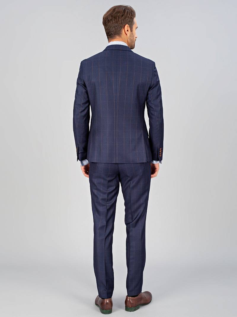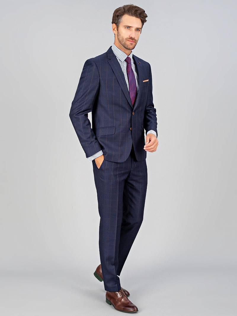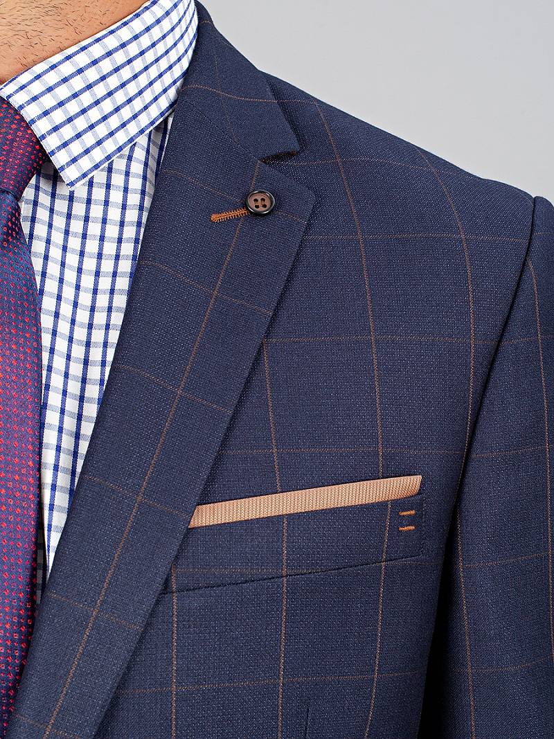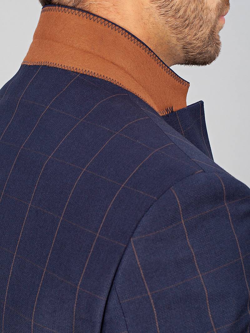 Slim fit, две пуговицы, две шлицы. Декоративный платок в нагрудном кармане, контрастные петли.