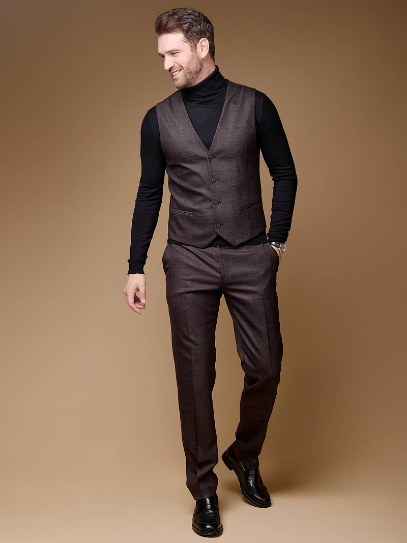 Classic fit (ПОЛУПРИЛЕГАЮЩИЙ СИЛУЭТ). Мужские брюки со стрелками благодаря лаконичному прямому крою без защипов с классической посадкой одинаково гармонично дополнит строгий офисный образ с пиджаком и менее формальный с джемпером или рубашкой. Брюки с боковыми наклонными карманами и одним задними карманом "в рамку". Верхний срез брюк обработан поясом с корсажной лентой и шлевками под ремень. Брюки мужские, классические, нарядные, повседневные, молодежные, casual, для работы в офисе, модные, для мужа, сына, брата, на праздник.