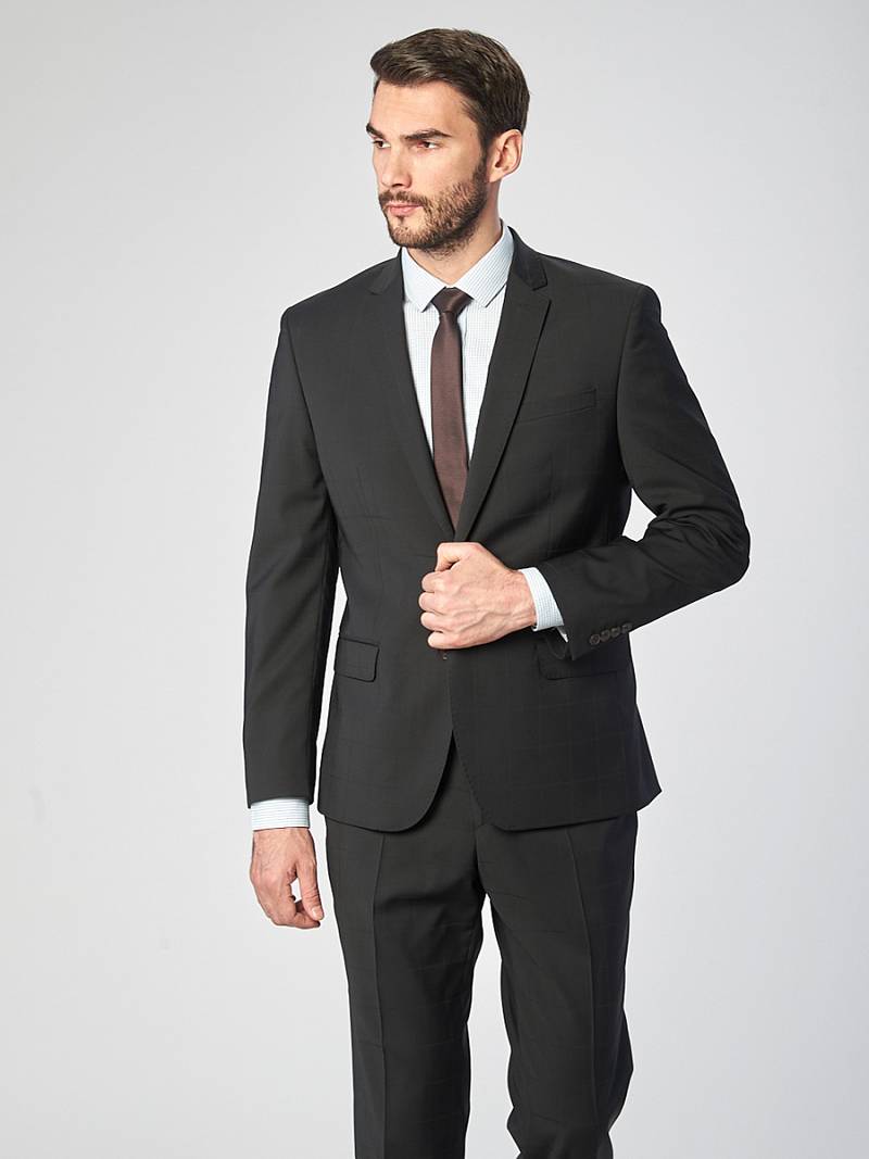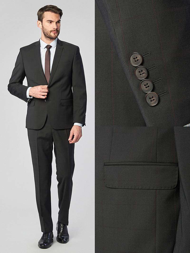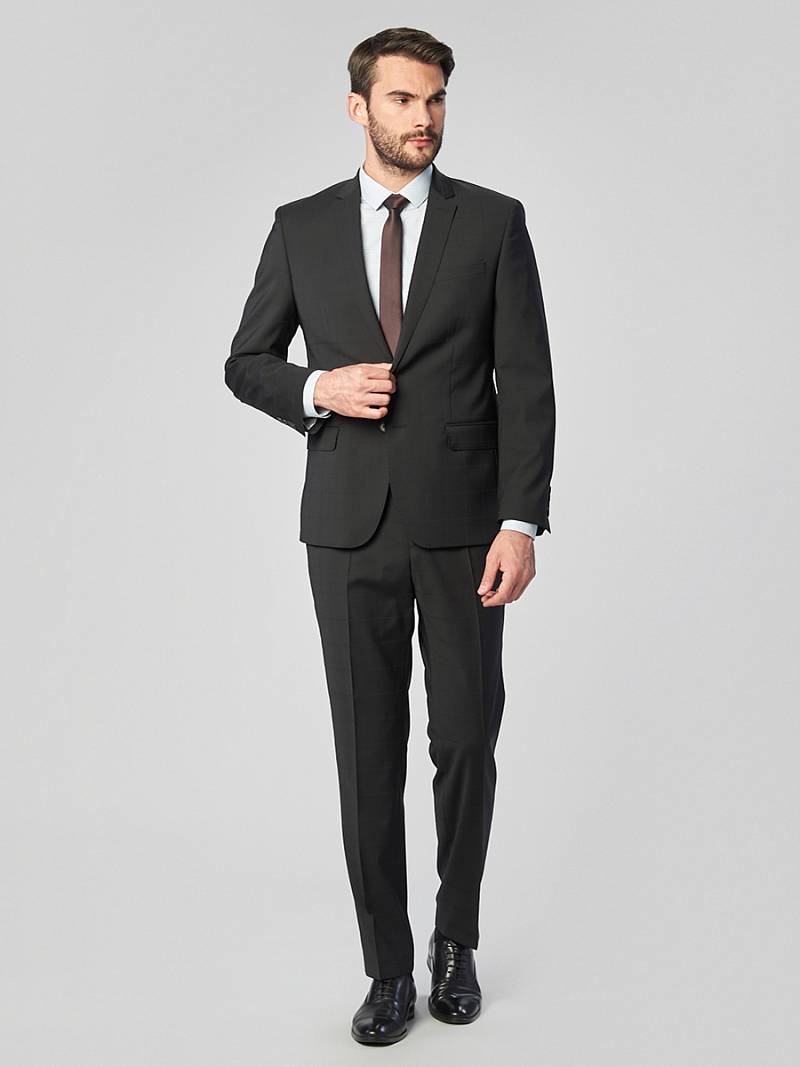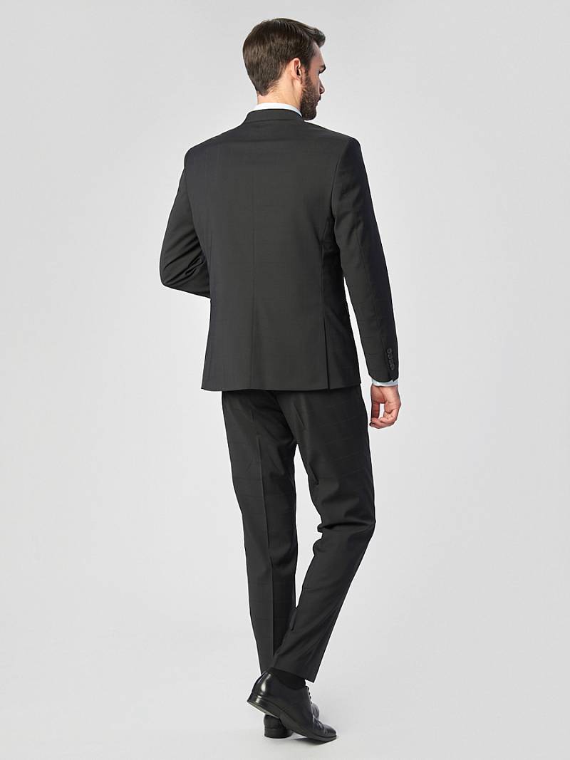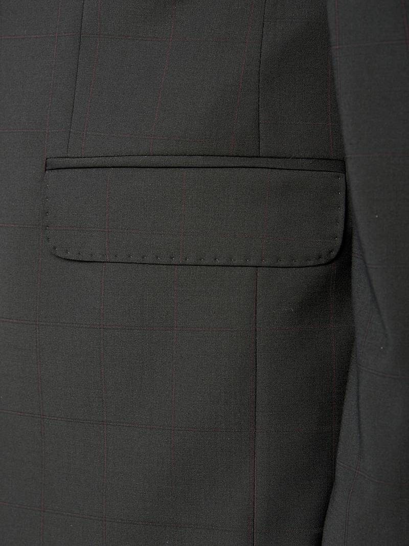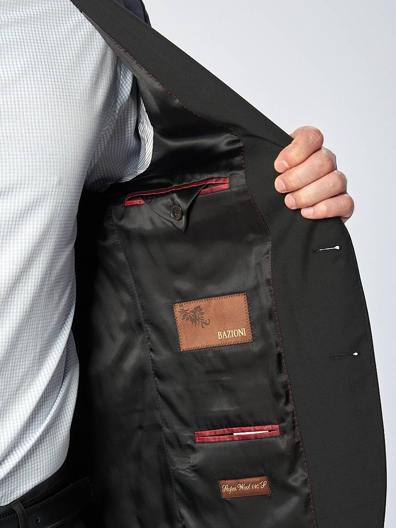 Slim fit, две пуговицы, две шлицы. Вспушка по воротнику, лацканам, борту, клапанам и листочке. BAZIONI.
