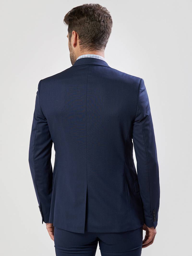 Классический костюм двойка Slim fit. Пиджак на две пуговицы, с боковыми и нагрудным карманами, по спинке одна шлица. Брюки без защипов с боковыми и одним задним карманом.