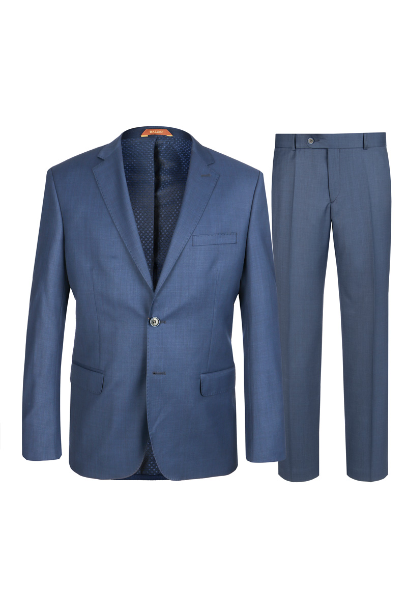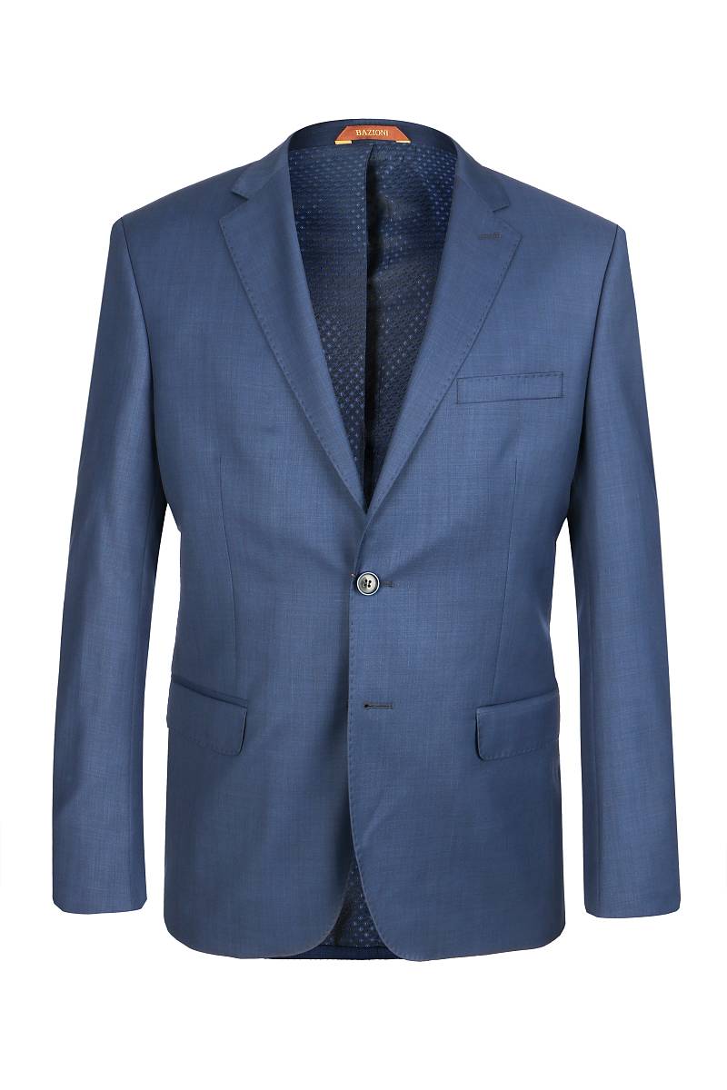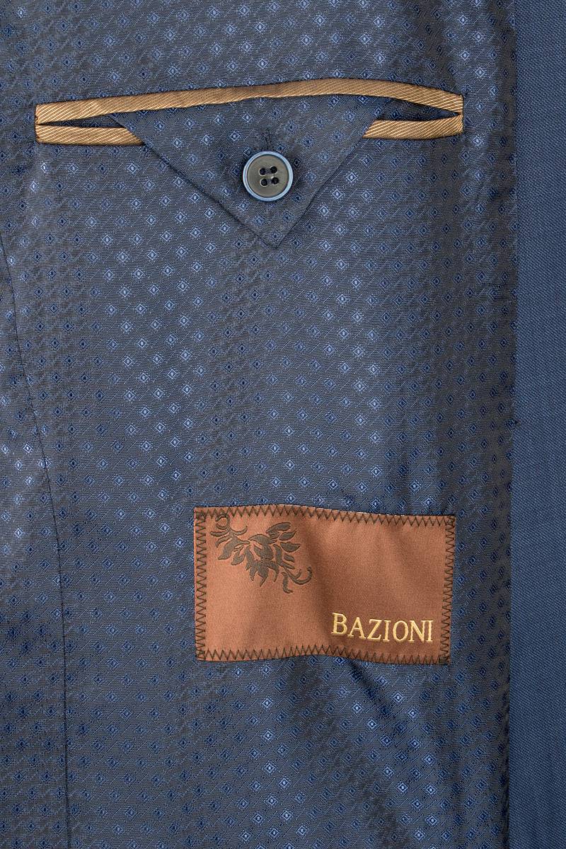 Classic fit, две пуговицы, две шлицы, Вспушка по воротнику, лацканам, борту, клапанам и листочке. BAZIONI.