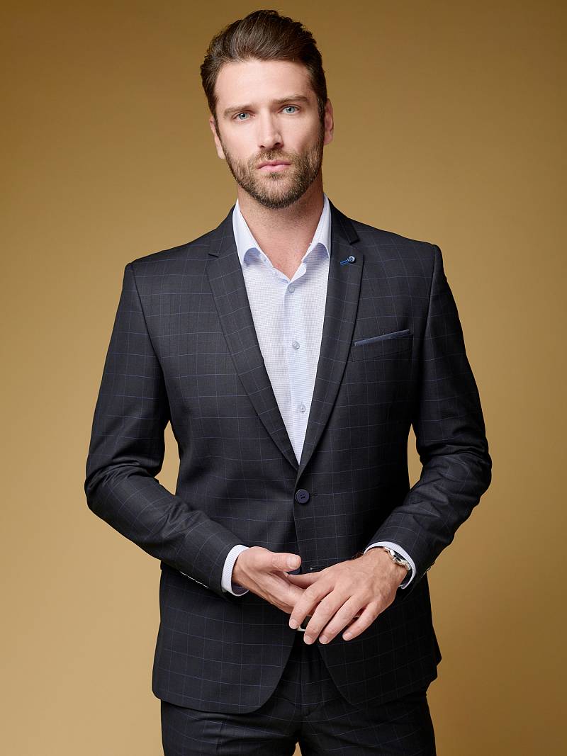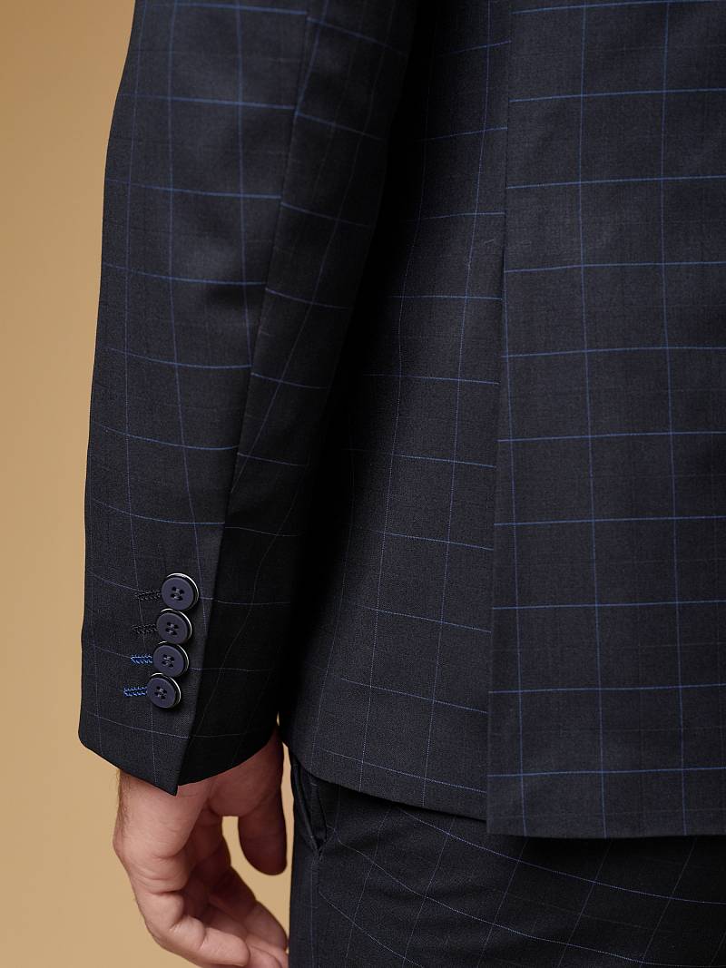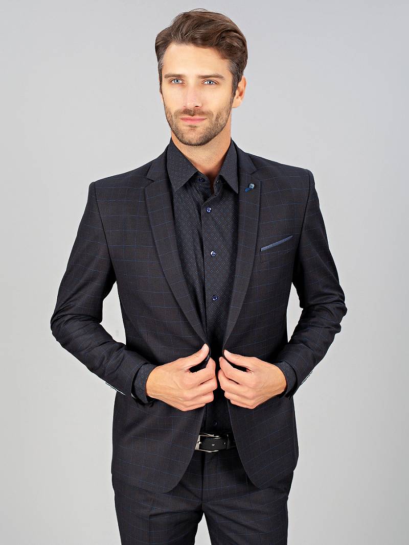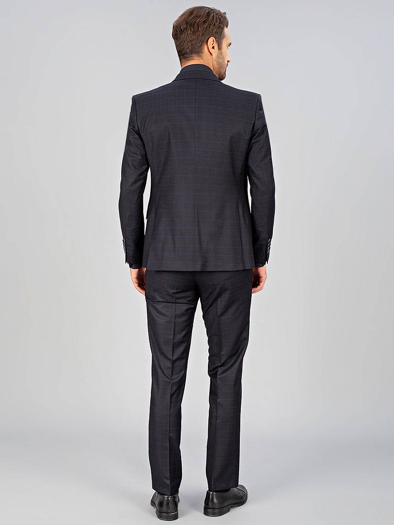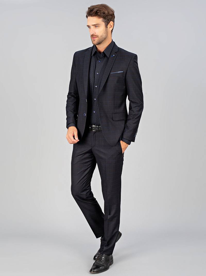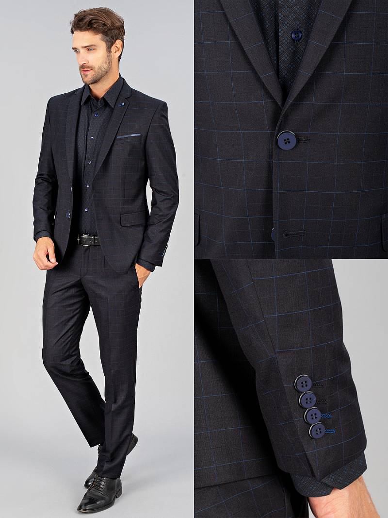 Классический костюм двойка Slim fit. Пиджак на две пуговицы, с боковыми и нагрудным карманами, по спинке две шлицы. Брюки без защипов с боковыми и двумя задними карманами.