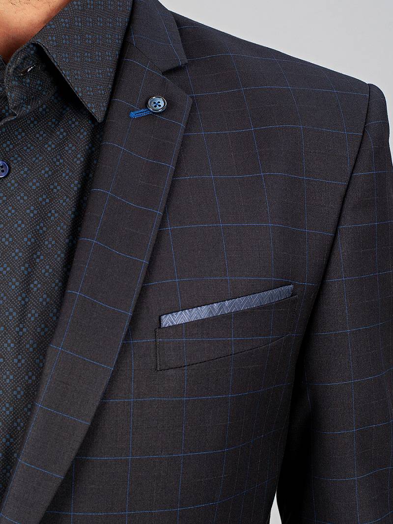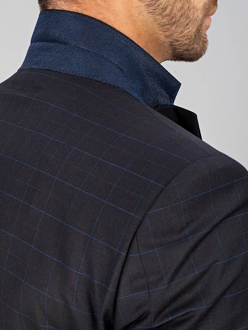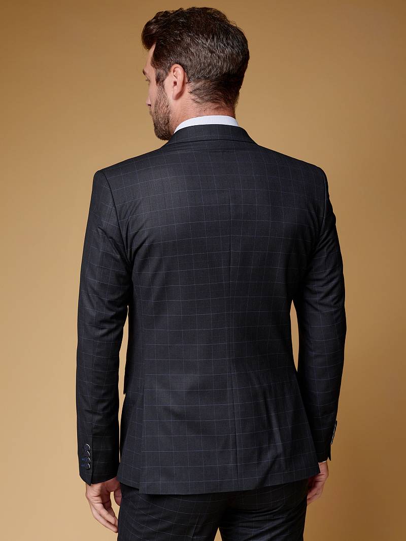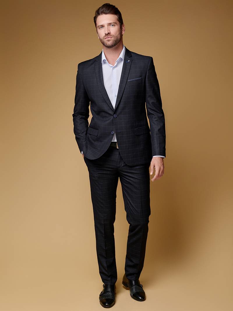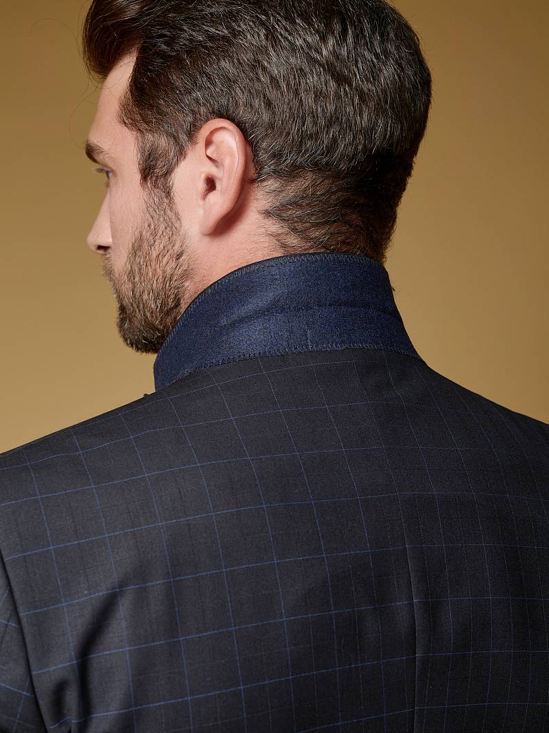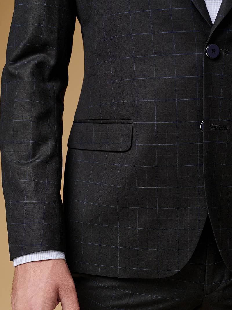 Классический костюм двойка Slim fit. Пиджак на две пуговицы, с боковыми и нагрудным карманами, по спинке две шлицы. Брюки без защипов с боковыми и двумя задними карманами.