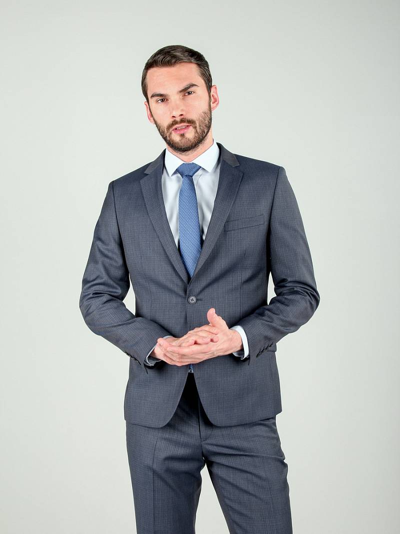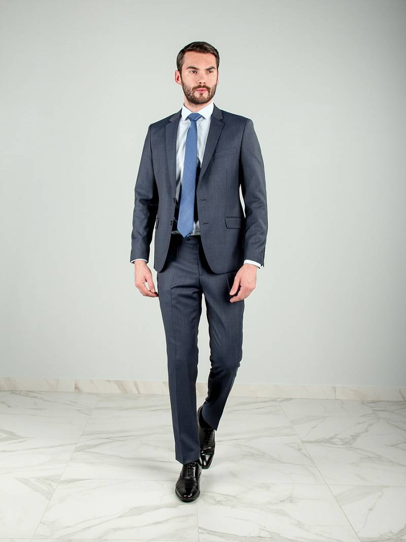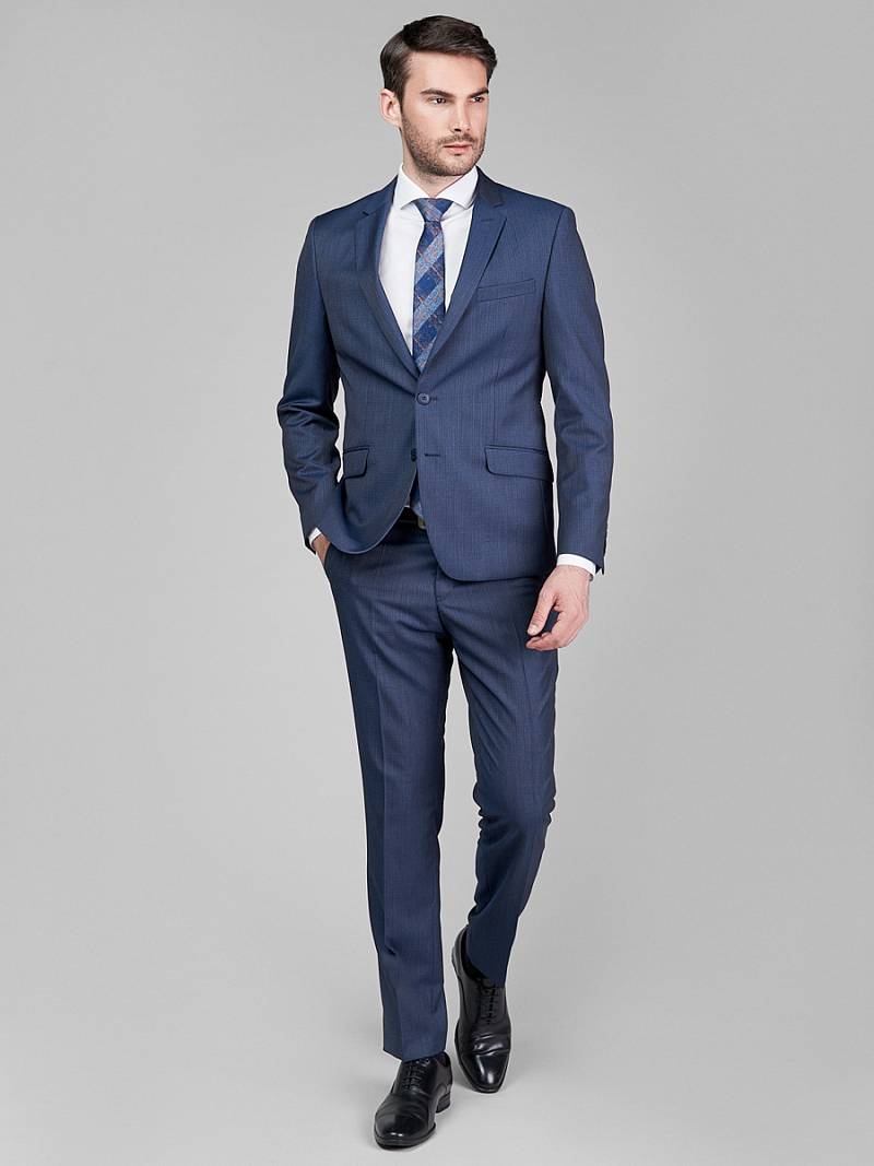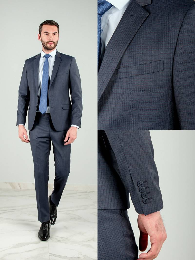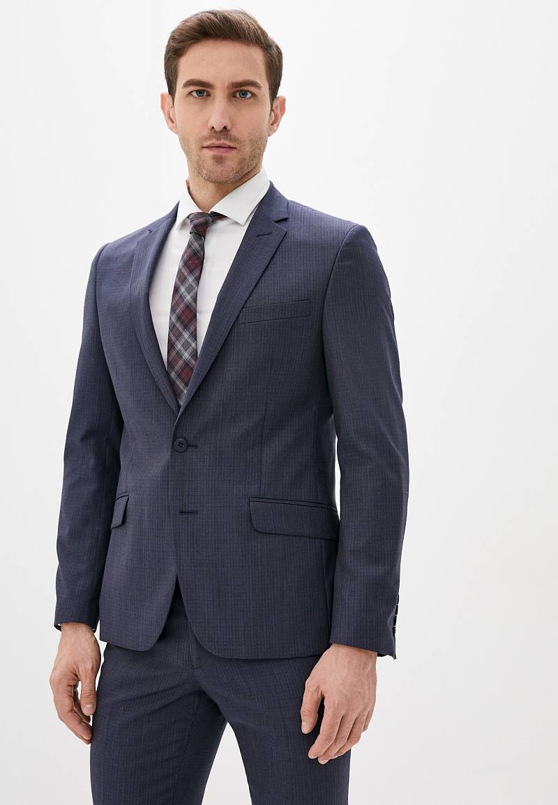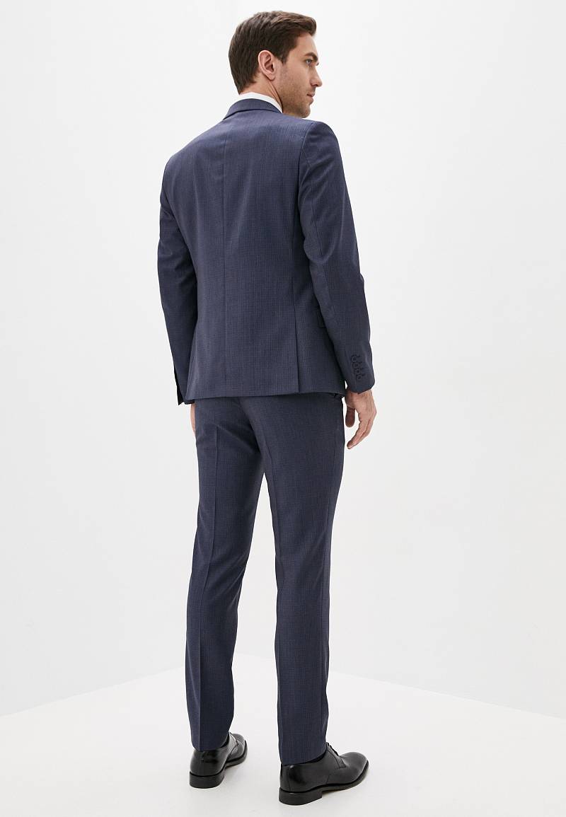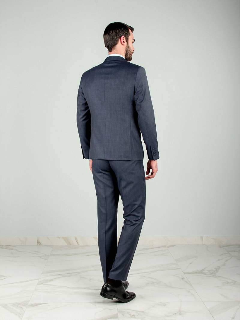 Классический костюм двойка Slim fit. Пиджак на две пуговицы, с боковыми и нагрудным карманами, по спинке две шлицы. Брюки без защипов с боковыми и одним задним карманом.