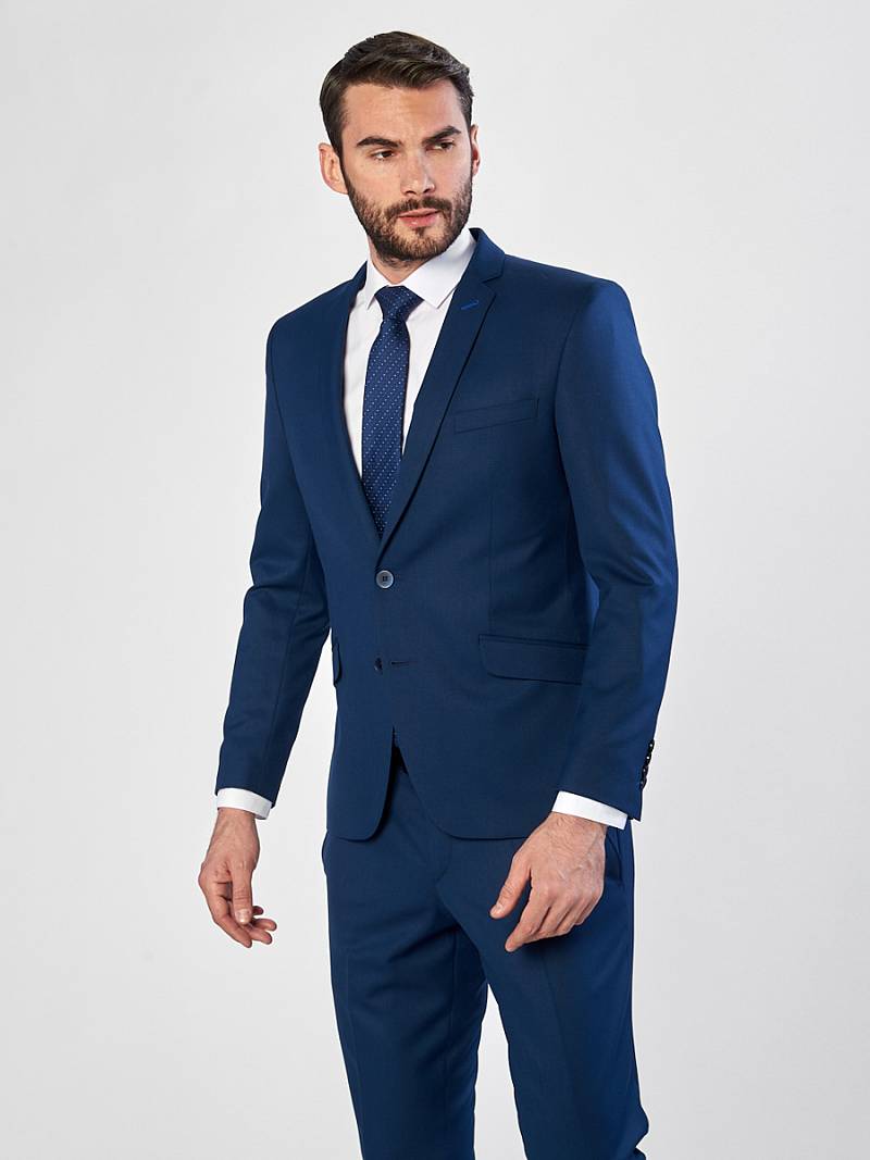 Классический костюм двойка Slim fit. Пиджак на две пуговицы, с боковыми и нагрудным карманами, по спинке две шлицы. Брюки без защипов с боковыми и двумя задними карманами.