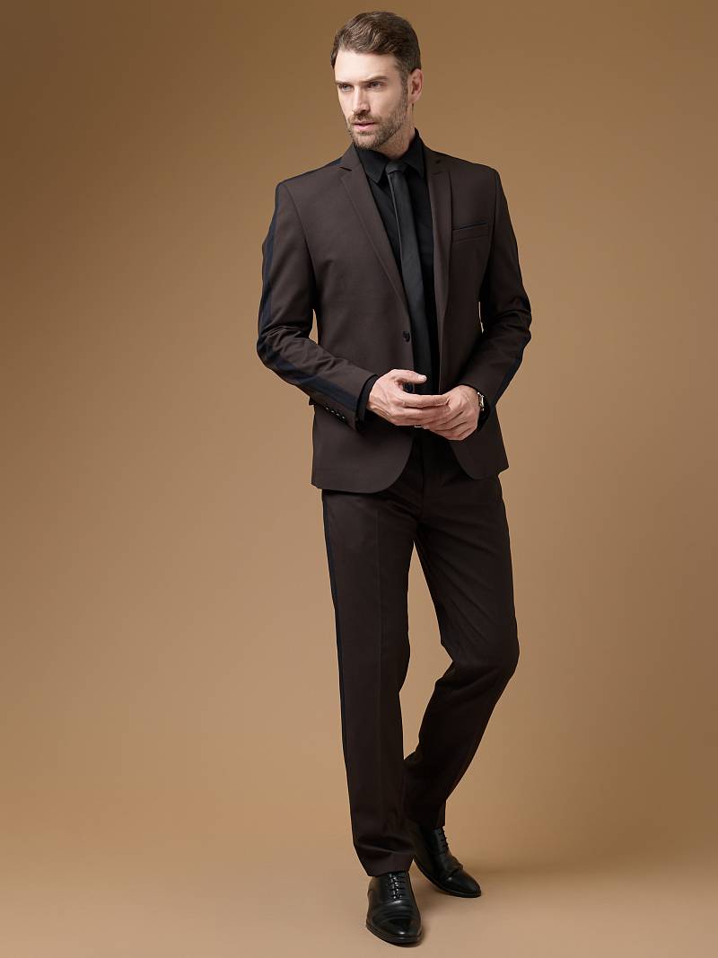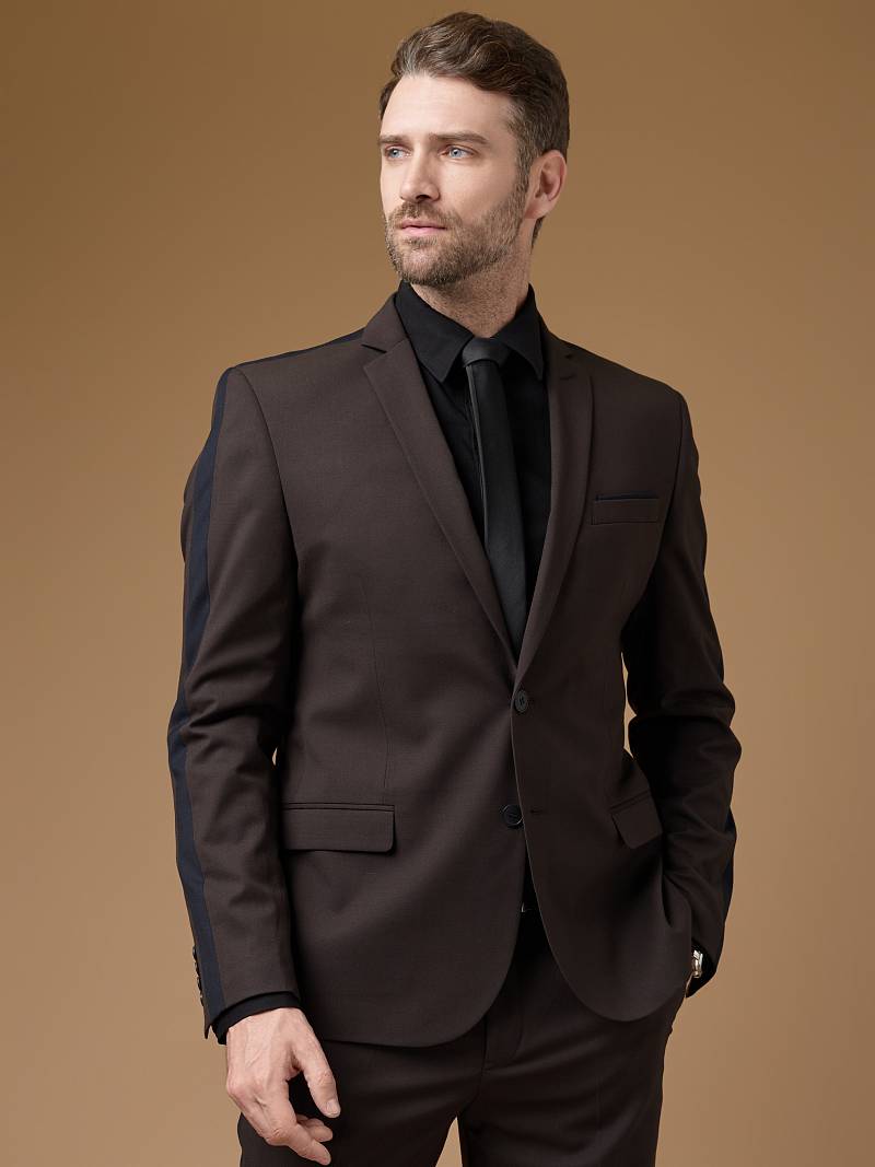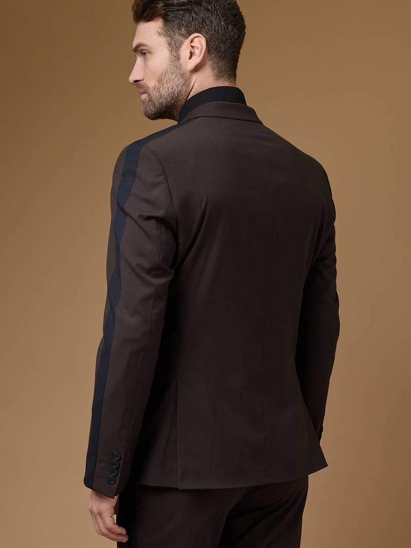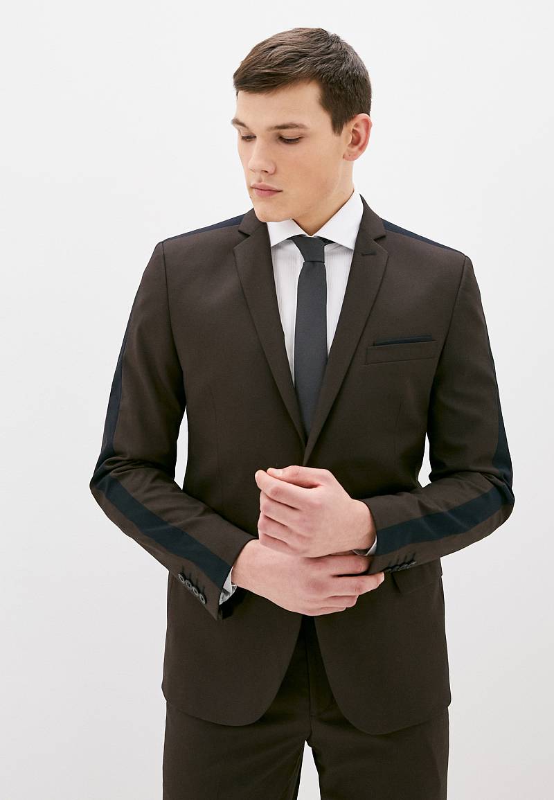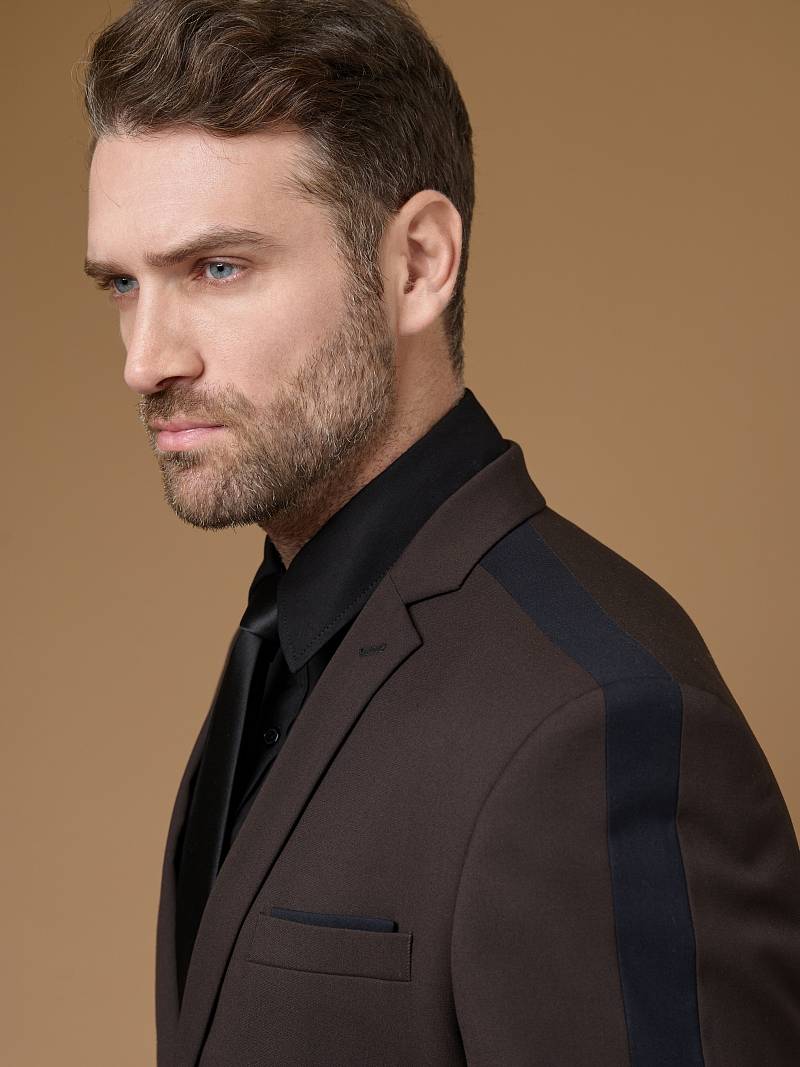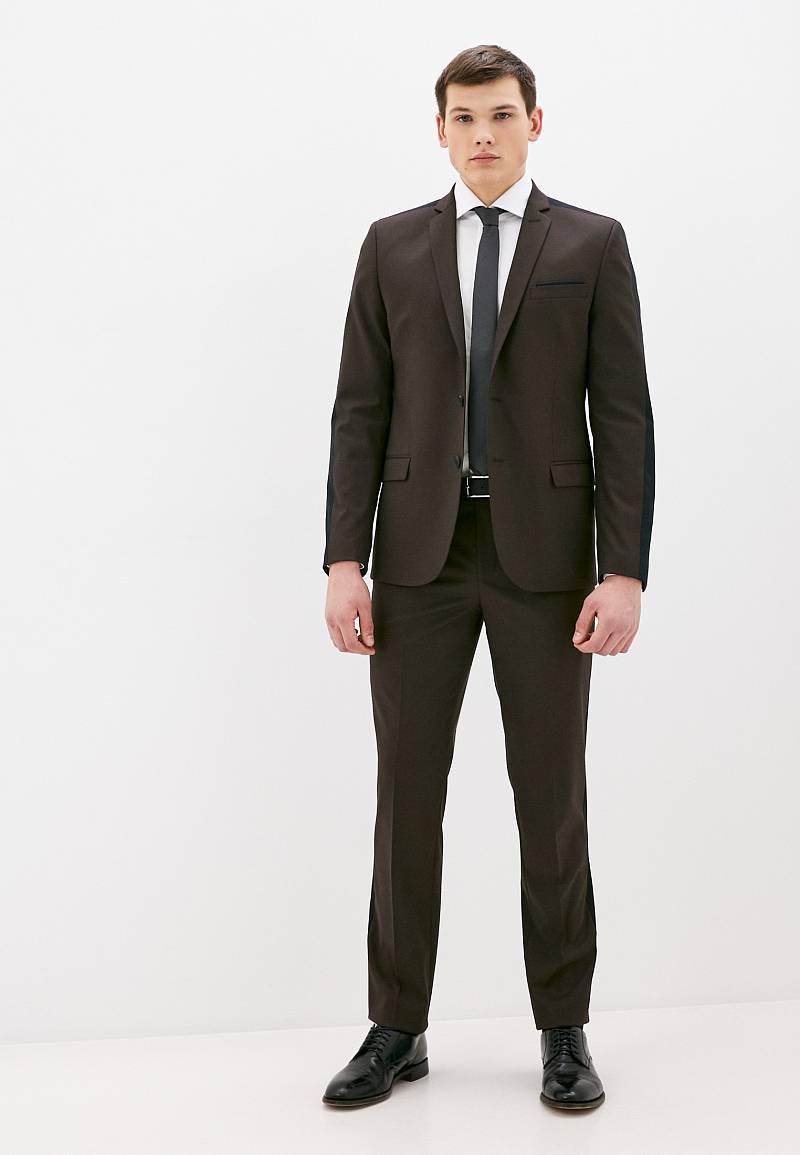 Костюм двойка Slim fit. Пиджак на две пуговицы, с боковыми и нагрудным карманами, по спинке две шлицы. Брюки без защипов в боковыми и одним задним карманом. По плечвому шву, середине рукава и боковым швам брюк идут отделочные вставки.