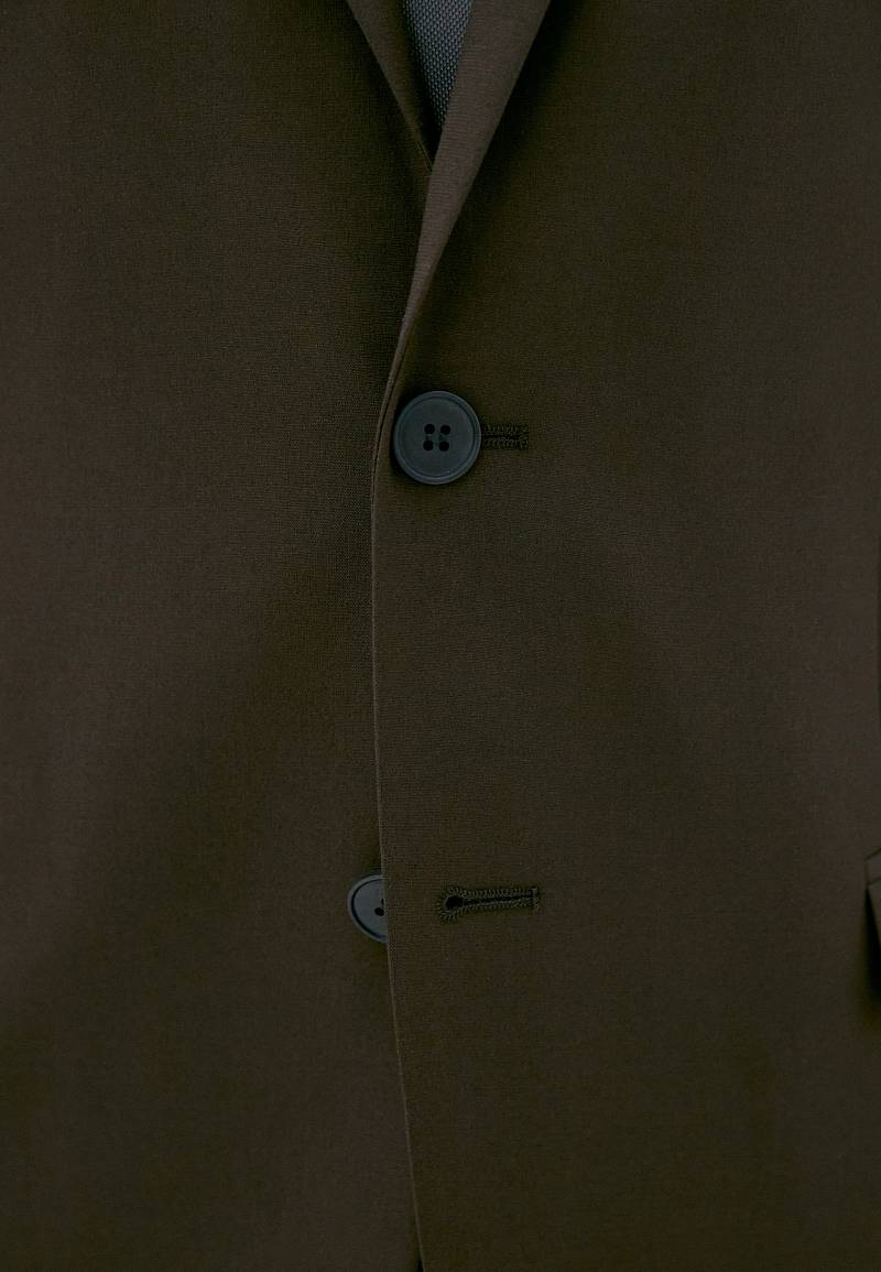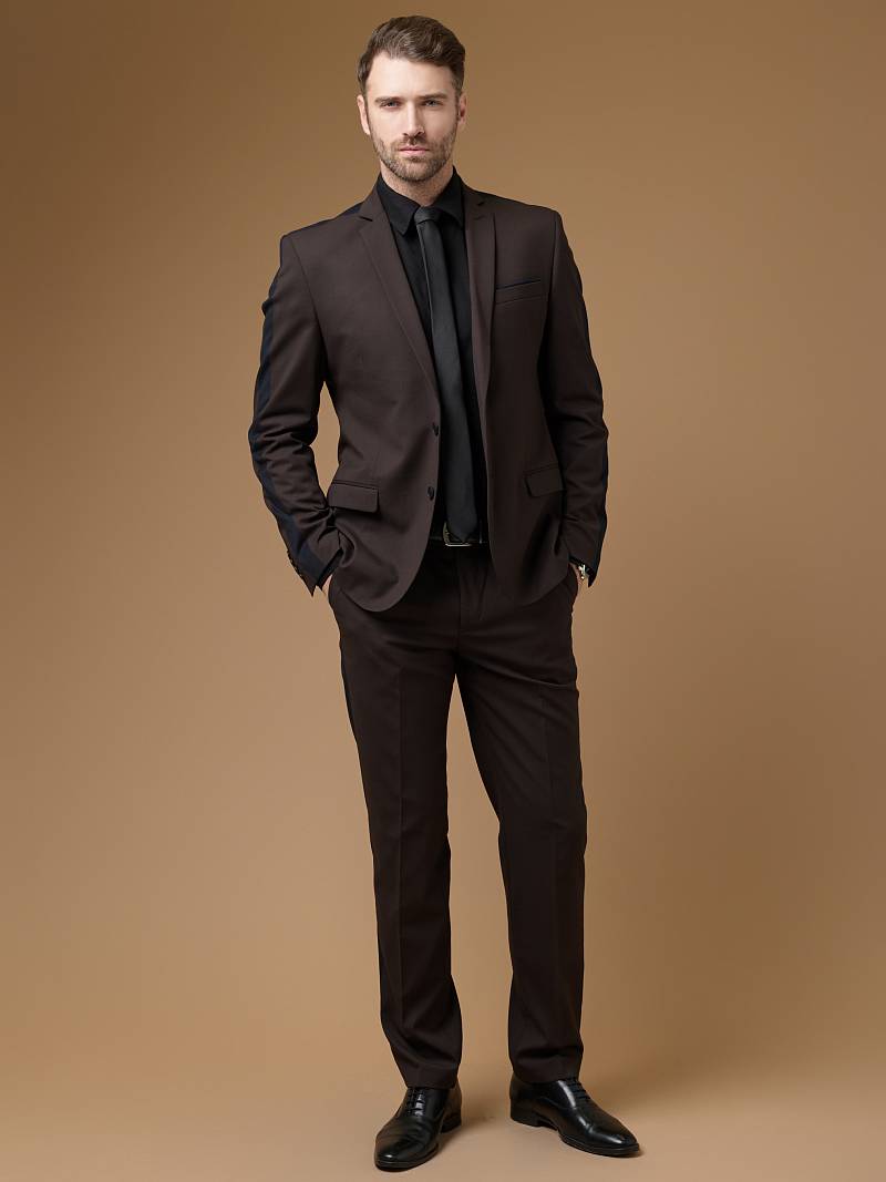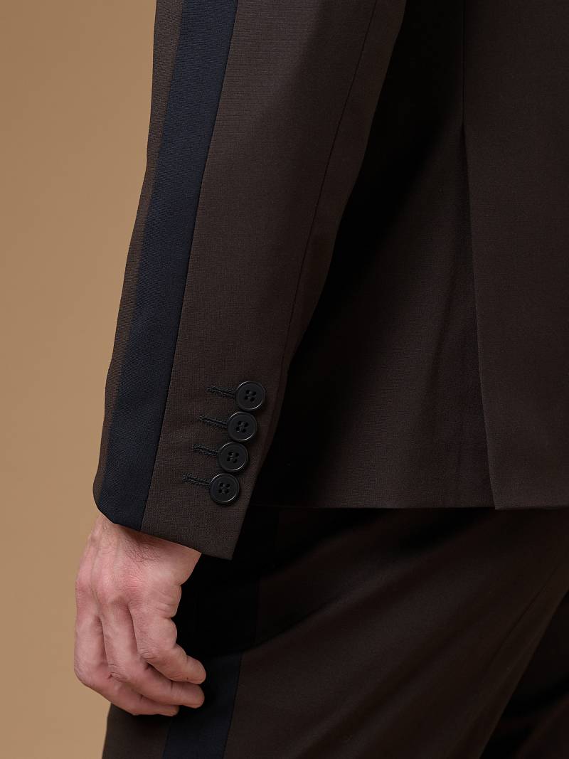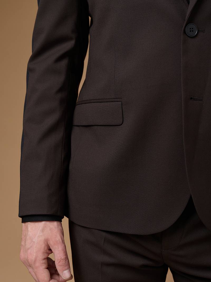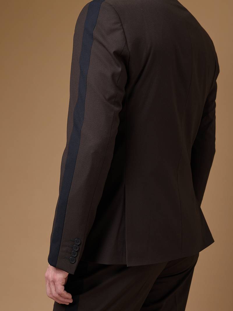 Костюм двойка Slim fit. Пиджак на две пуговицы, с боковыми и нагрудным карманами, по спинке две шлицы. Брюки без защипов в боковыми и одним задним карманом. По плечвому шву, середине рукава и боковым швам брюк идут отделочные вставки.
