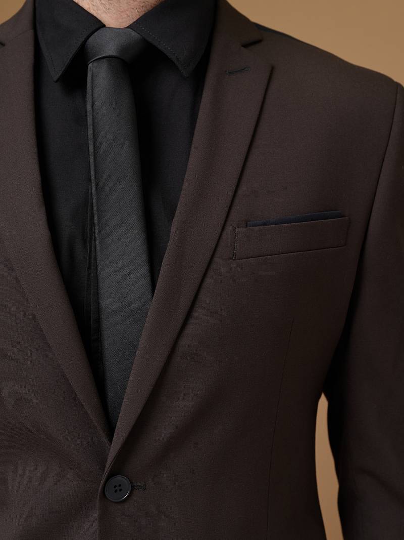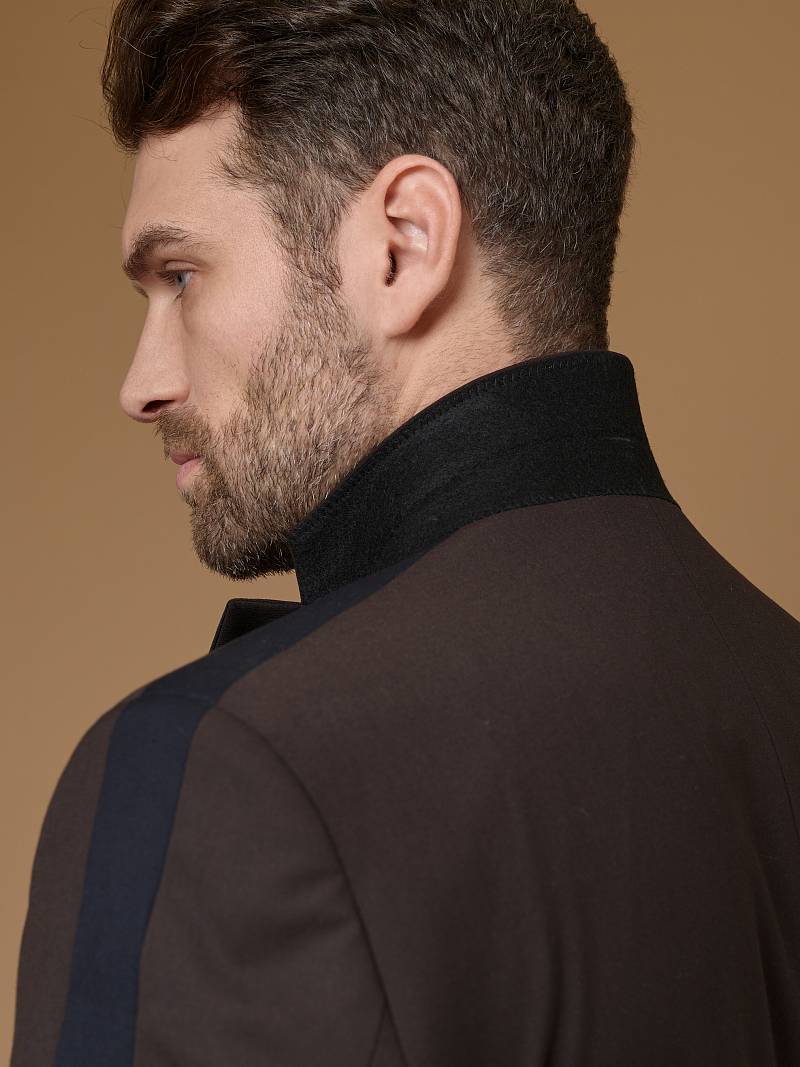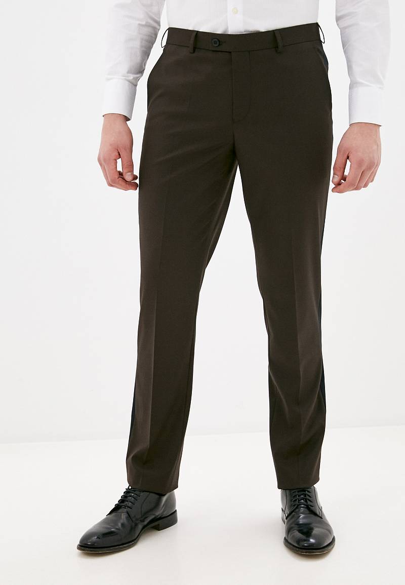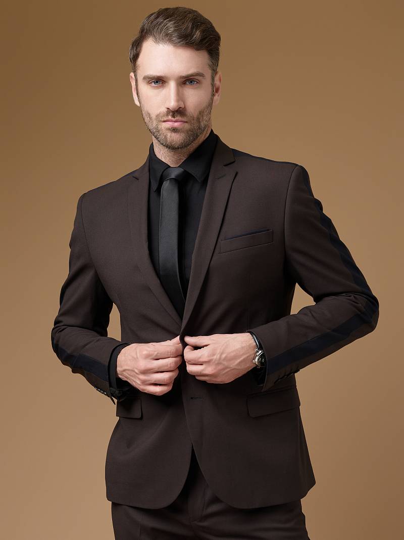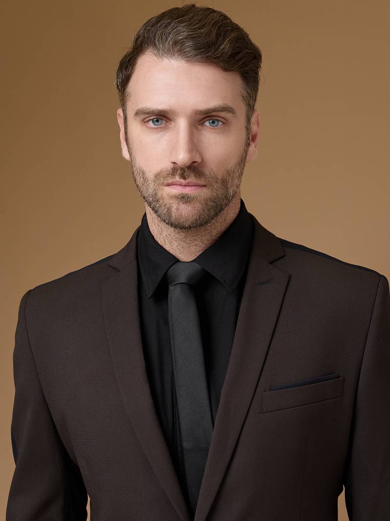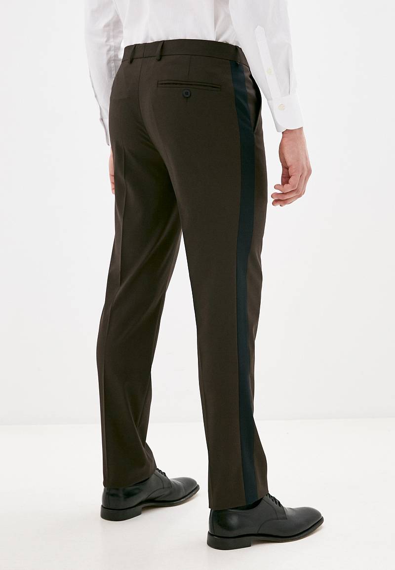 Костюм двойка Slim fit. Пиджак на две пуговицы, с боковыми и нагрудным карманами, по спинке две шлицы. Брюки без защипов в боковыми и одним задним карманом. По плечвому шву, середине рукава и боковым швам брюк идут отделочные вставки.