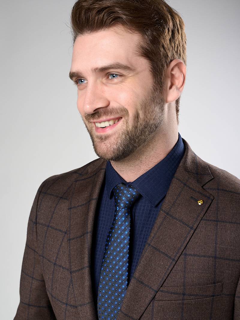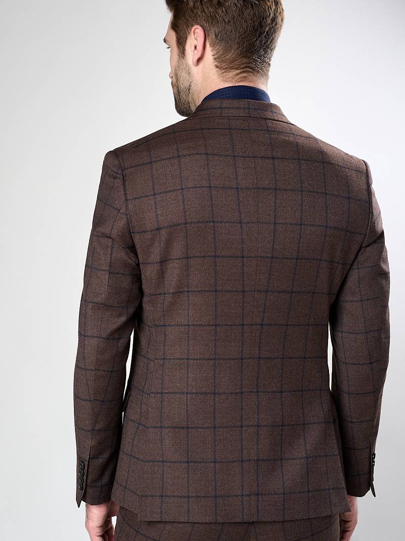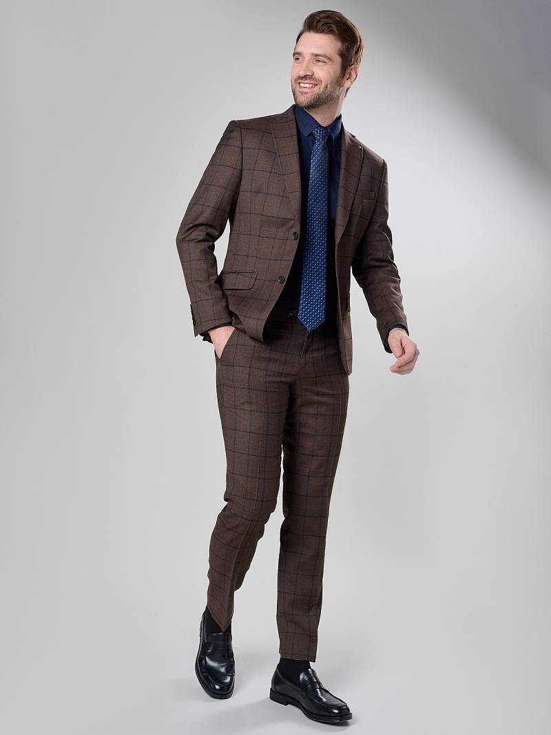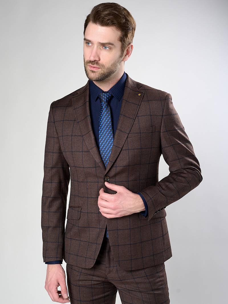 Классический костюм двойка Slim fit. Пиджак на две пуговицы, с боковыми и нагрудным карманами, по спинке две шлицы. Брюки без защипов с боковыми и одним задним карманом.