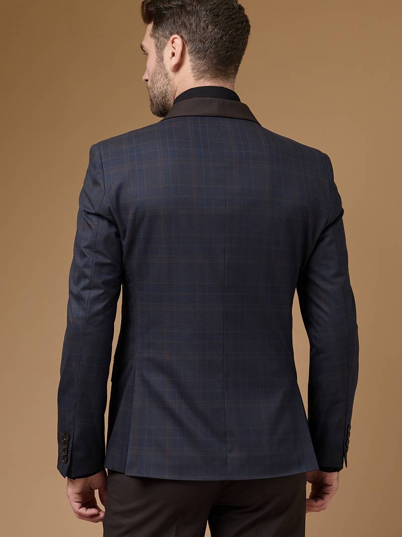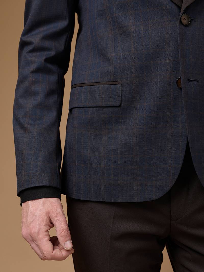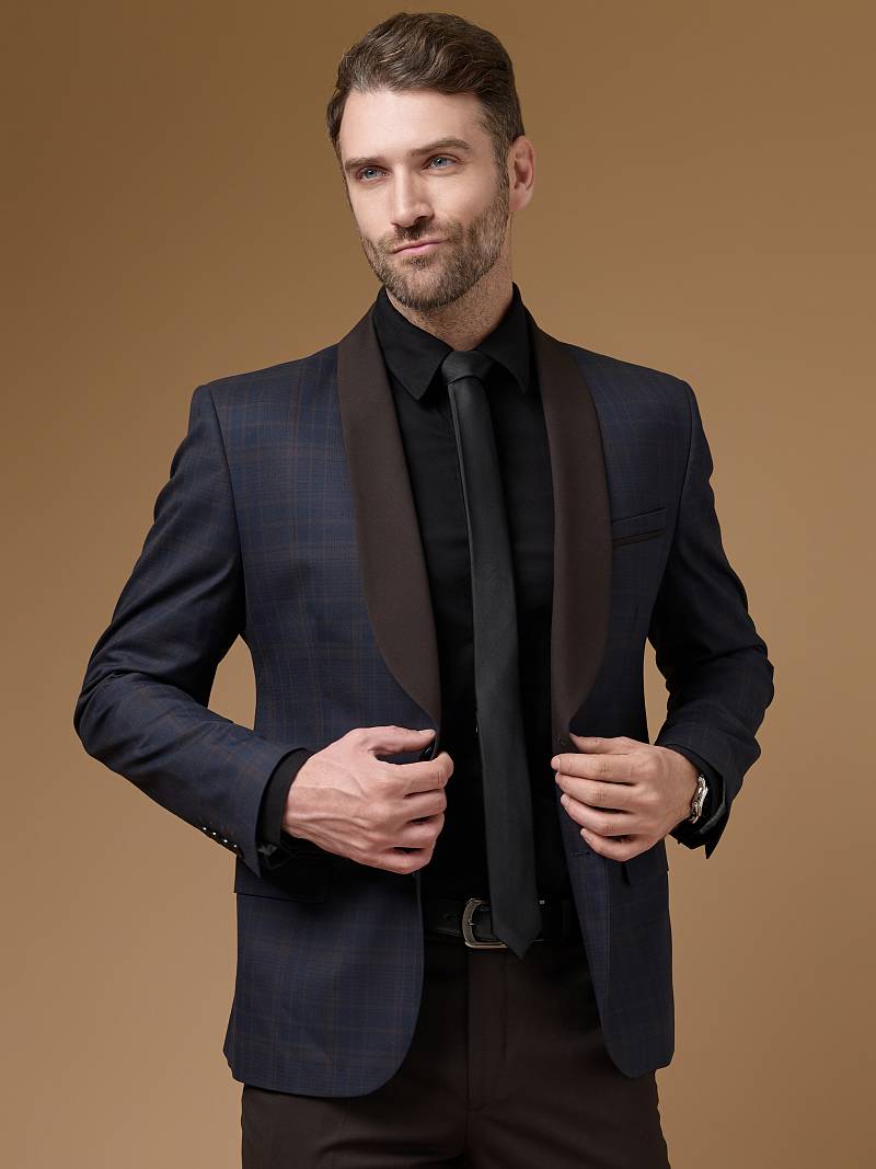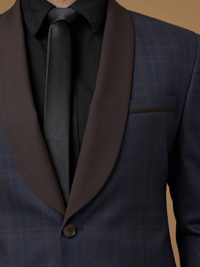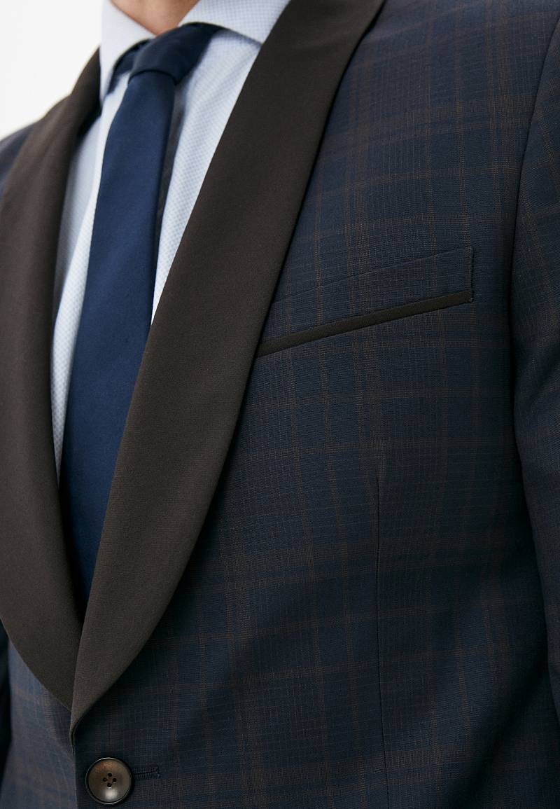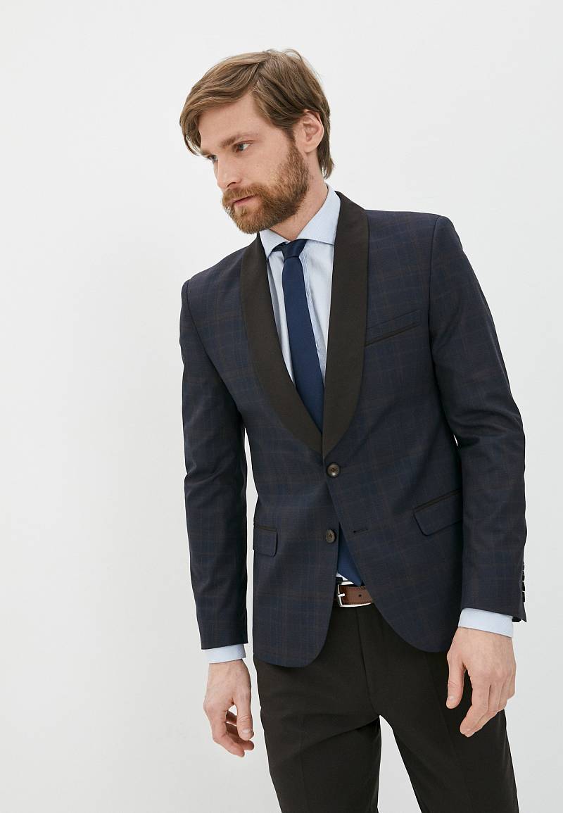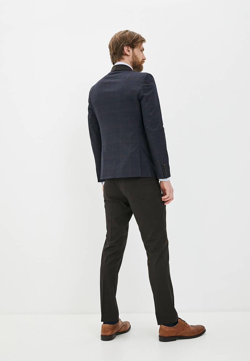 Классический костюм Slim fit. Пиджак с воротником-шалька на две пуговицы, с боковыми и нагрудным карманами, по спинке две шлицы, в нагрудном кармане расположен декоративный платок. Брюки без защипов с боковыми и одним задним карманом. Брюки и воротник пиджака выполнены из ткани компаньона.