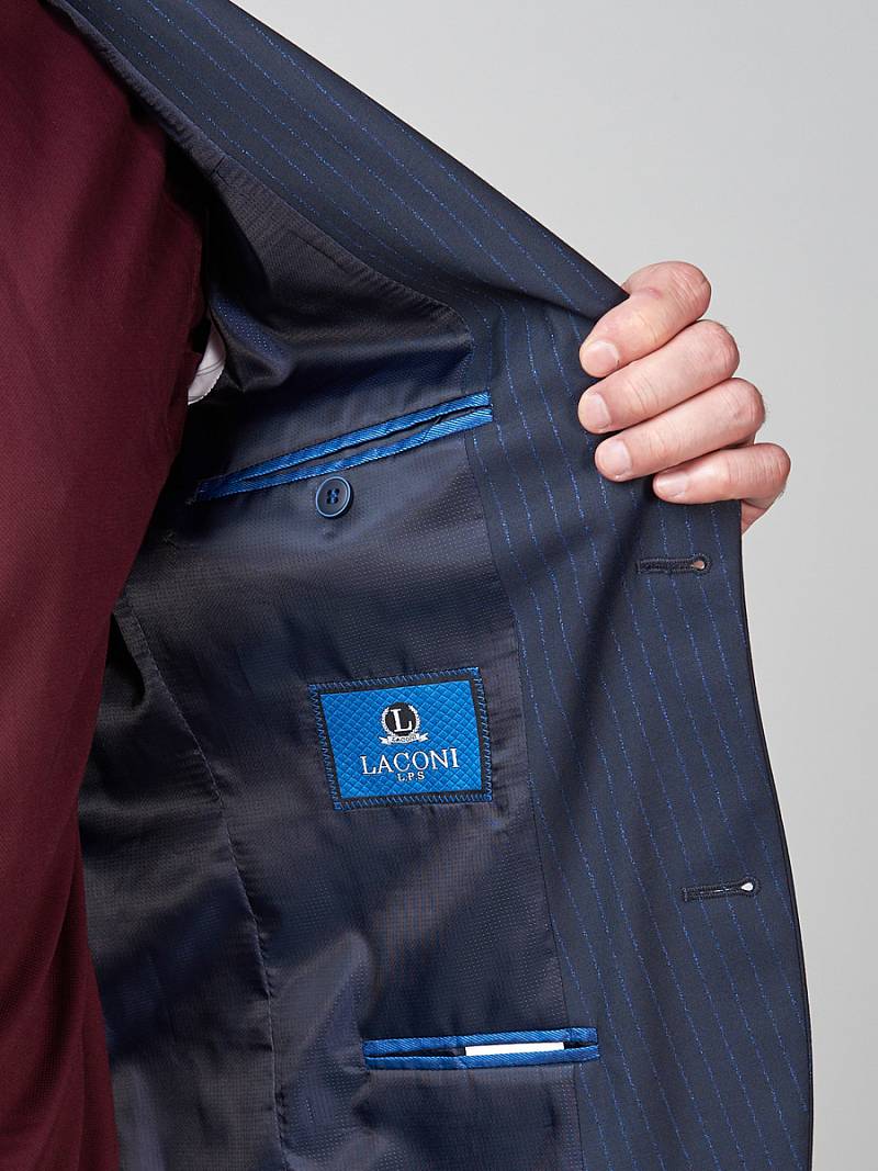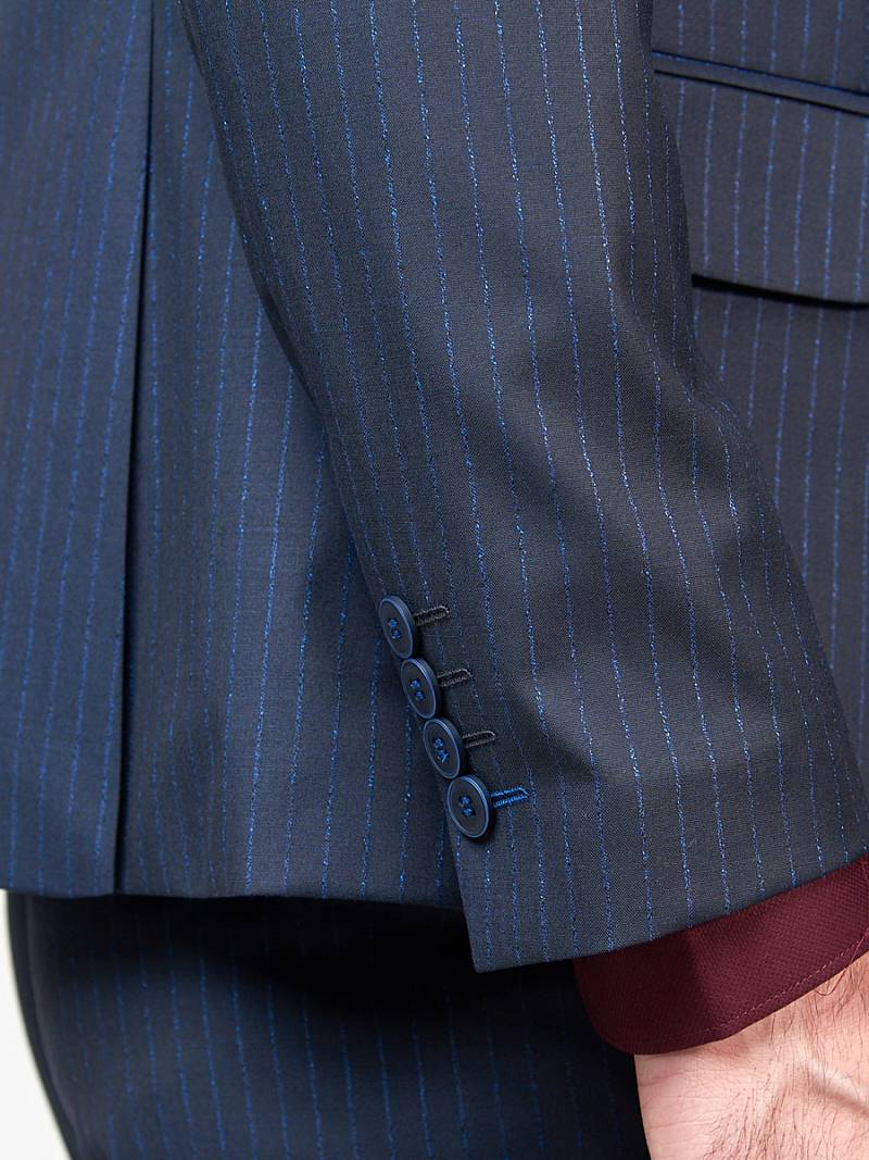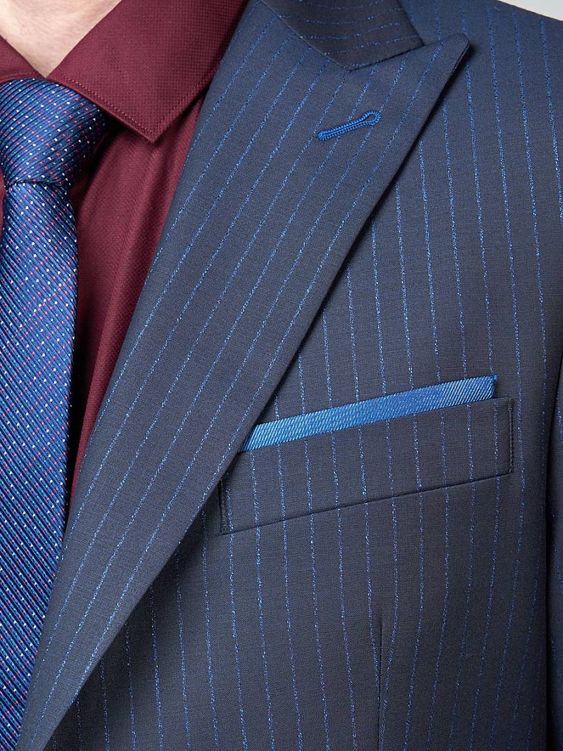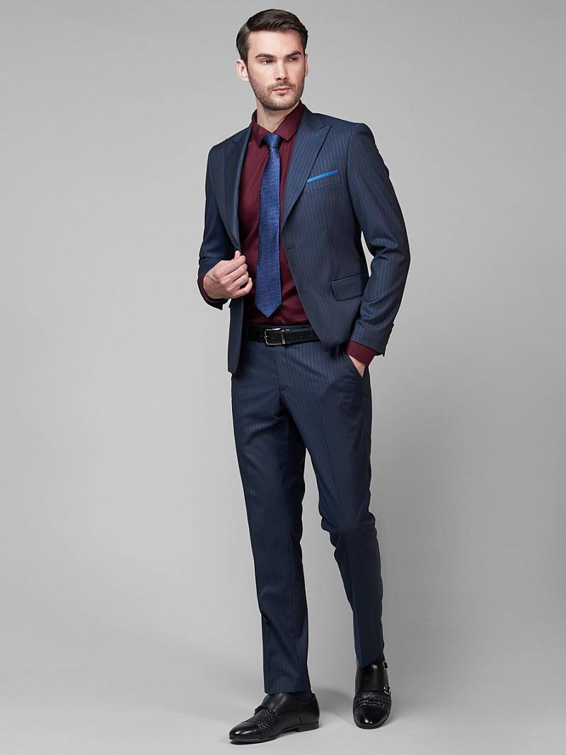 Классический костюм двойка Slim fit . Пиджак с острым лацканом, на две пуговицы, с боковыми и нагрудным карманами, по спинке две шлицы. Брюки без защипов с боковыми и одним задним карманом.