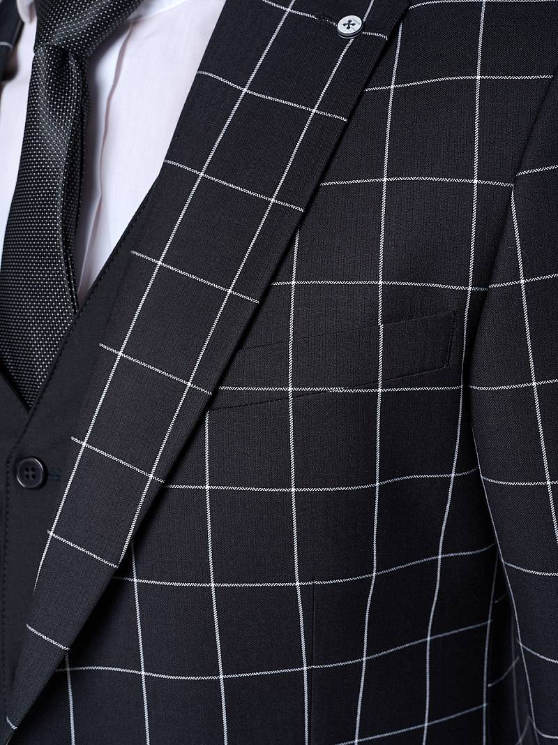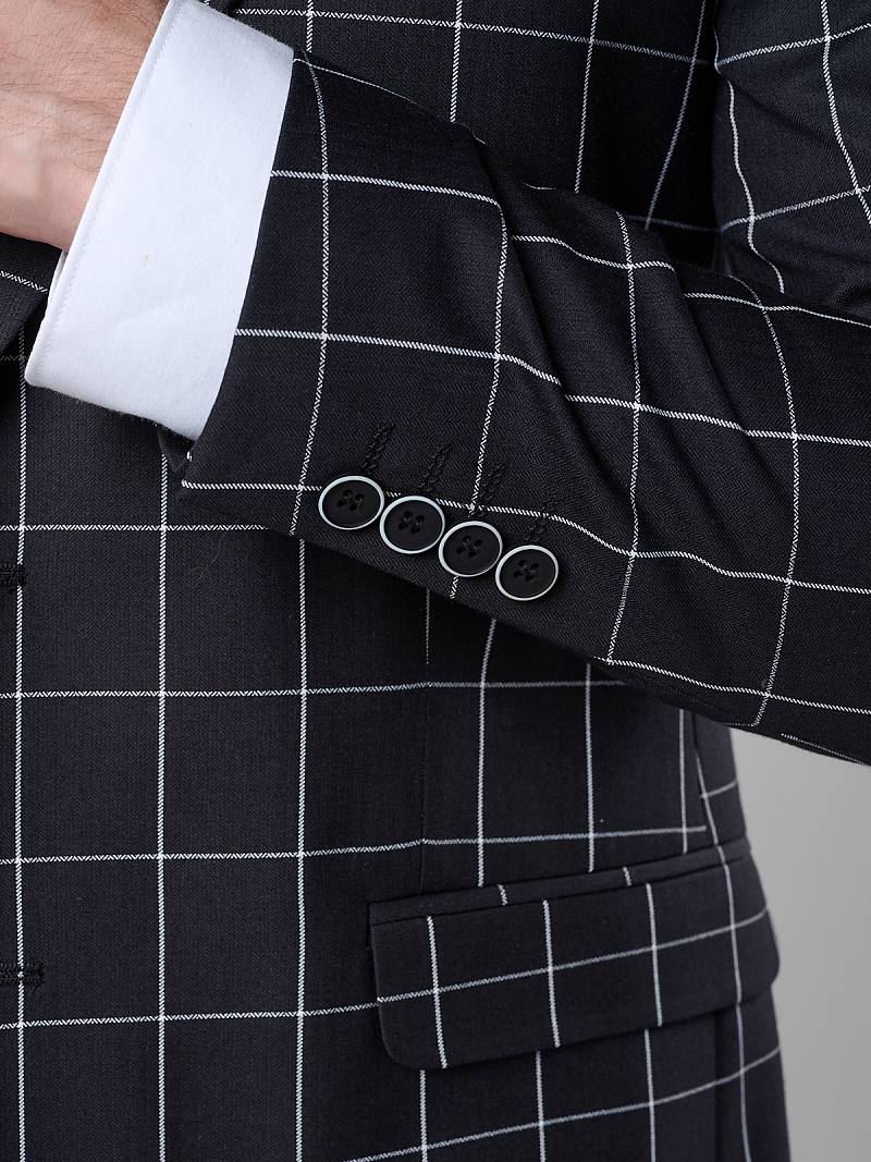 Slim fit, две пуговицы, две шлицы. Контрастные петли, декоративная пуговица на лацкане, нагрудный платок.
