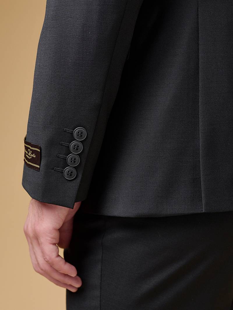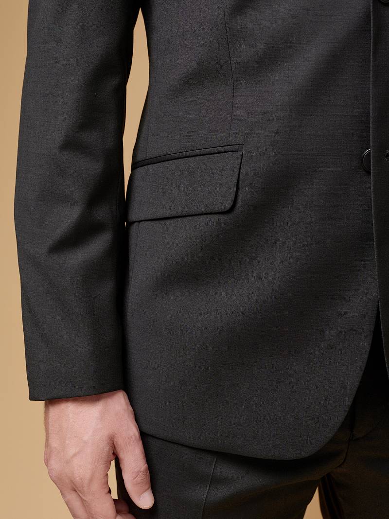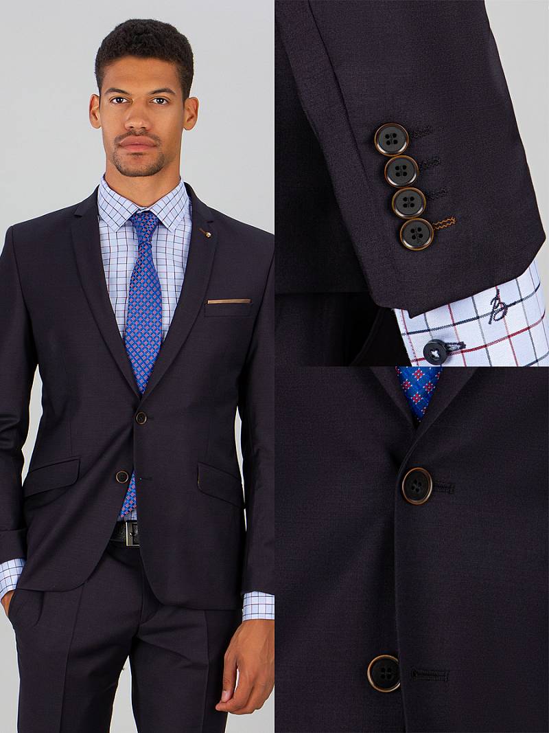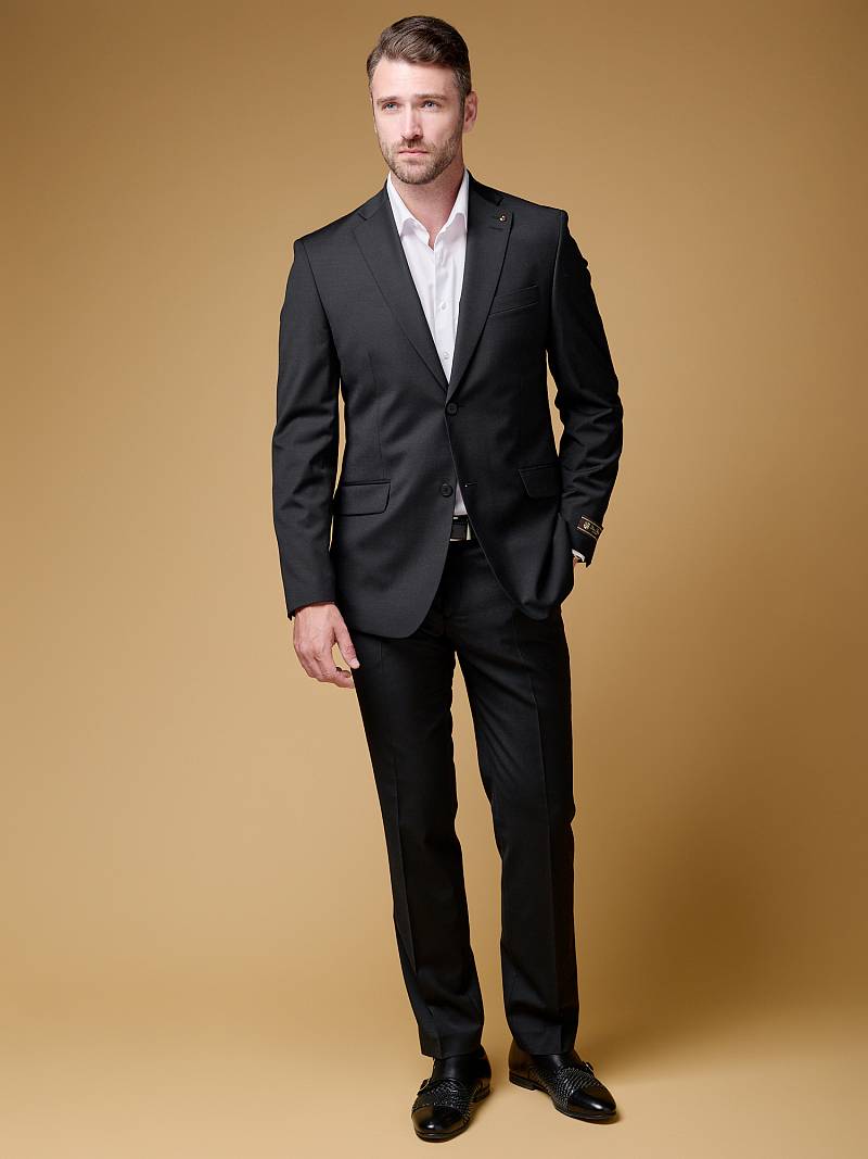 Классический костюм двойка Slim fit (ПРИЛЕГАЮЩИЙ СИЛУЭТ), рекомендуется брать на размер больше.Пиджак однобортный на две пуговицы, с двумя боковыми карманами с клапанами и нагрудной листочкой. Рукава втачные, двухшовные со шлицей и четырьмя декоративными пуговицами. По спинке расположены две шлицы. Пиджак на подкладке, с двумя внутренними карманами. Брюки без защипов, с боковыми наклонными карманами и двумя задними карманами «в рамку». Передние половинки на подкладке. Верхний срез брюк обработан поясом с корсажной лентой и шлевками под ремень. Застежка обработана на тесьму-молнию, с петлей-пуговицей на поясе и усилен металлическим крючком.