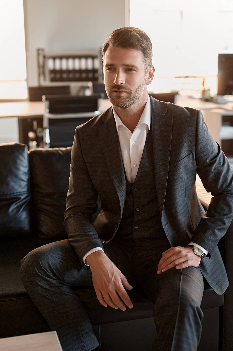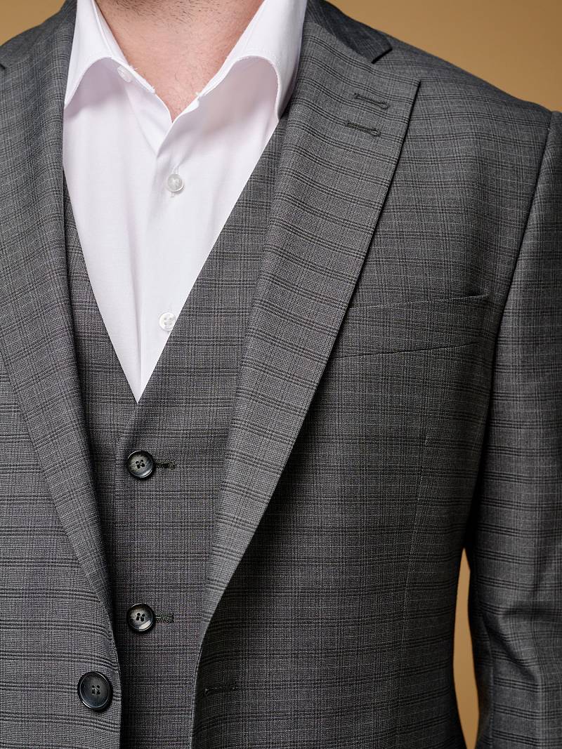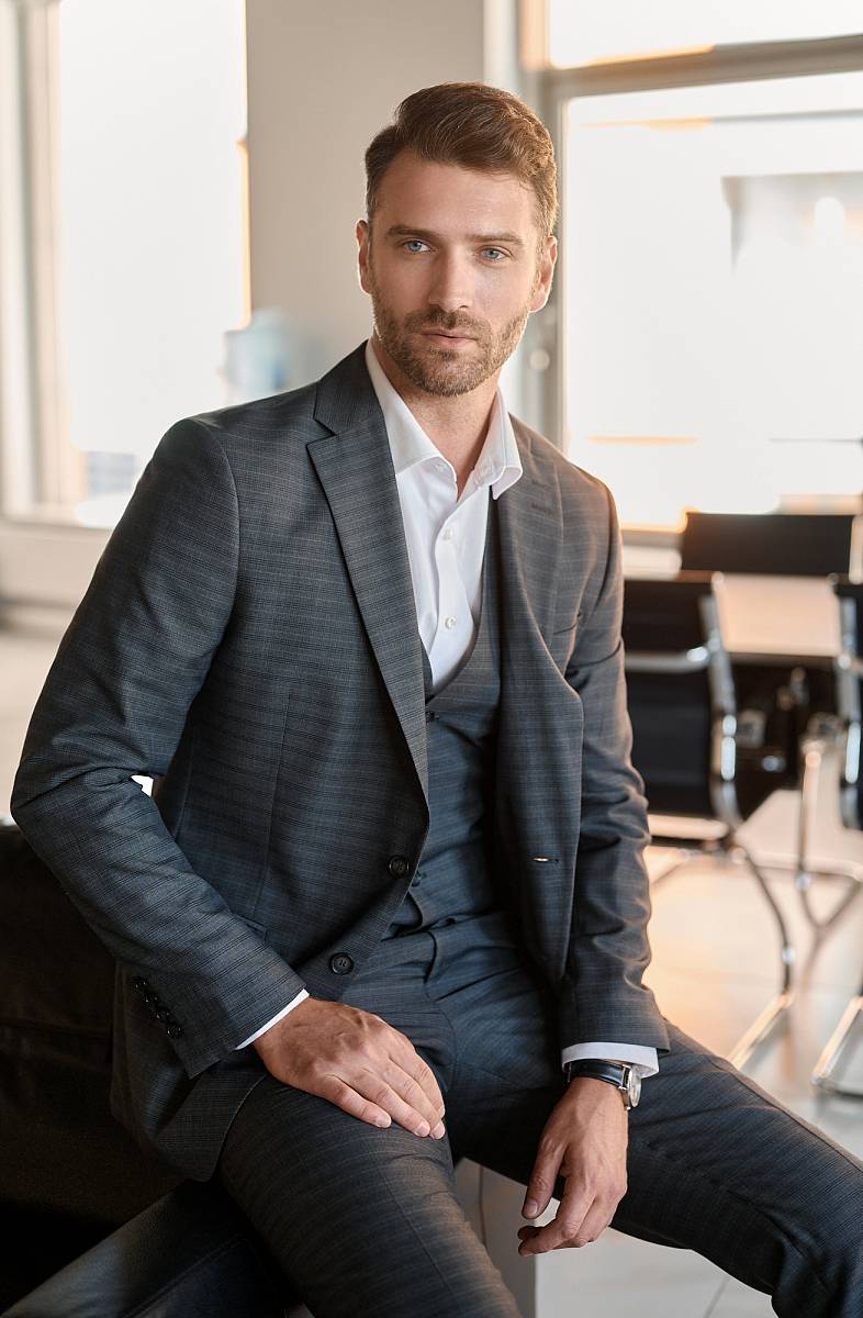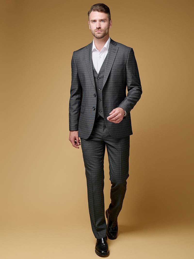 Классический костюм тройка Slim fit (ПРИЛЕГАЮЩИЙ СИЛУЭТ), рекомендуется брать на размер больше.Пиджак однобортный на две пуговицы, с двумя боковыми карманами с клапанами и нагрудной листочкой. Рукава втачные, двухшовные со шлицей и четырьмя декоративными пуговицами. По спинке расположены две шлицы. Пиджак на подкладке, с двумя внутренними карманами. Брюки без защипов, с боковыми наклонными карманами и двумя задними карманами «в рамку». Передние половинки на подкладке. Верхний срез брюк обработан поясом с корсажной лентой и шлевками под ремень. Застежка обработана на тесьму-молнию, с петлей-пуговицей на поясе и усилен металлическим крючком. Жилет с двумя боковыми карманами, по спинке расположен хлястик для регулировки объема в области талии.