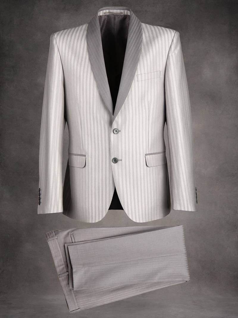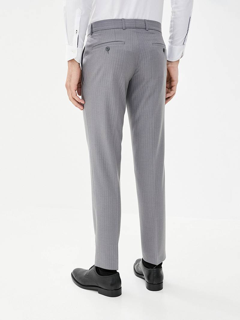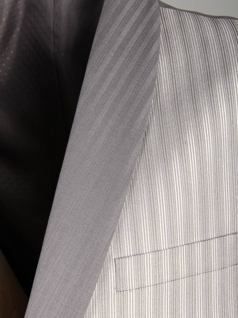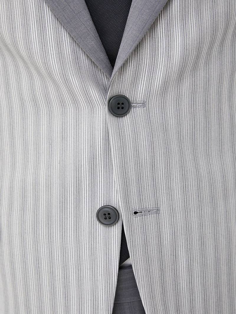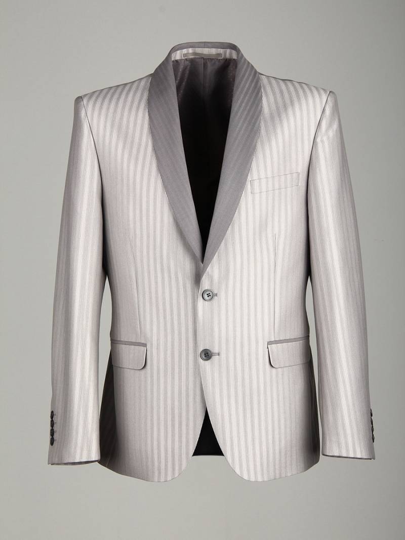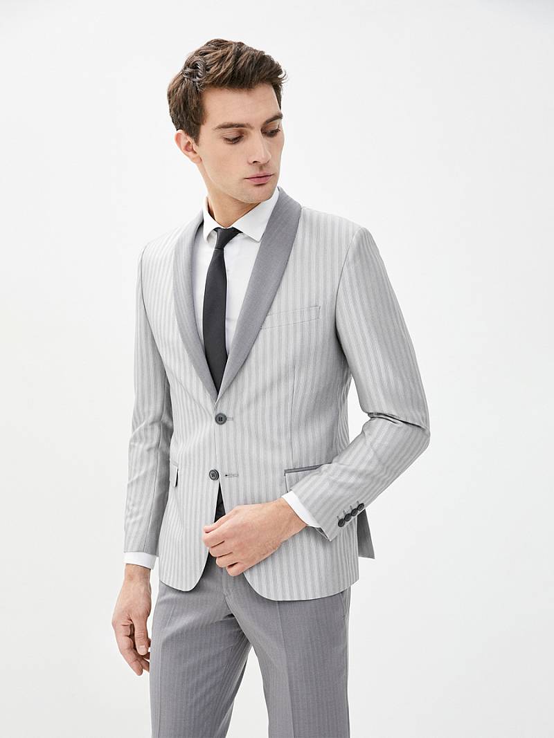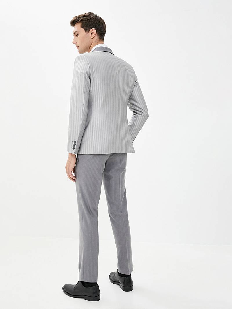 Костюм мужской двойка. Slim fit, 2 пуговицы, 2 шлицы, Пиджак из ткани с рисунком "полоска". Брюки из темной ткани "компаньон. Также из ткани компаньон - выполнена шалька пиджака и рамки карманов.