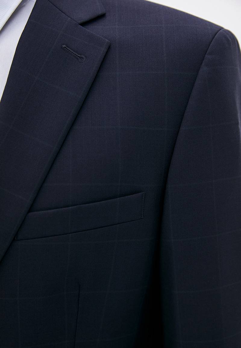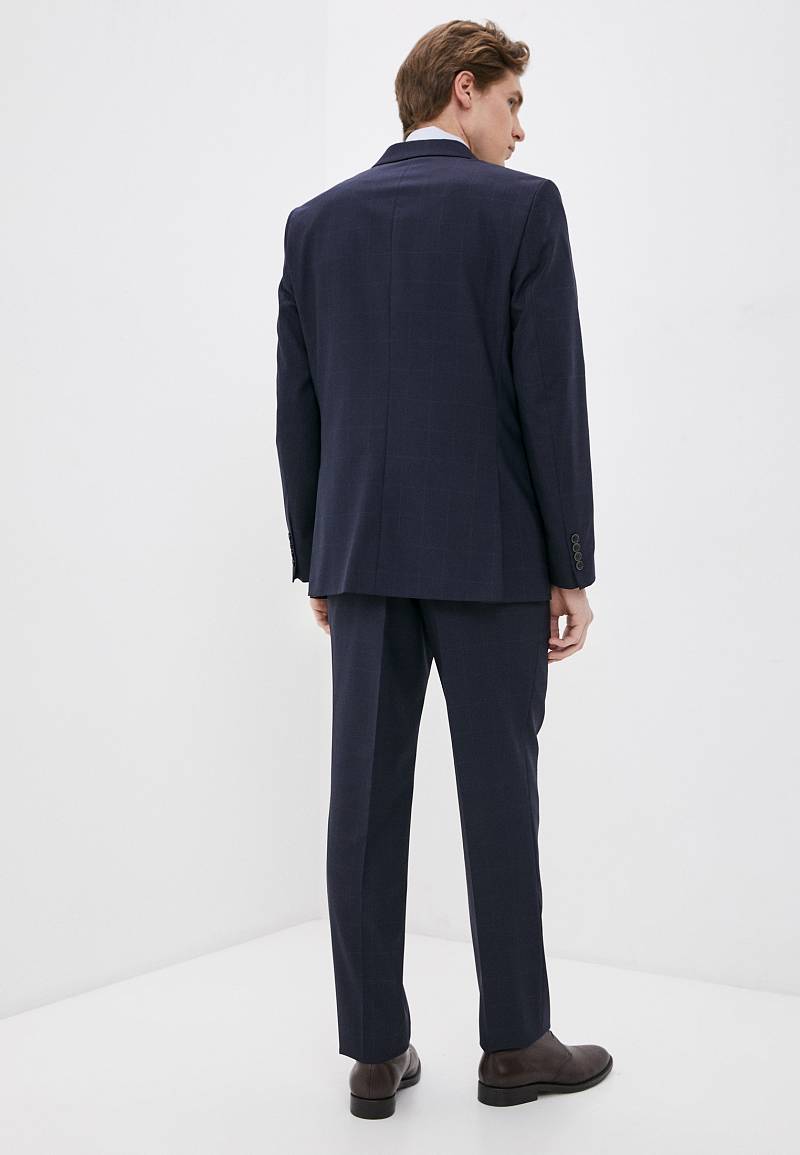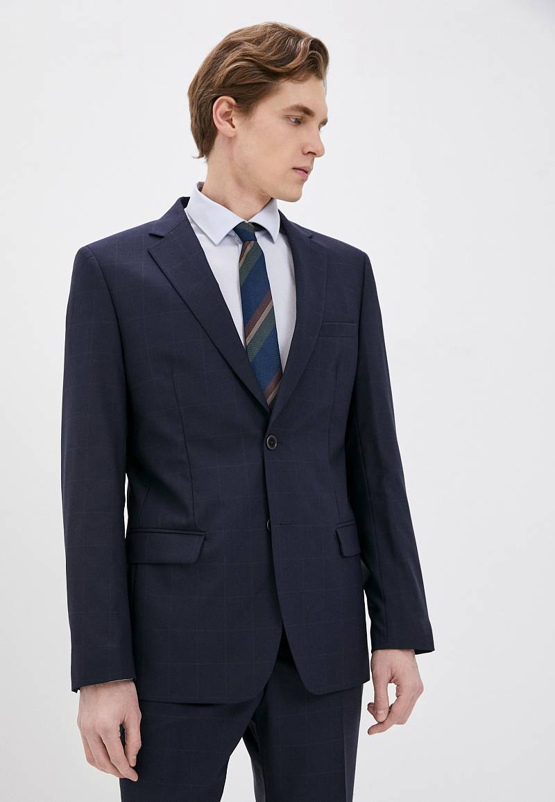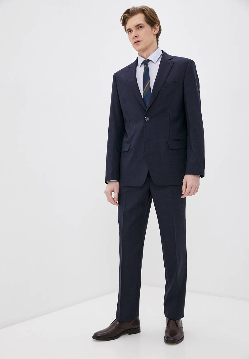 Классический костюм двойка Classic fit. Пиджак на две пуговицы, с боковыми и нагрудным карманами, по спинке две шлицы. Брюки без защипов с боковыми и одним задним карманом.