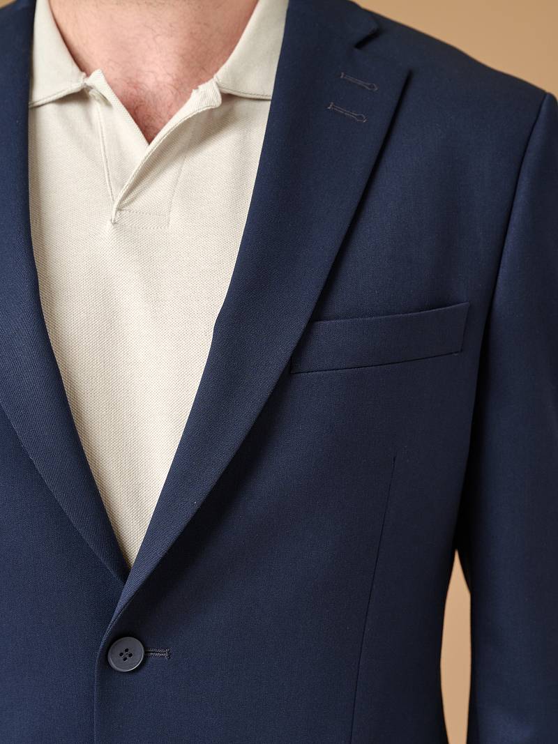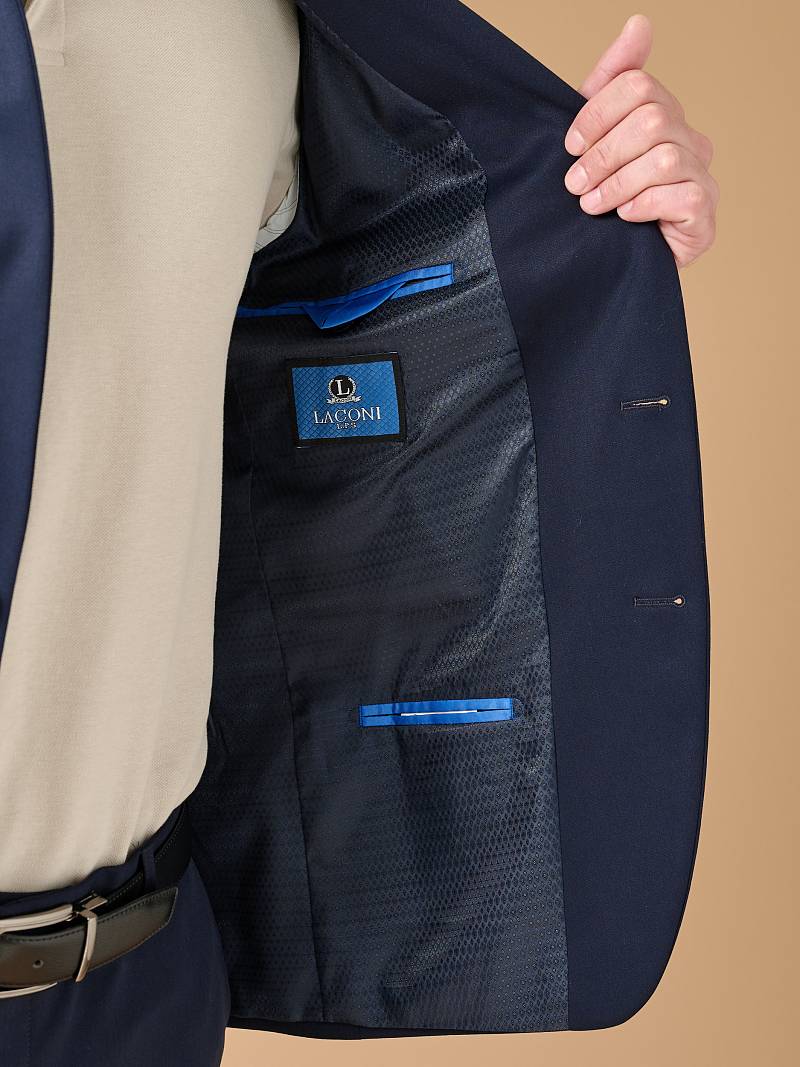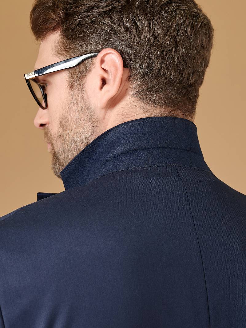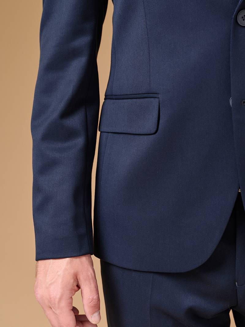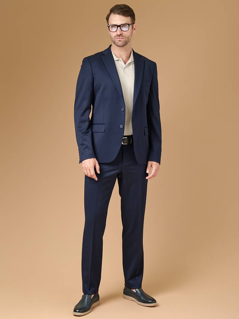 Классический костюм двойка Classic fit (ПОЛУПРИЛЕГАЮЩИЙ СИЛУЭТ). Пиджак однобортный на две пуговицы, с двумя боковыми карманами с клапанами и нагрудной листочкой. Рукава втачные, двухшовные со шлицей и четырьмя декоративными пуговицами. По спинке расположены две шлицы. Пиджак на подкладке, с двумя внутренними карманами. Брюки без защипов, с боковыми наклонными карманами и двумя задними карманами «в рамку». Передние половинки на подкладке. Верхний срез брюк обработан поясом с корсажной лентой и шлевками под ремень. Застежка обработана на тесьму-молнию, с петлей-пуговицей на поясе и усилен металлическим крючком.
