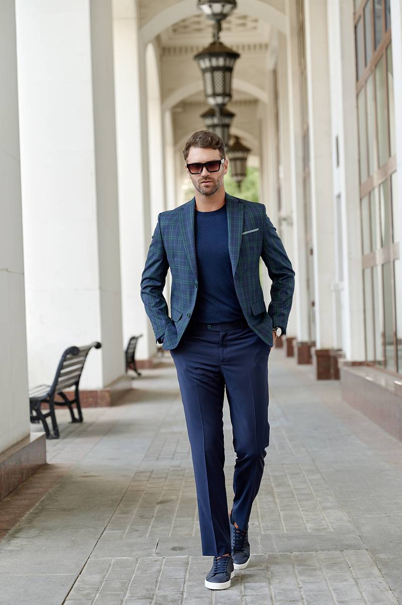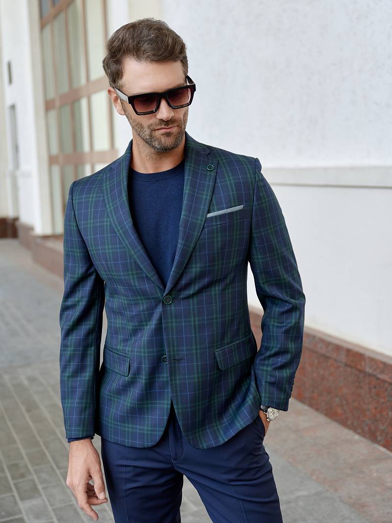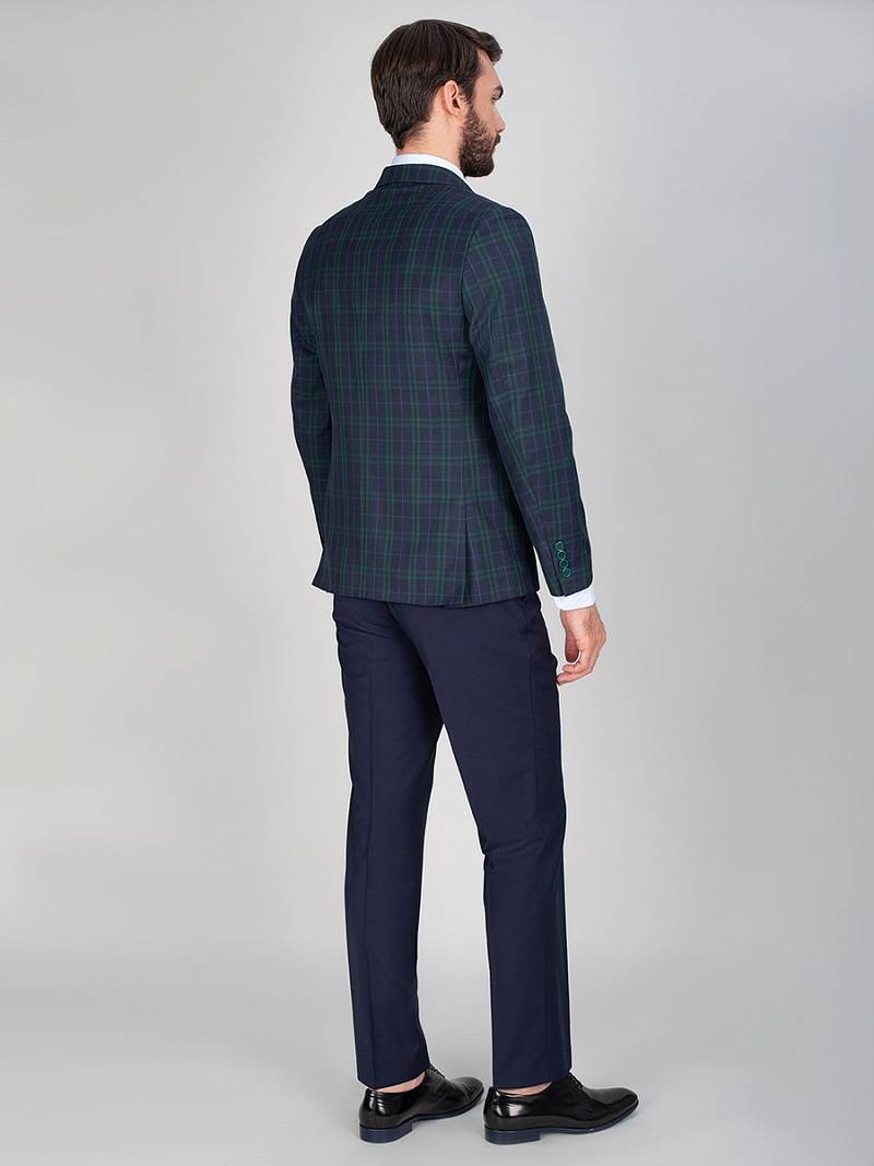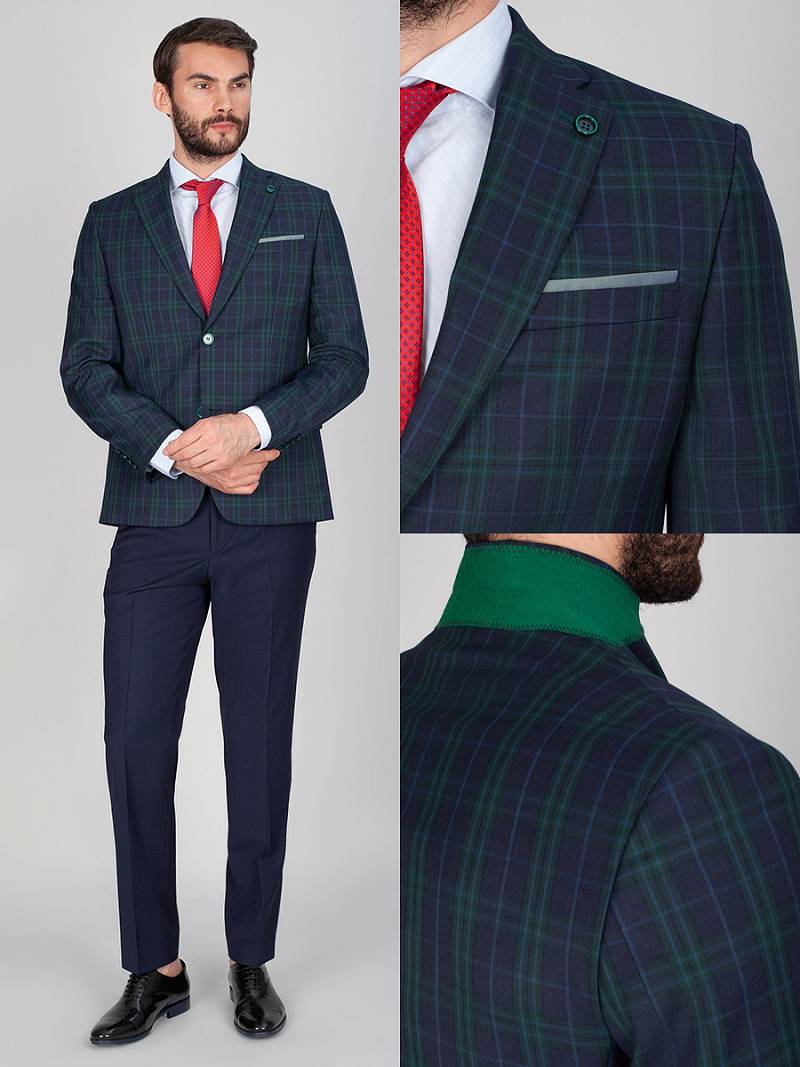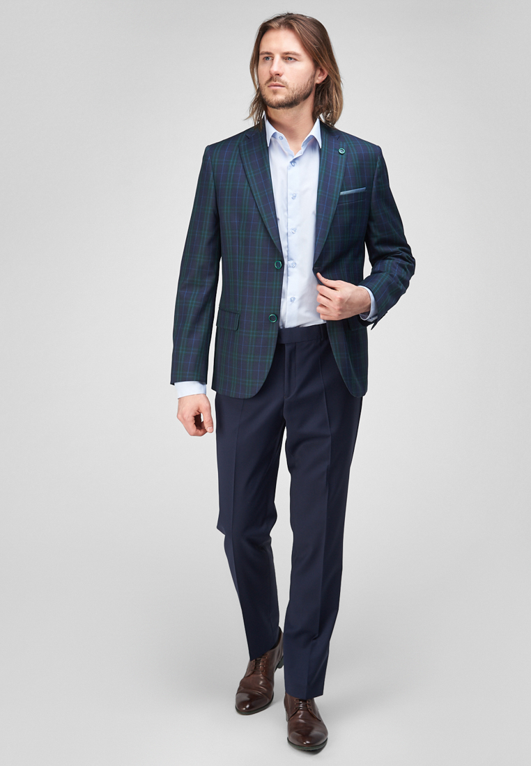 Классический костюм двойка Classic fit. Пиджак на две пуговицы, с боковыми и нагрудным карманами, по спинке две шлицы, в нагрудном кармане расположен декоративный платок. Брюки без защипов с боковыми и одним задним карманом, выполнены из ткани компаньона.