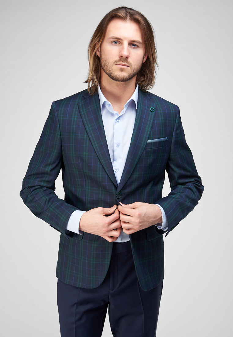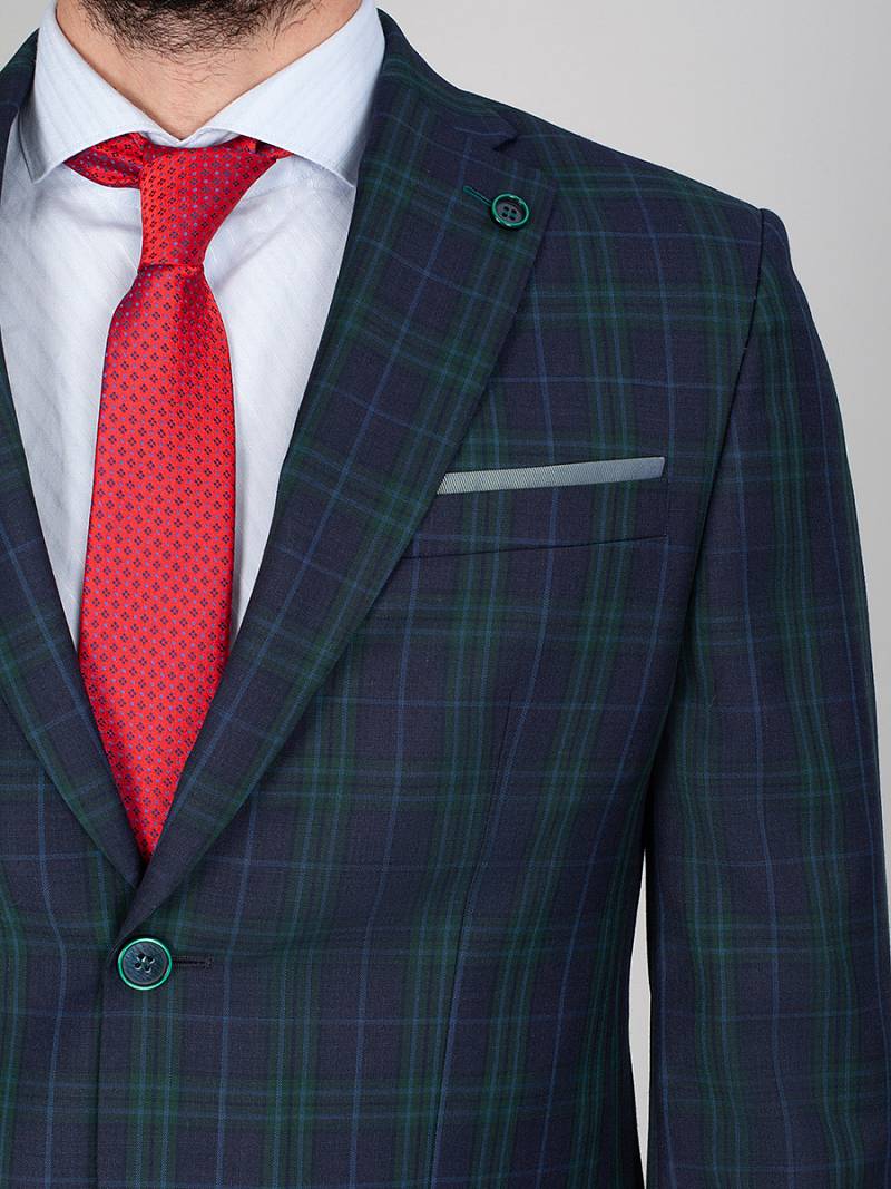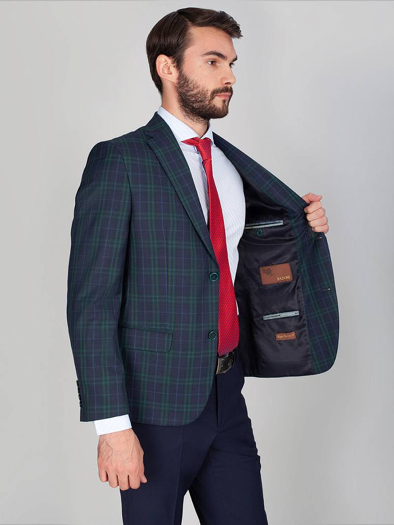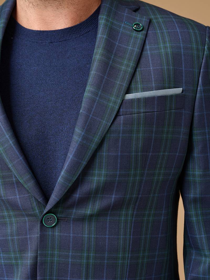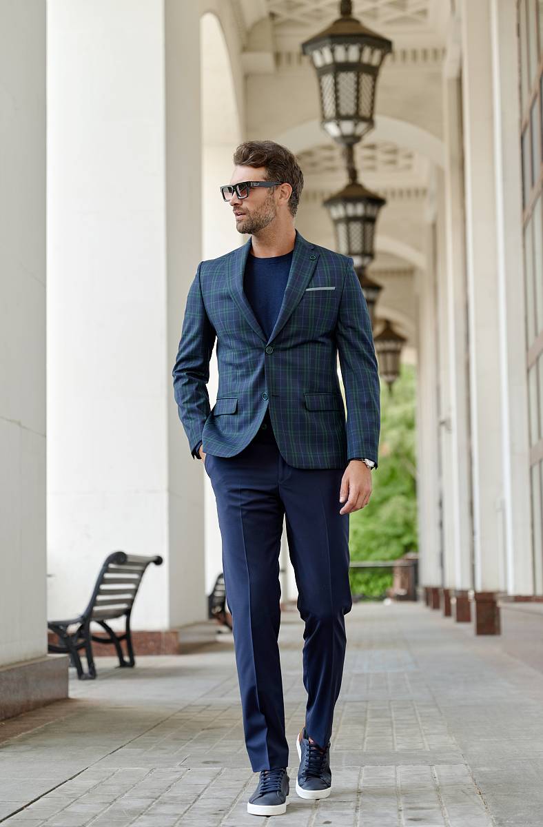 Классический костюм двойка Classic fit. Пиджак на две пуговицы, с боковыми и нагрудным карманами, по спинке две шлицы, в нагрудном кармане расположен декоративный платок. Брюки без защипов с боковыми и одним задним карманом, выполнены из ткани компаньона.