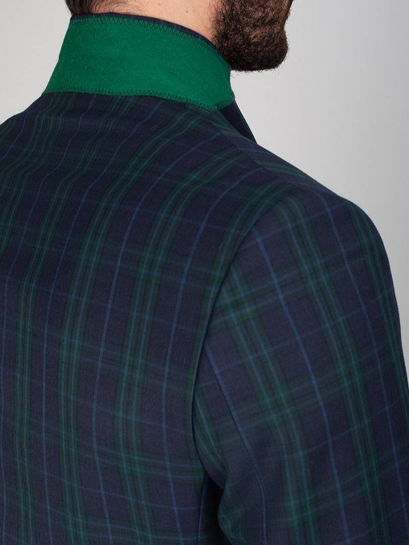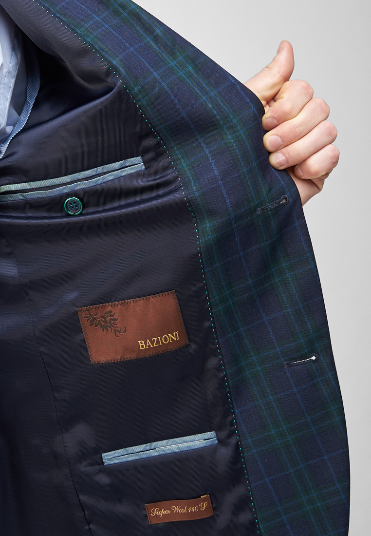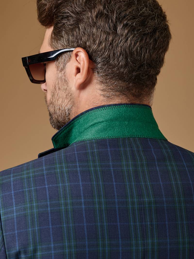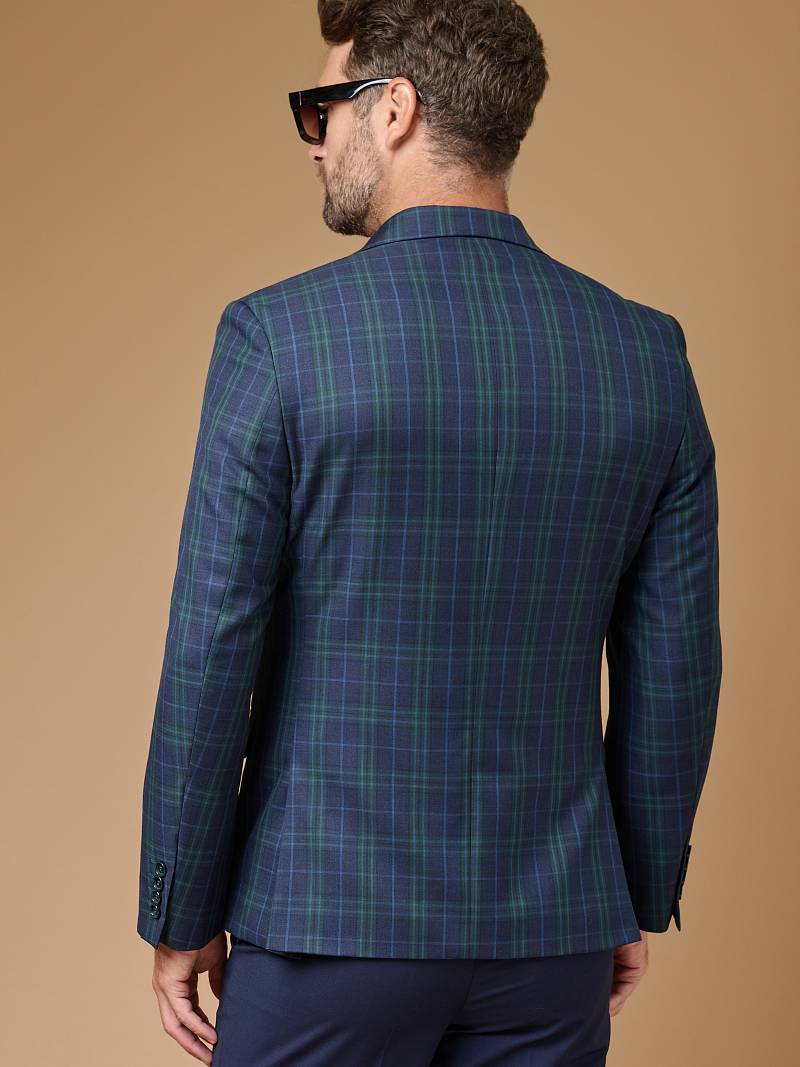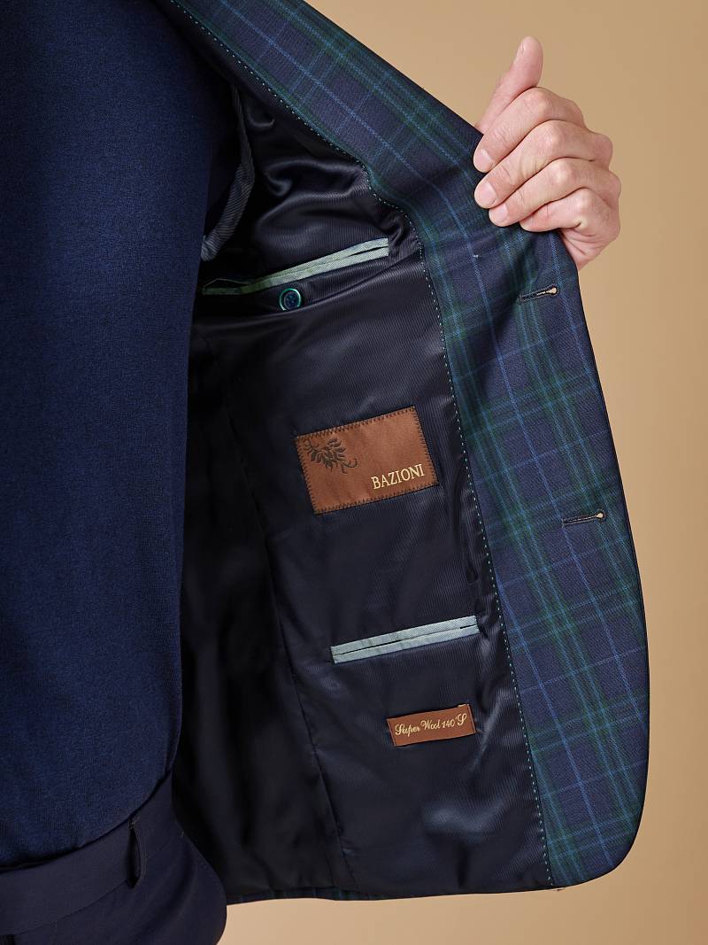 Классический костюм двойка Classic fit. Пиджак на две пуговицы, с боковыми и нагрудным карманами, по спинке две шлицы, в нагрудном кармане расположен декоративный платок. Брюки без защипов с боковыми и одним задним карманом, выполнены из ткани компаньона.