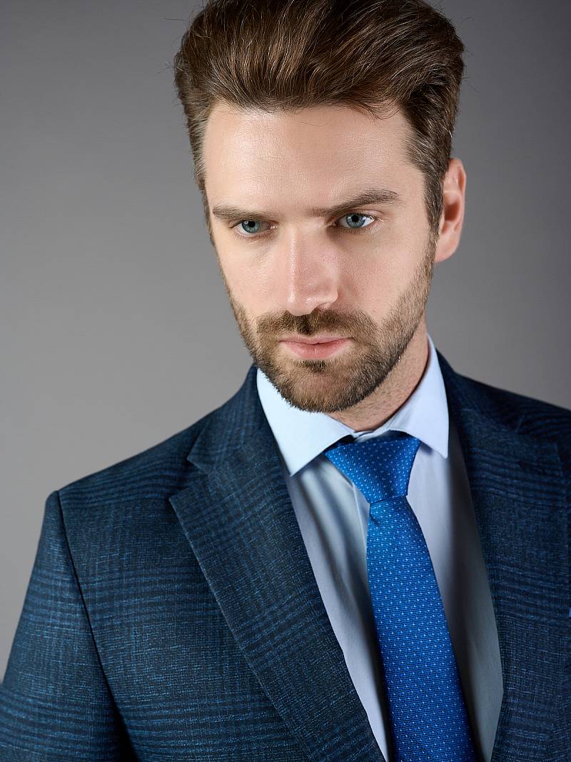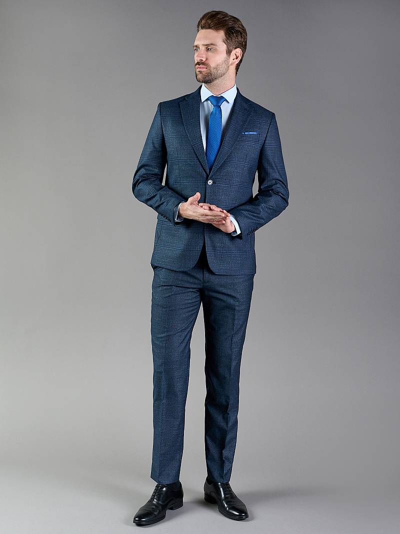 Классический костюм двойка Classic fit (ПОЛУПРИЛЕГАЮЩИЙ СИЛУЭТ). Пиджак на две пуговицы, с боковыми и нагрудным карманами, по спинке две шлицы. Брюки без защипов с боковыми и двумя задними карманами. Жилет и брюки выполнены из ткани компаньона.