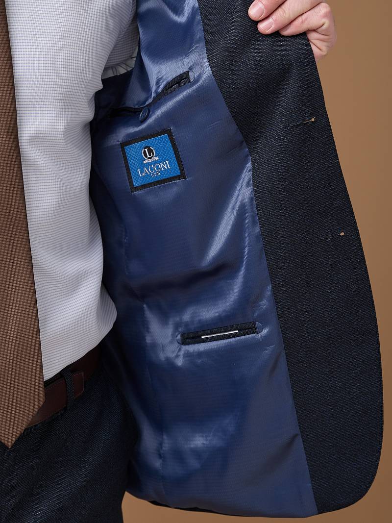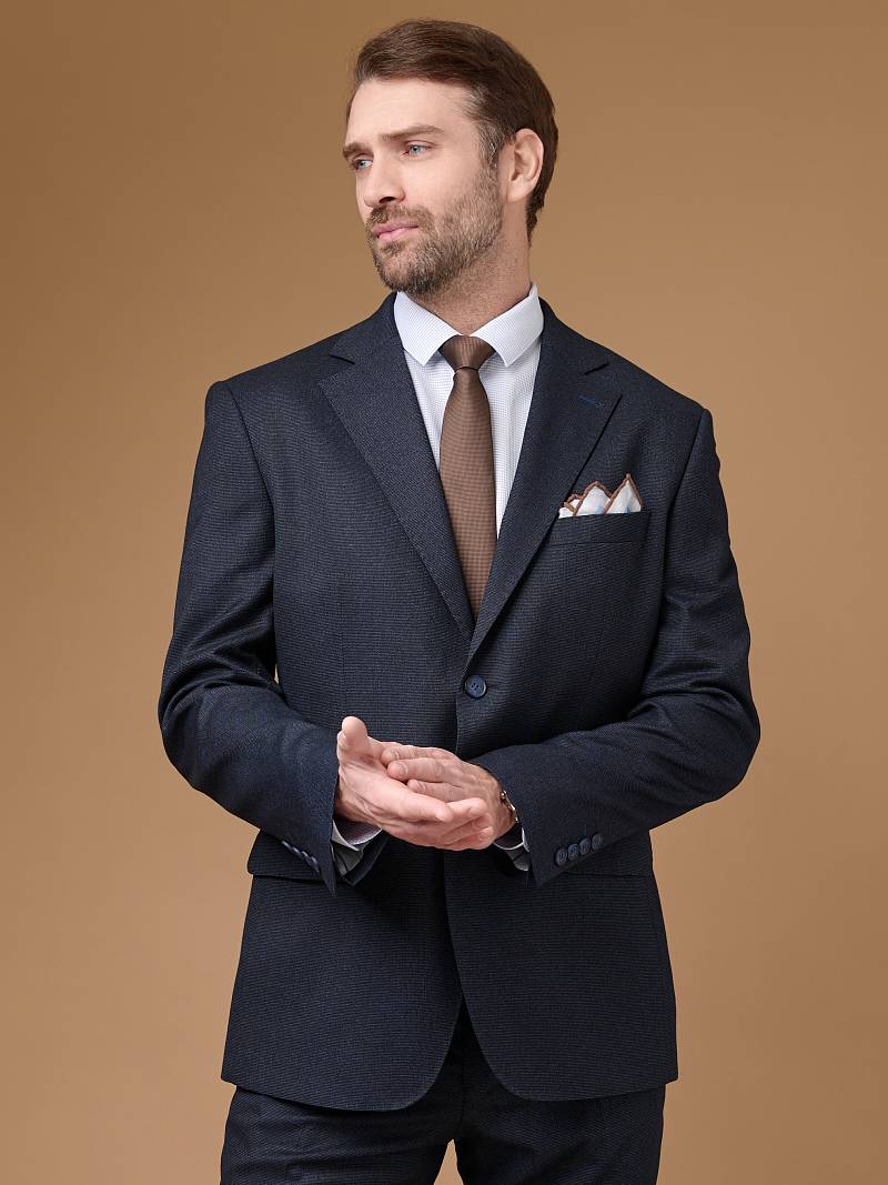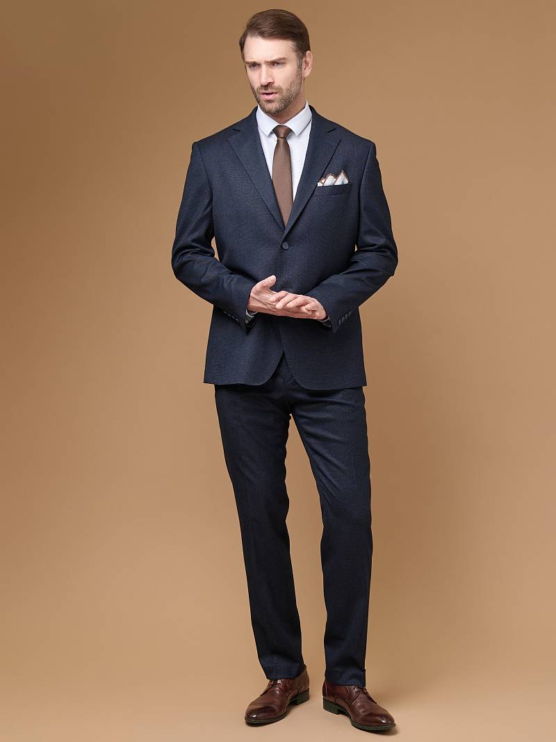 Classic fit (ПОЛУПРИЛЕГАЮЩИЙ СИЛУЭТ). Классический костюм двойка марки LACONI. Для пошива лаконичного, однотонного классического костюма использовали ткань с содержанием лайкры, которые придают ей эластичность и обеспечивают дополнительный комфорт и удобство. Слегка приталенный однобортный пиджак с широкими лацканами и с мягкой линией плеч дополнен сзади двумя шлицами, поэтому он садится по фигуре и подходит для повседневной носки. Пиджак обработан на подкладке с двумя внутренними карманами. Для придания образу торжественности подкладку нагрудного кармана можно использовать как платок. Брюки прямого кроя со стрелками и классической посадкой, с боковыми наклонными карманами и одним задними карманом "в рамку". Верхний срез брюк обработан поясом с корсажной лентой и шлевками под ремень. Дизайнеры марки LACONI тщательно подходят к выбору материалов. Пуговицы подбираются и красятся индивидуально под каждую ткань, а прикладные материалы используют только от передовых производителей. Костюм мужской, классичес