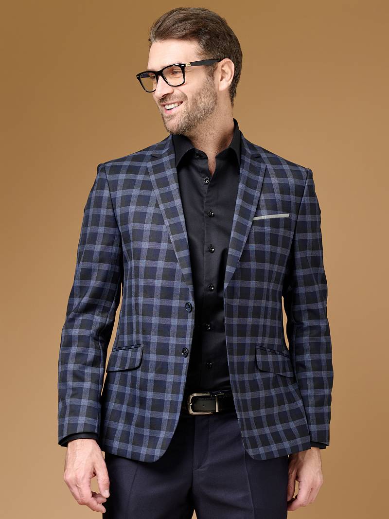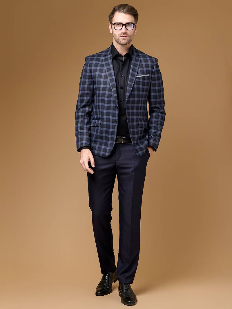 Classic fit, две пуговицы, две шлицы. Декоративный платок в нагрудном кармане. Брюки из ткани компаньона.