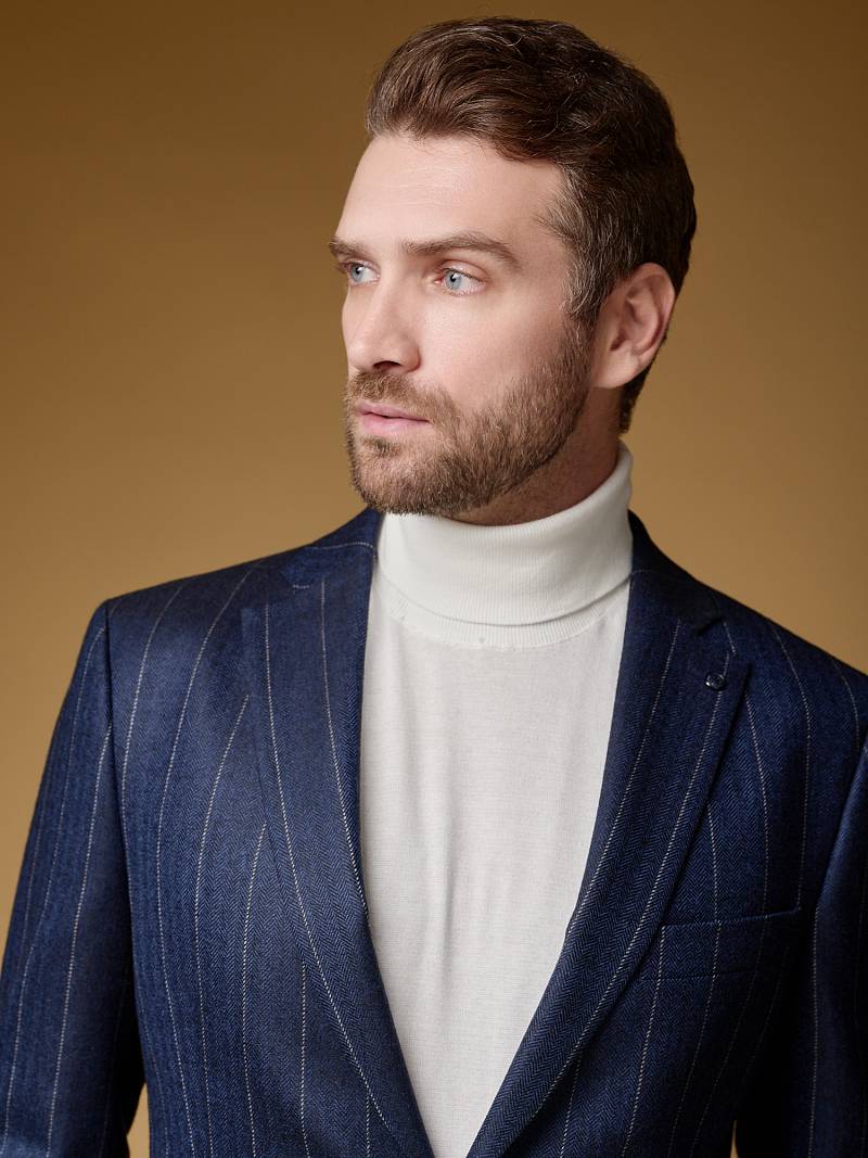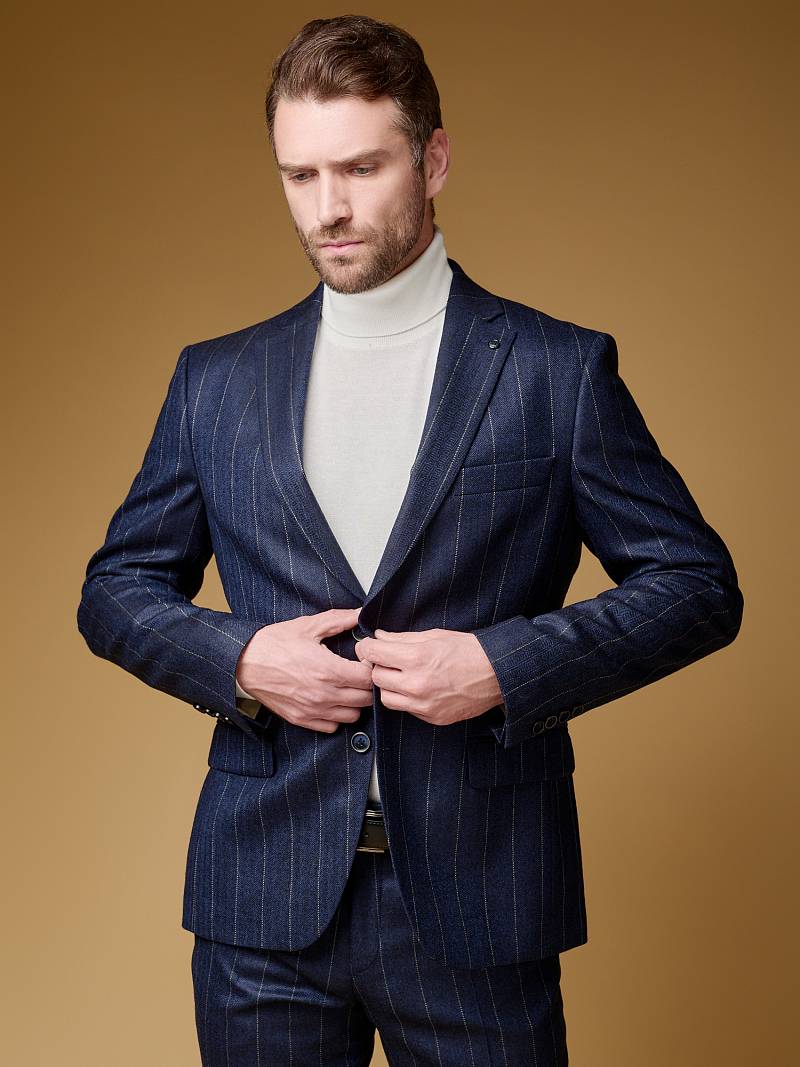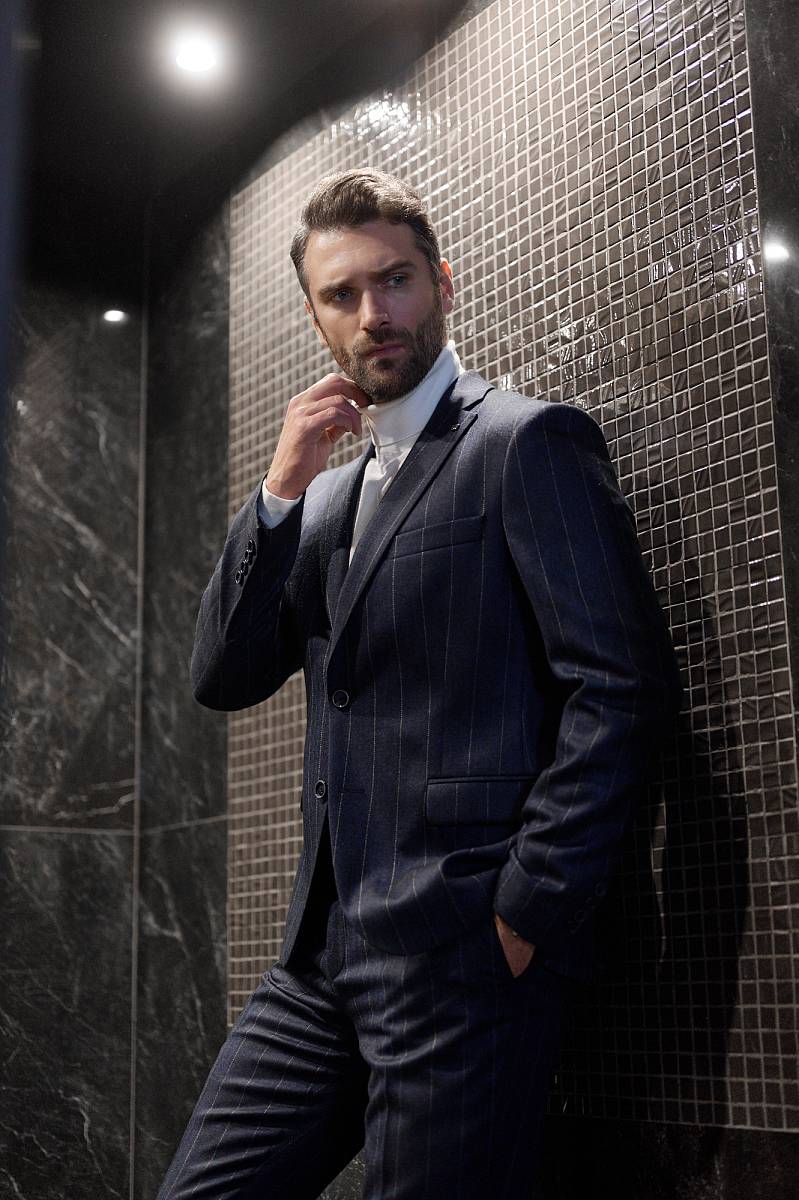 Классический костюм двойка Slim fit (ПРИЛЕГАЮЩИЙ СИЛУЭТ), рекомендуется брать на размер больше.Пиджак однобортный на две пуговицы, с двумя боковыми карманами с клапанами и нагрудной листочкой. Рукава втачные, двухшовные со шлицей и четырьмя декоративными пуговицами. По спинке расположены две шлицы. Пиджак на подкладке, с двумя внутренними карманами. Брюки без защипов, с боковыми наклонными карманами и двумя задними карманами «в рамку». Передние половинки на подкладке. Верхний срез брюк обработан поясом с корсажной лентой и шлевками под ремень. Застежка обработана на тесьму-молнию, с петлей-пуговицей на поясе и усилен металлическим крючком.