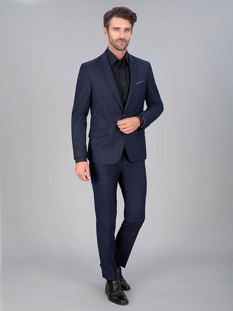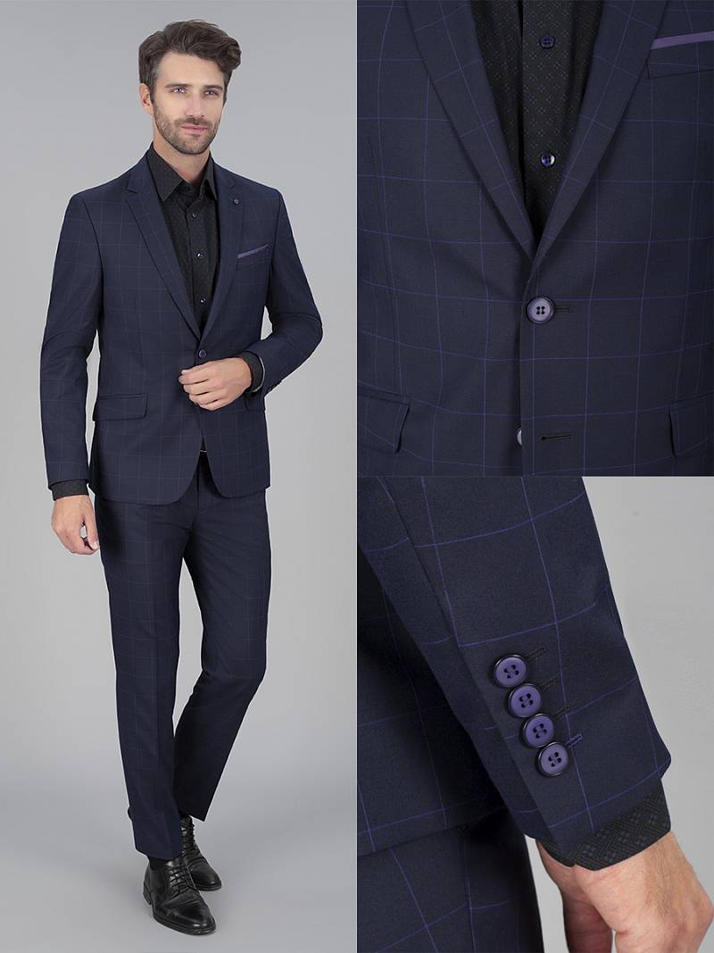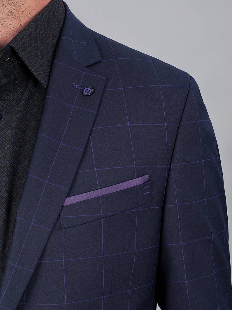Slim fit, две пуговицы, две шлицы. Декоративный платок в нагрудном кармане, контрастные петли.