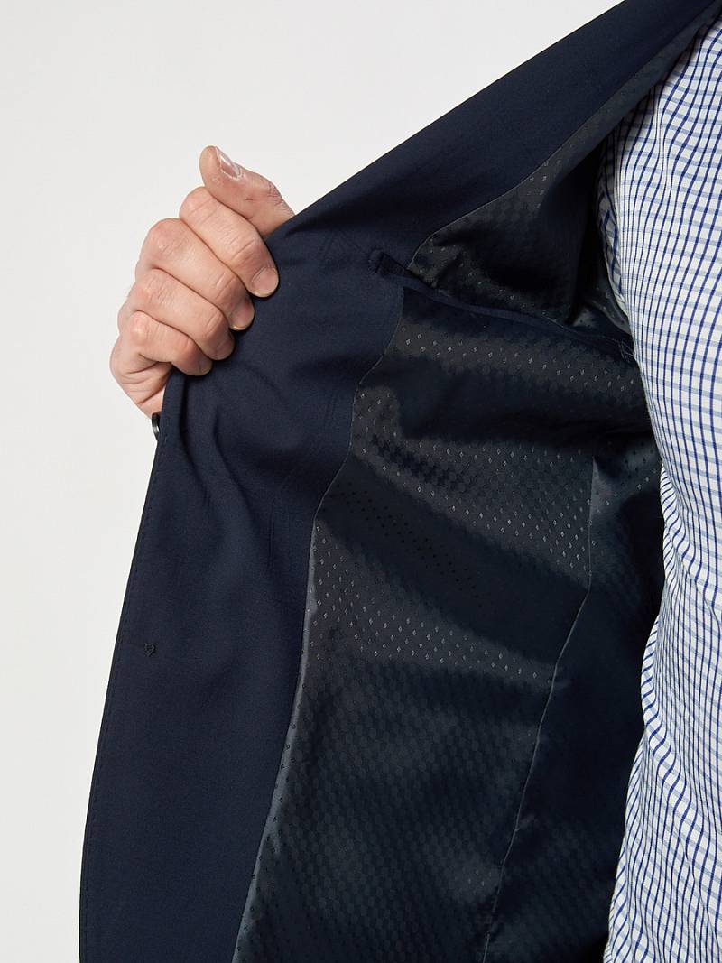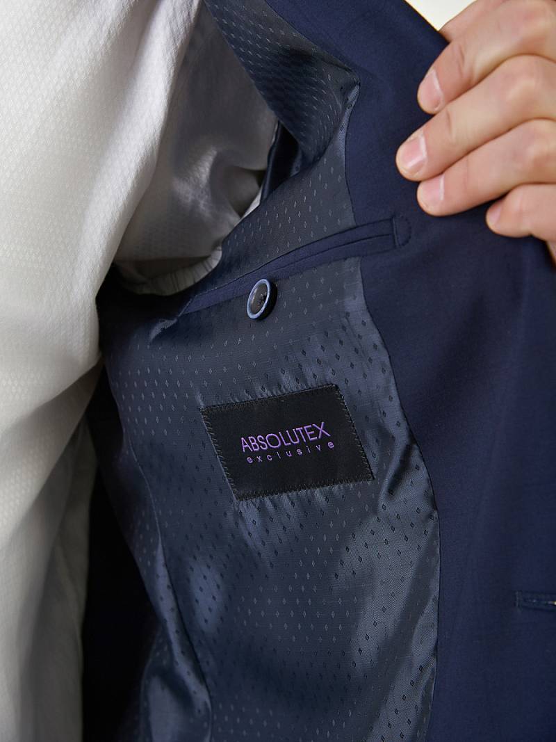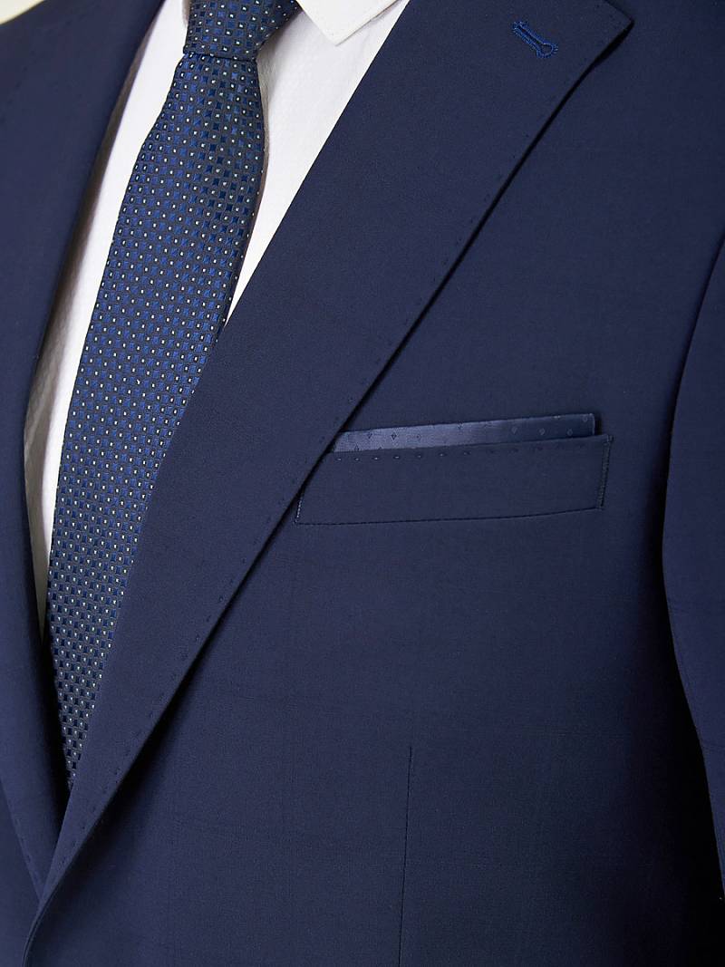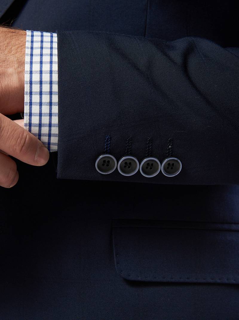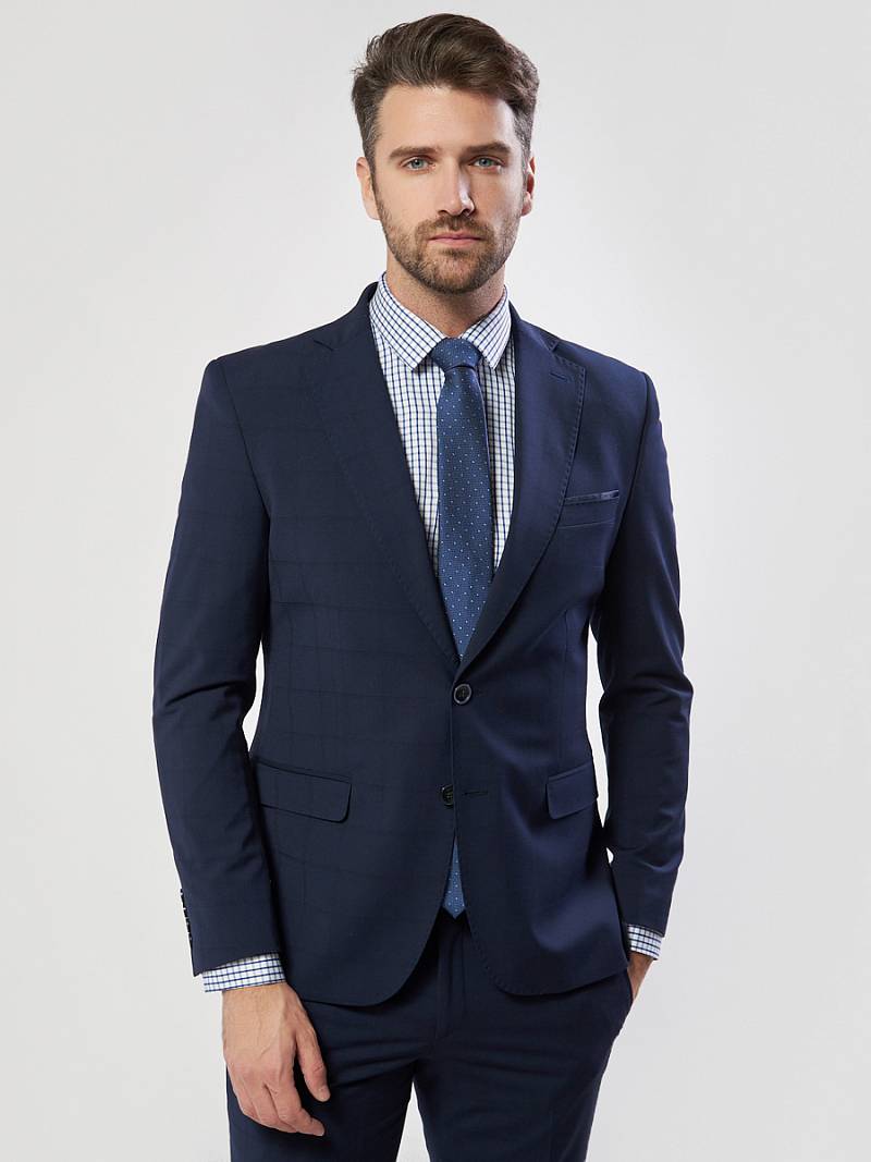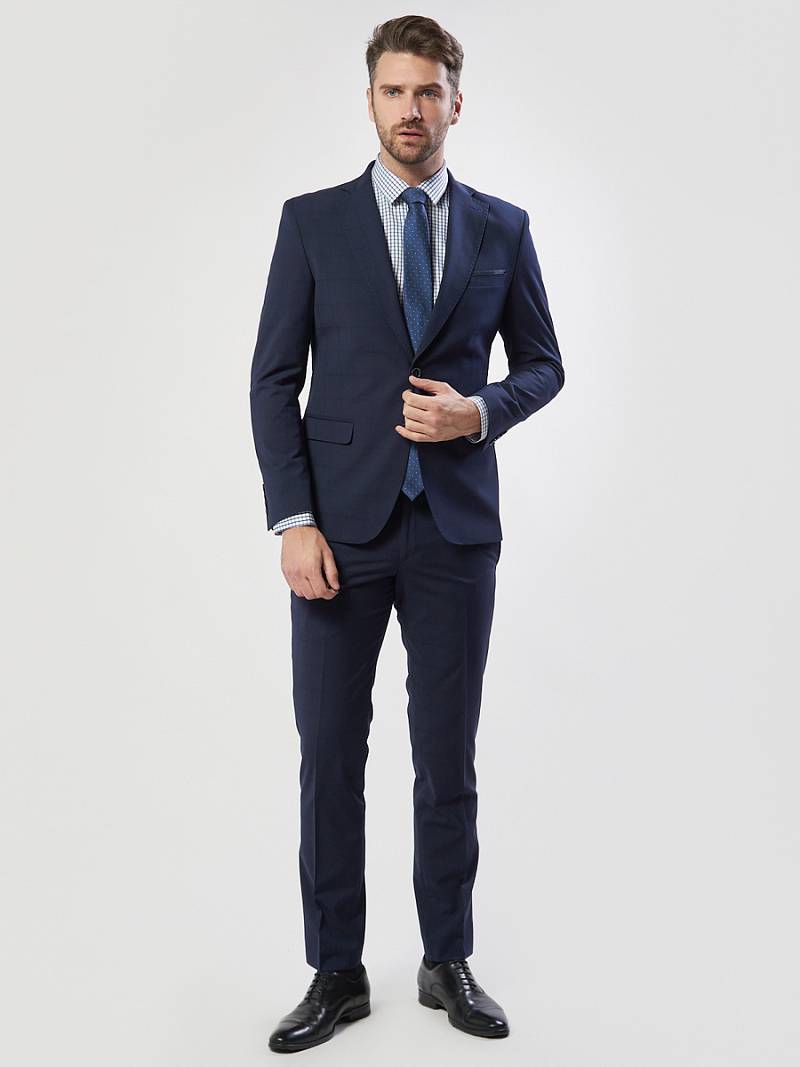 Slim fit, две пуговицы, две шлицы. Две фасонные петли на лацкане.