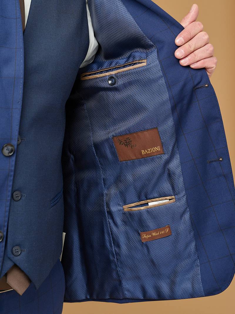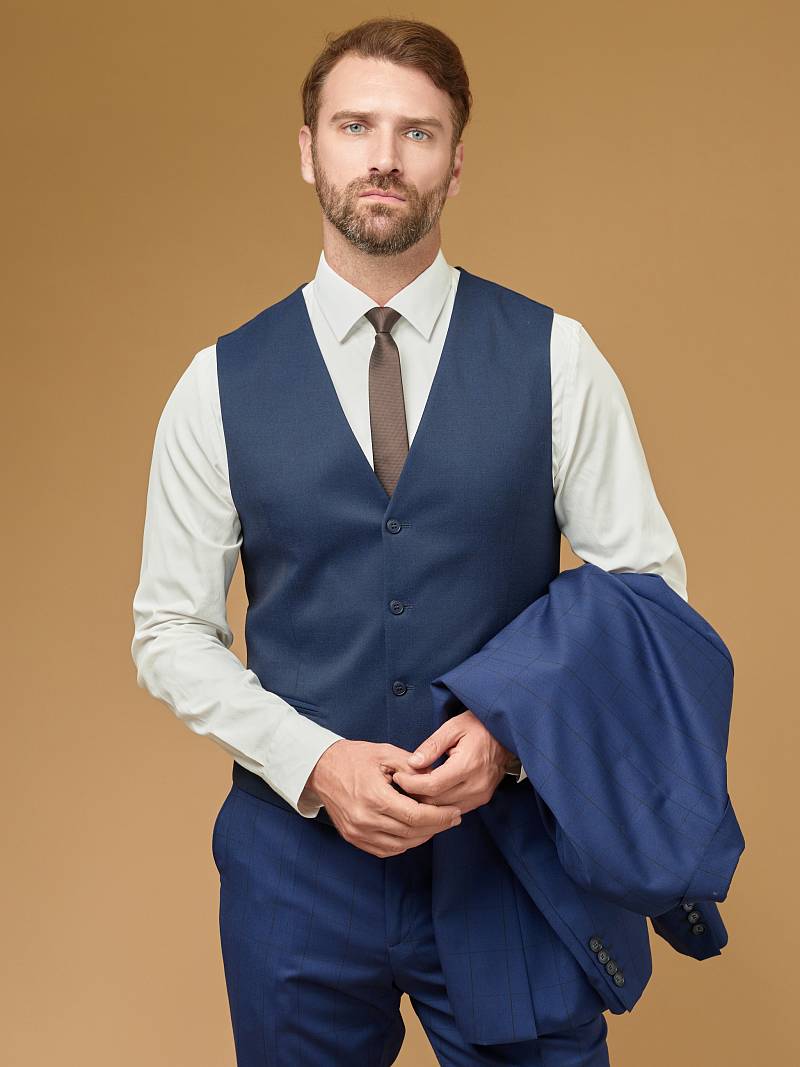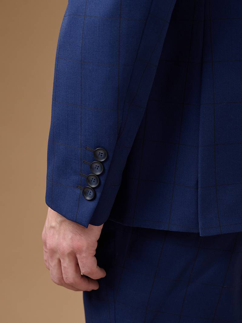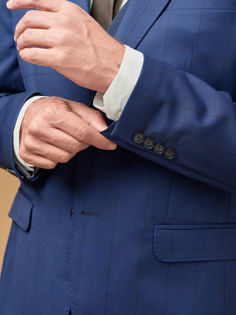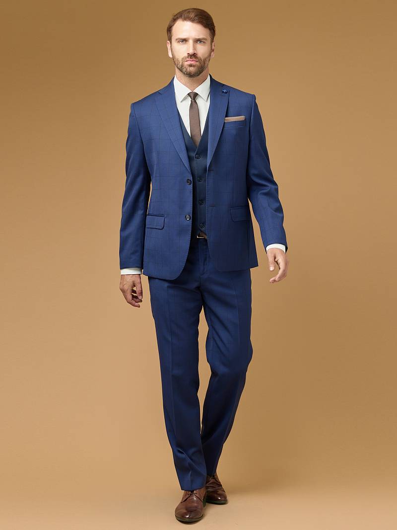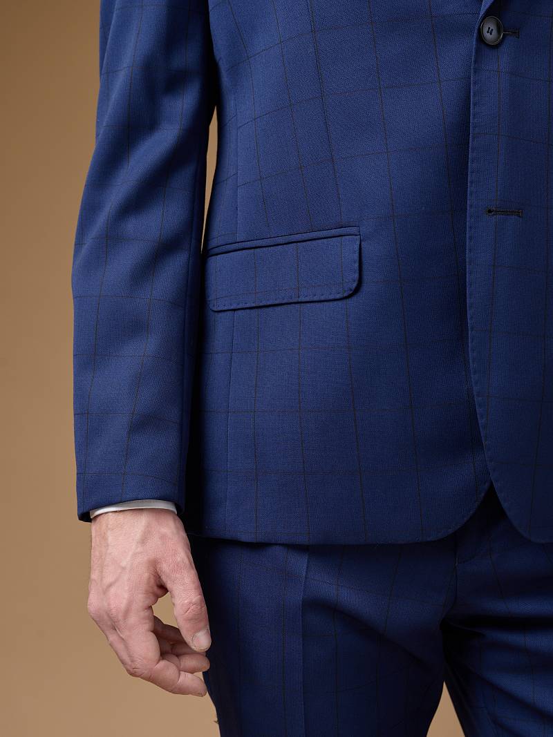 Классический костюм двойка Classic fit. Пиджак на две пуговицы, с боковыми и нагрудным карманами, по спинке две шлицы. Вспушка по воротнику, лацканам, краю борта, клапанам и нагрудной листочке Брюки без защипов с боковыми и одним задним карманом.
