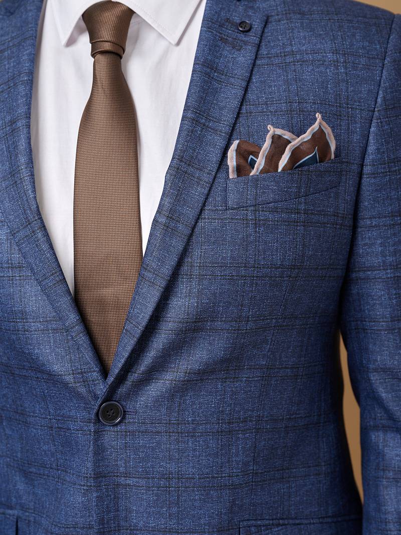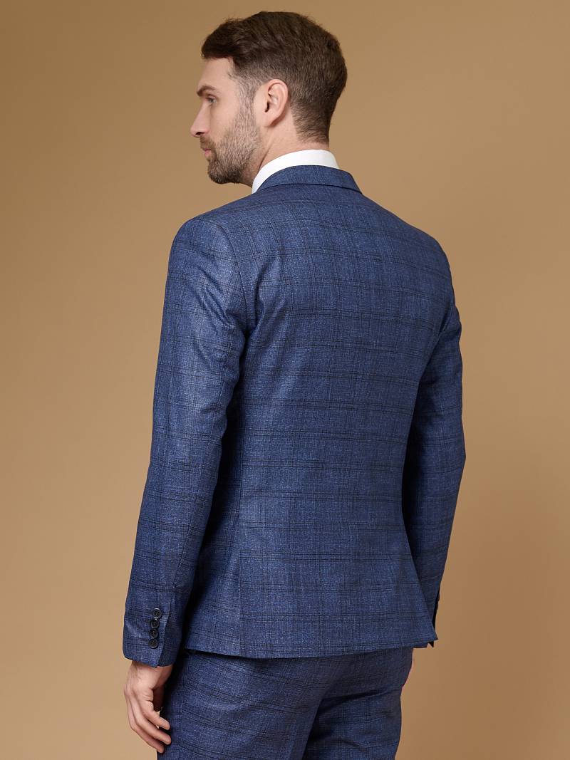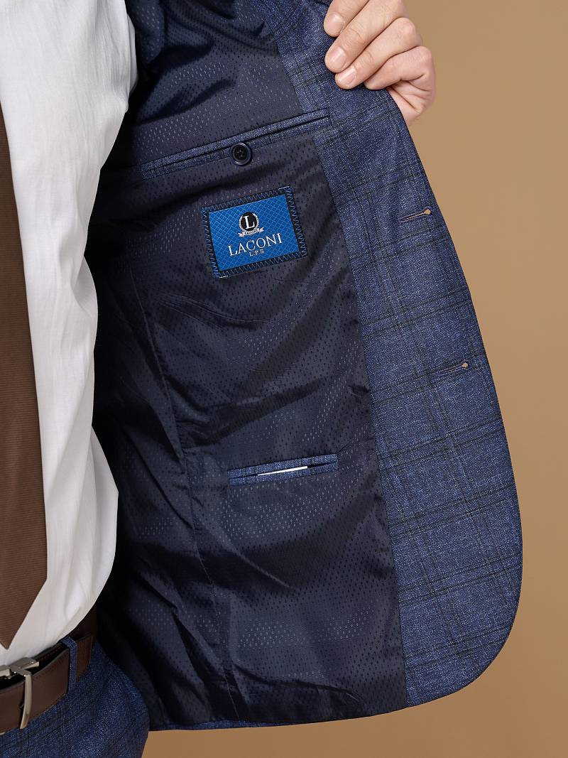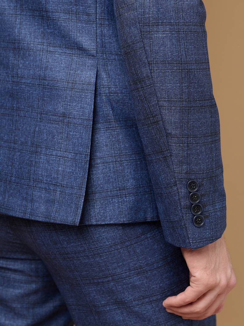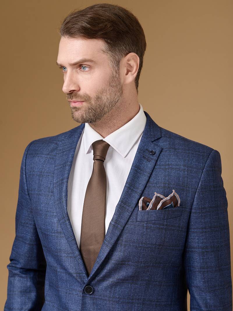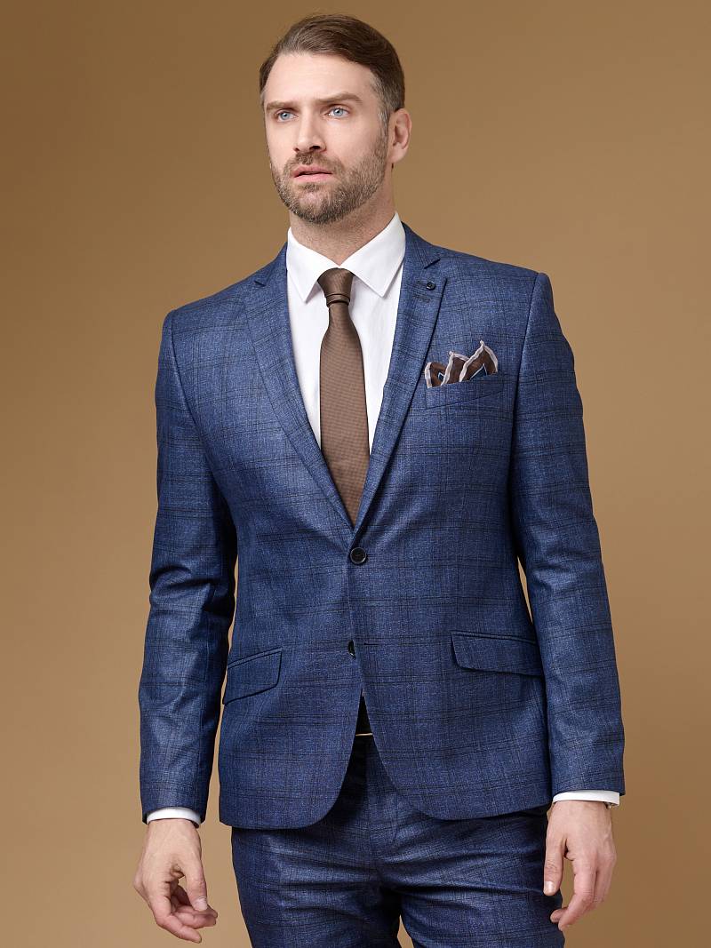 Классический костюм двойка Slim fit. Пиджак на две пуговицы, с боковыми и нагрудным карманами, по спинке две шлицы. Брюки без защипов с боковыми и двумя задними карманами.