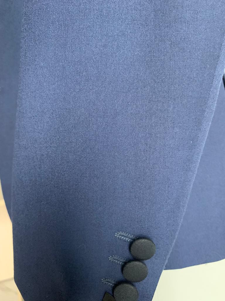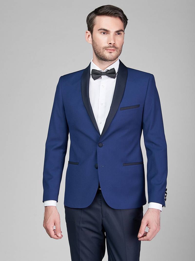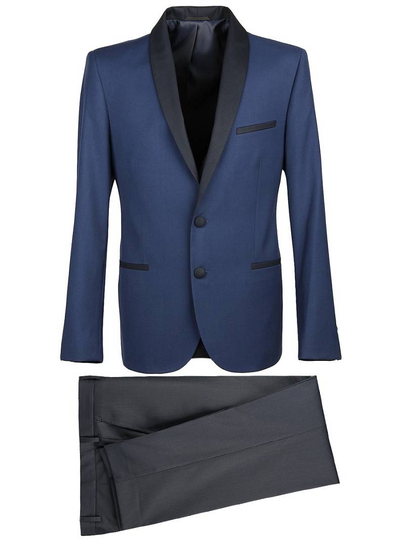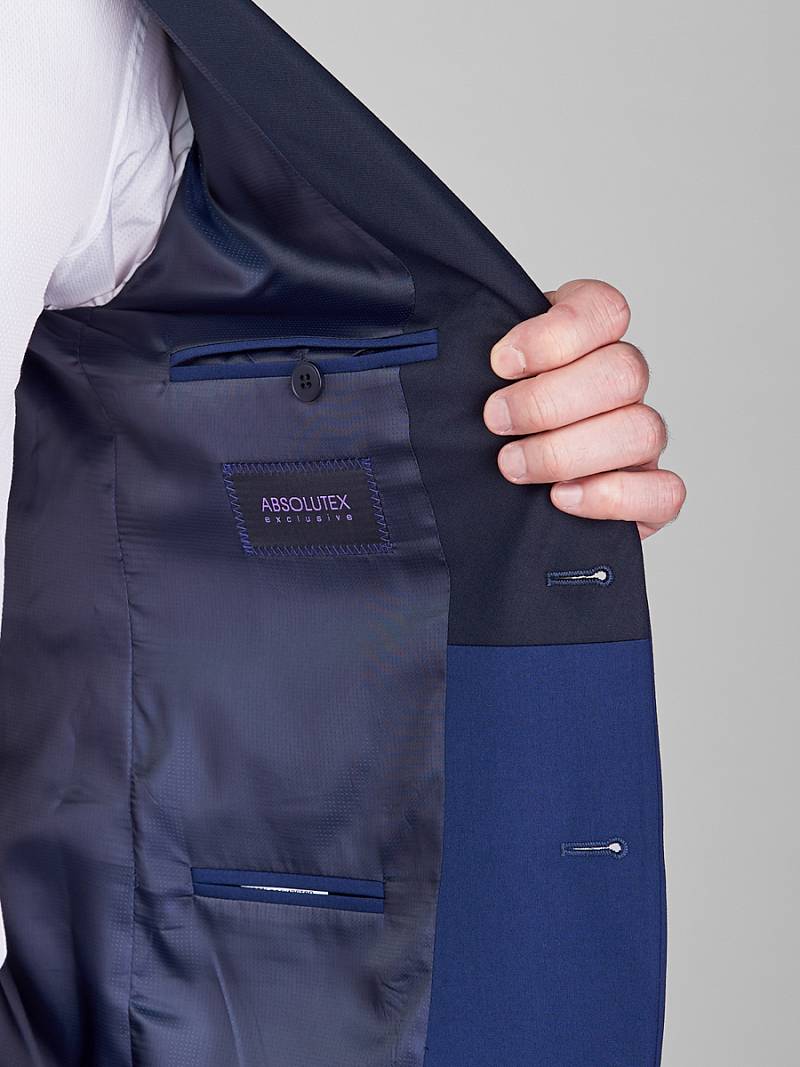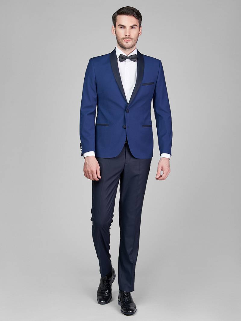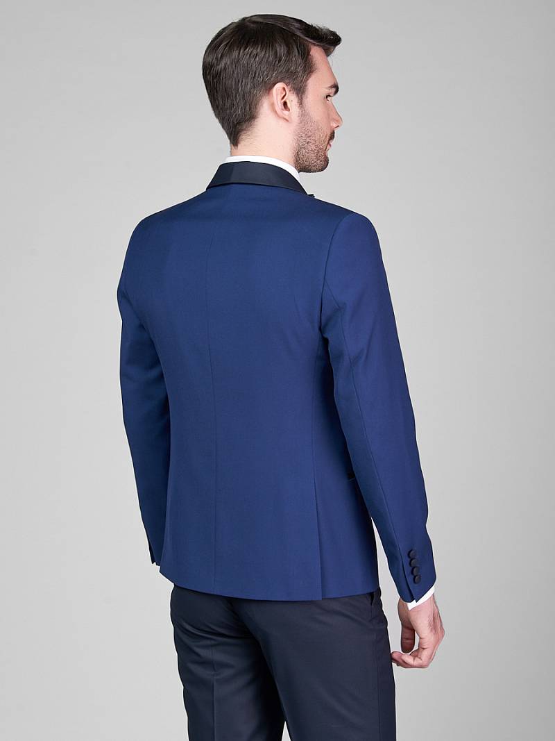 Slim fit, две пуговицы, две шлицы. Брюки и отделка из ткани компаньон.