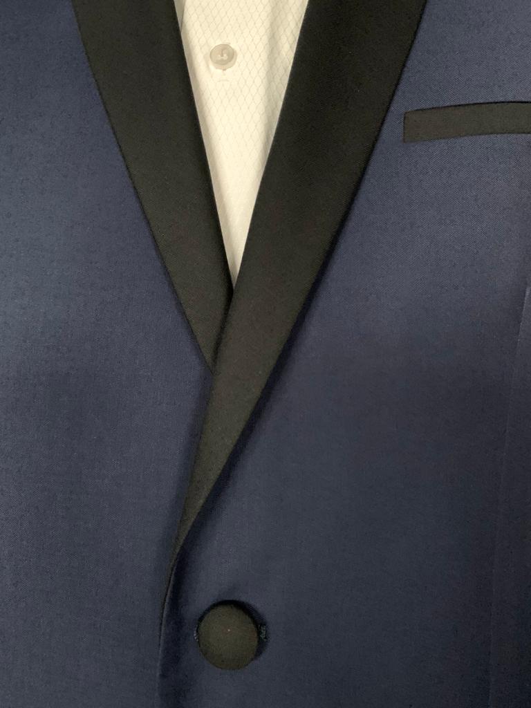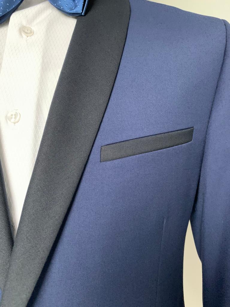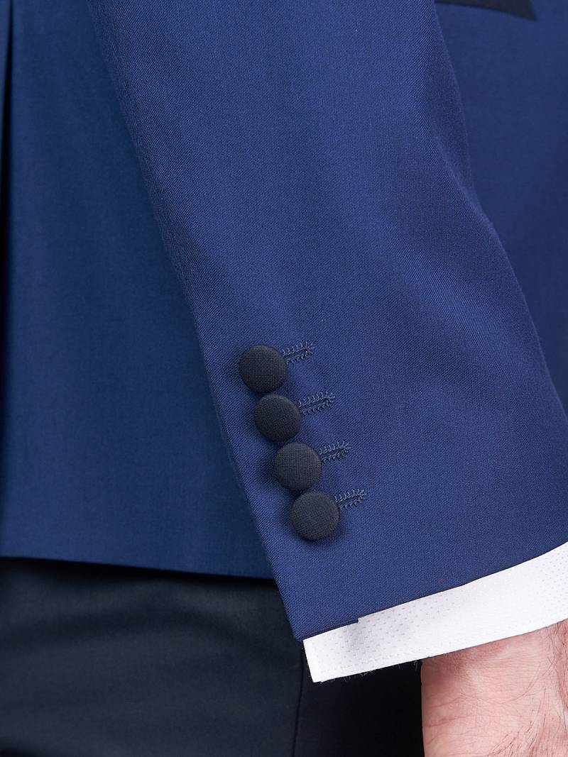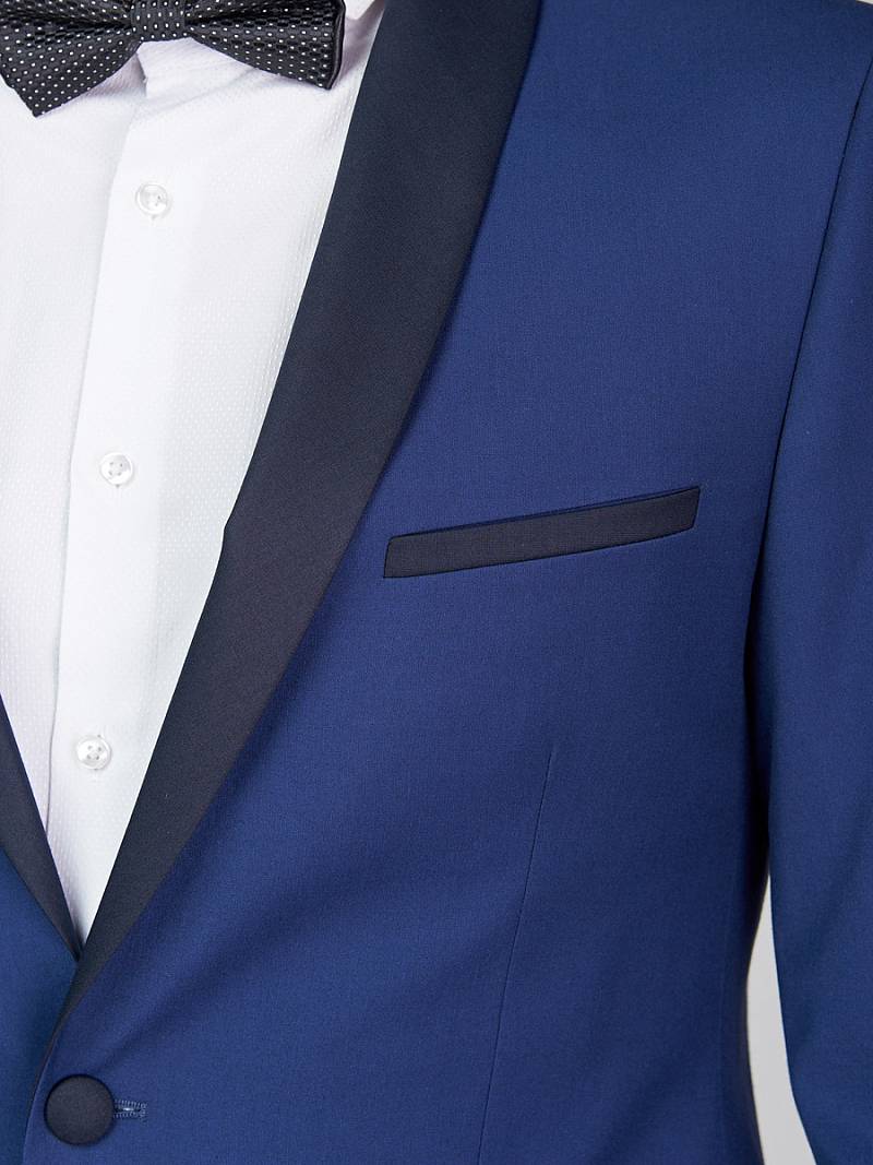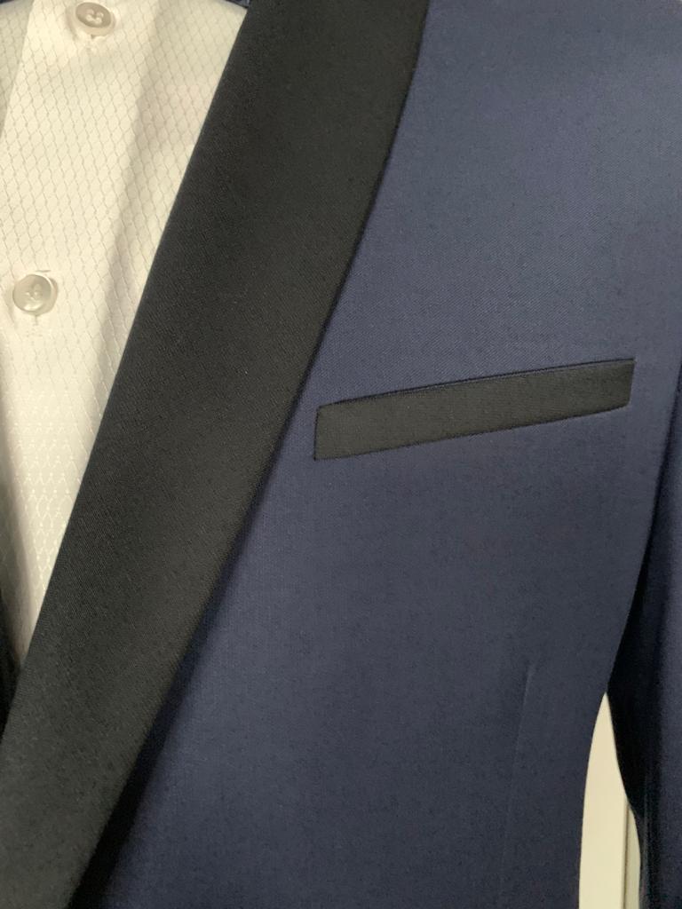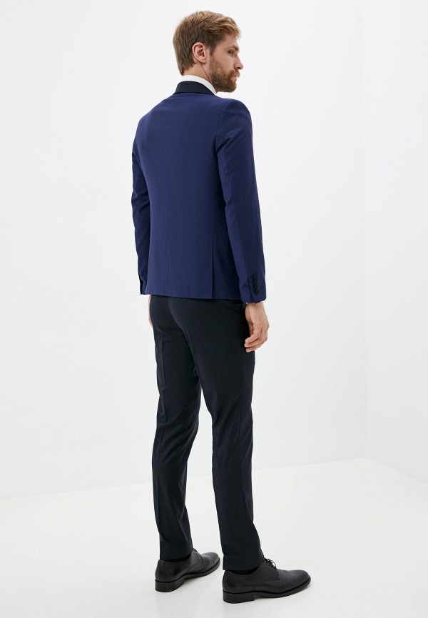 Slim fit, две пуговицы, две шлицы. Брюки и отделка из ткани компаньон.