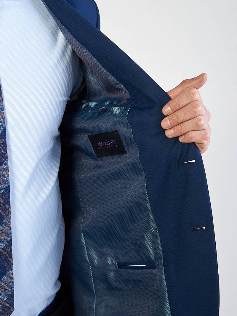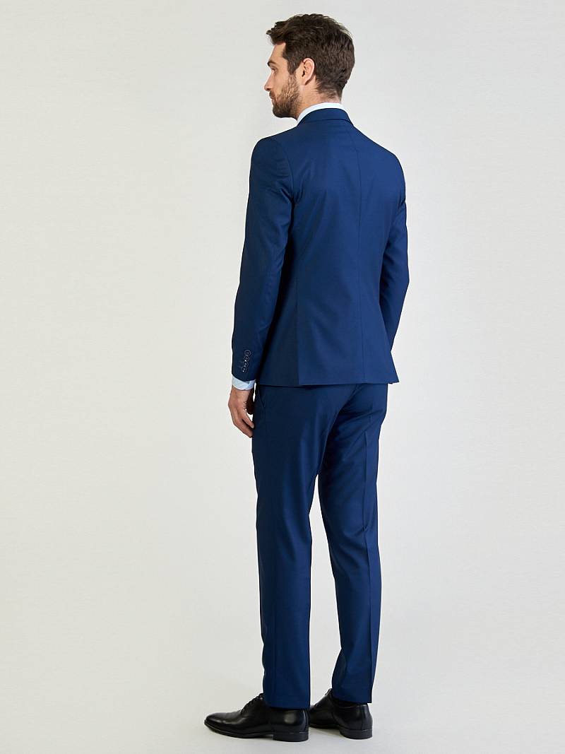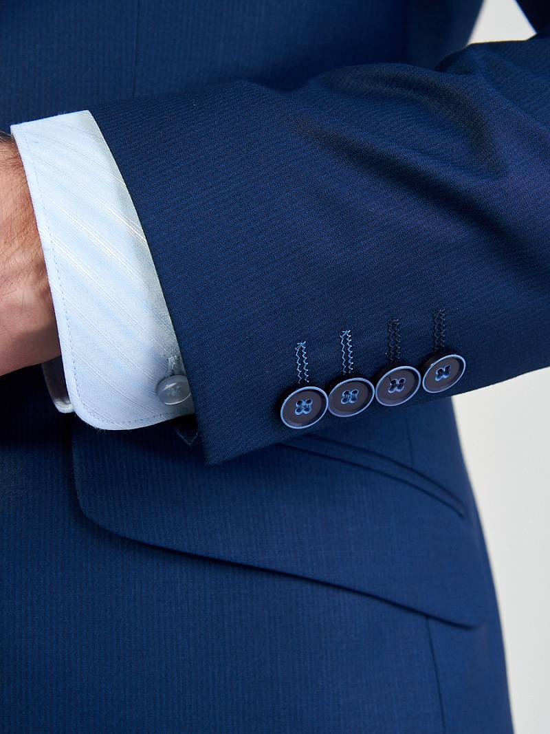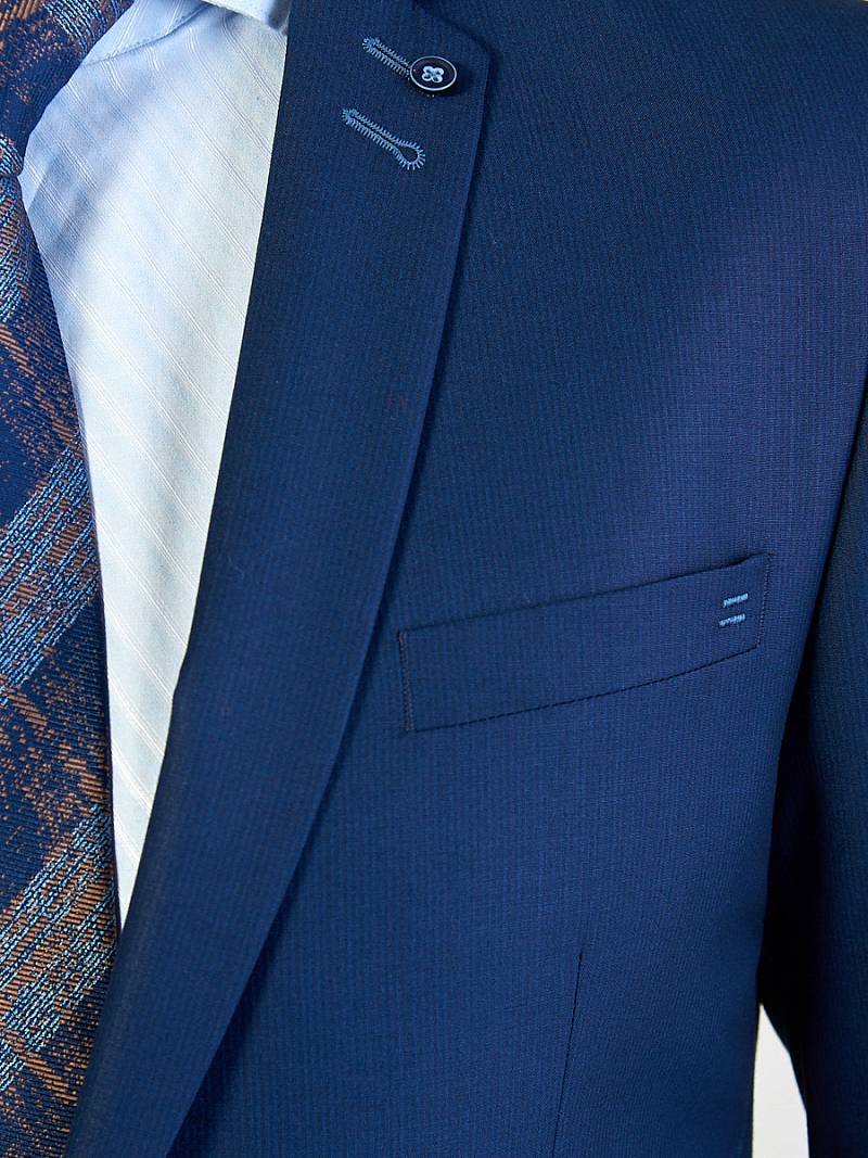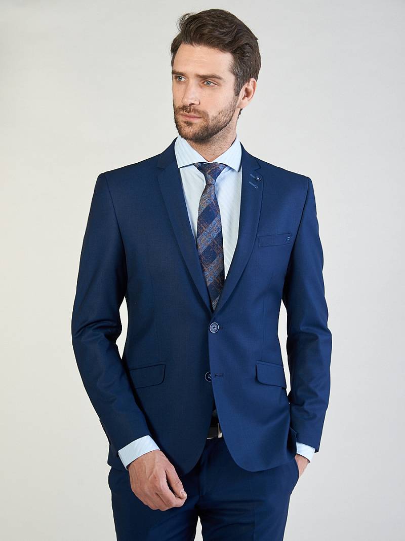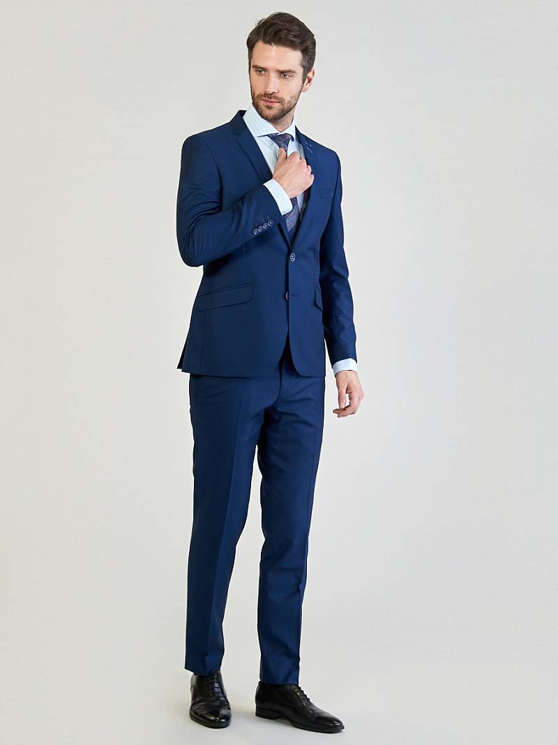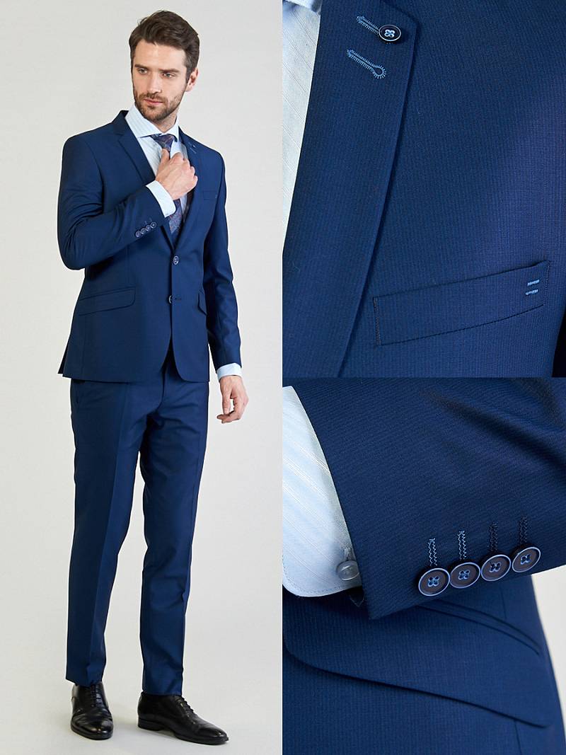 Классический костюм двойка Slim fit. Пиджак на две пуговицы, с боковыми и нагрудным карманами, по спинке две шлицы. Брюки без защипов с боковыми и двумя задними карманами.