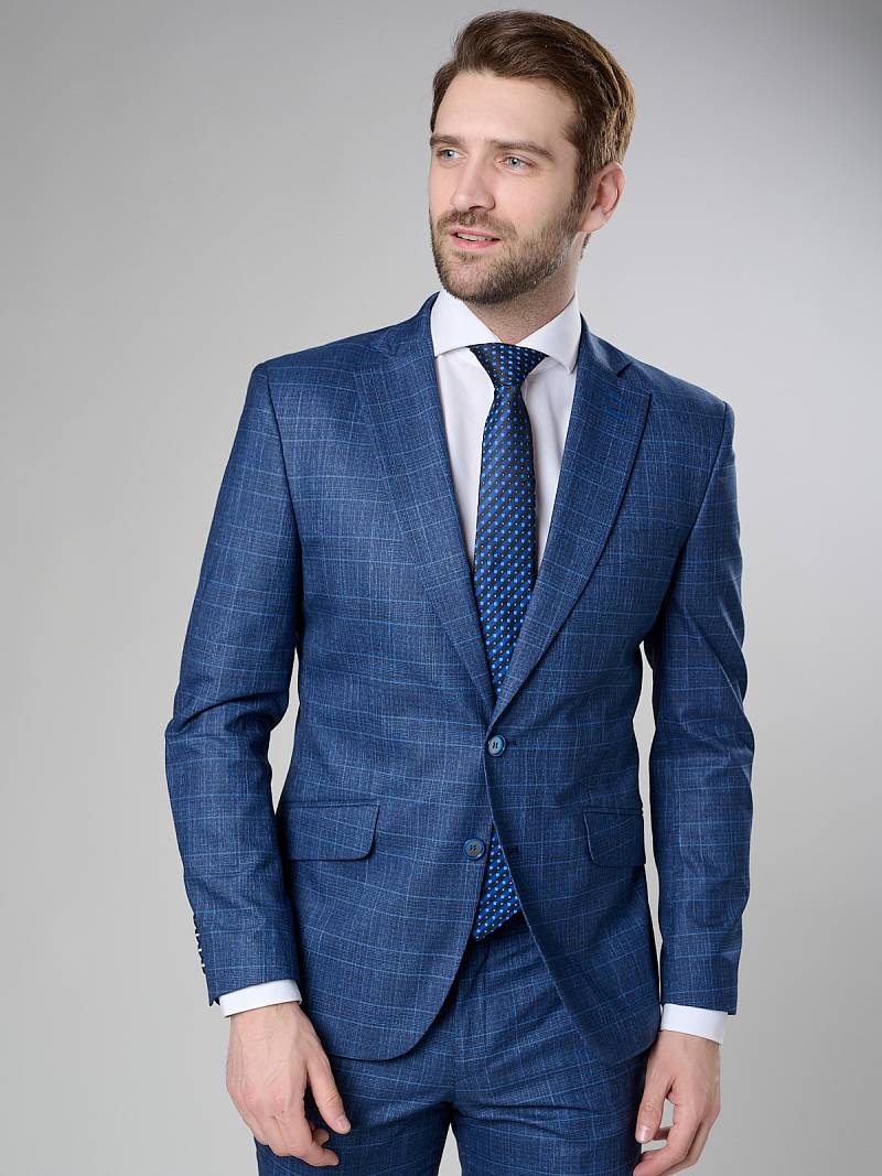 Классический костюм двойка Slim fit. Пиджак на две пуговицы, с боковыми и нагрудным карманами, по спинке две шлицы. Брюки без защипов с боковыми и двумя задними карманами.