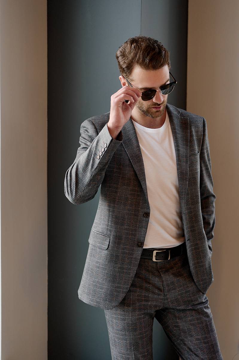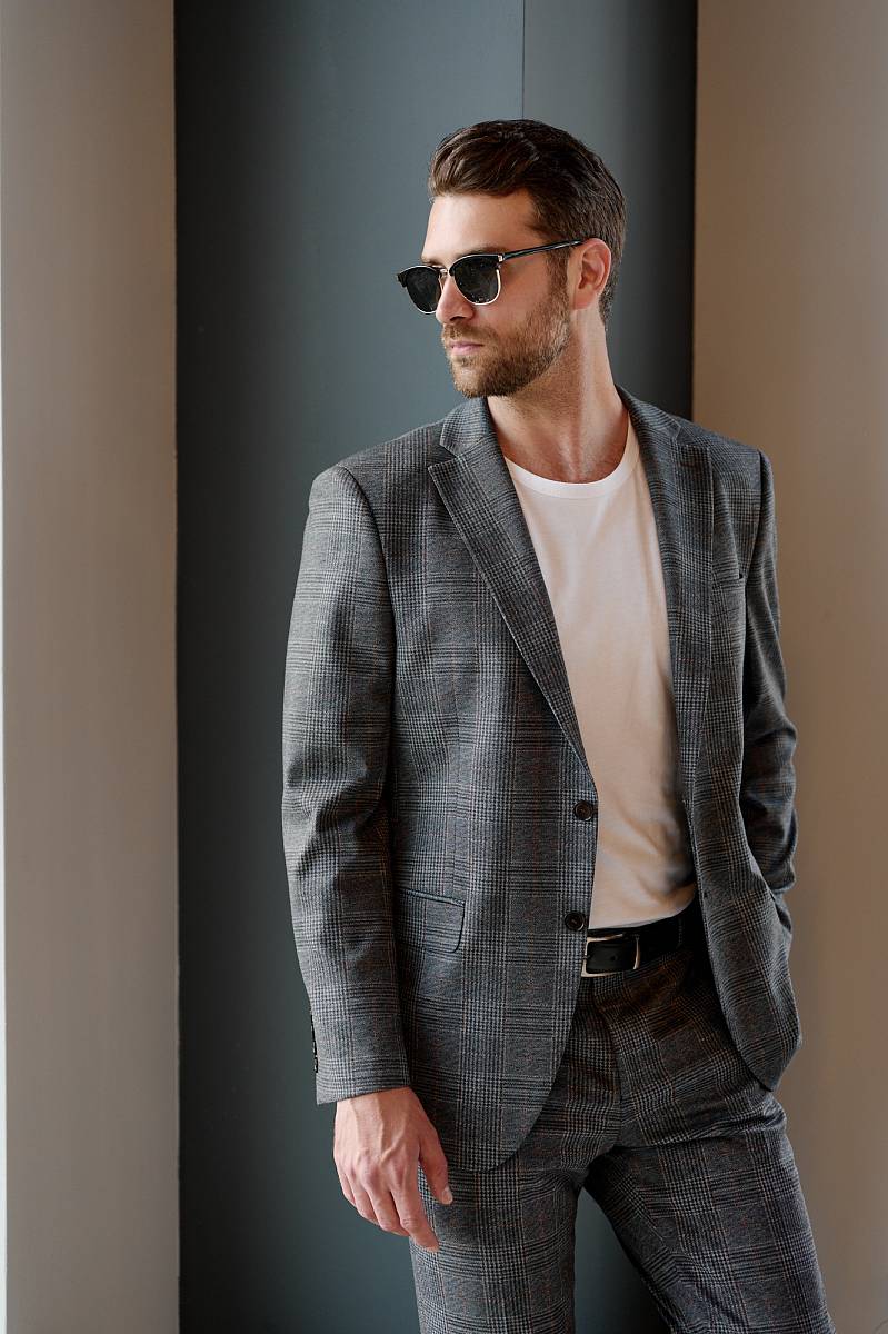 Классический костюм двойка Slim fit (ПРИЛЕГАЮЩИЙ СИЛУЭТ), рекомендуется брать на размер больше.Пиджак однобортный на две пуговицы, с двумя боковыми карманами с клапанами и нагрудной листочкой. Рукава втачные, двухшовные со шлицей и четырьмя декоративными пуговицами. По спинке расположены две шлицы. Пиджак на подкладке, с двумя внутренними карманами. Брюки без защипов, с боковыми наклонными карманами и двумя задними карманами «в рамку». Передние половинки на подкладке. Верхний срез брюк обработан поясом с корсажной лентой и шлевками под ремень. Застежка обработана на тесьму-молнию, с петлей-пуговицей на поясе и усилен металлическим крючком.