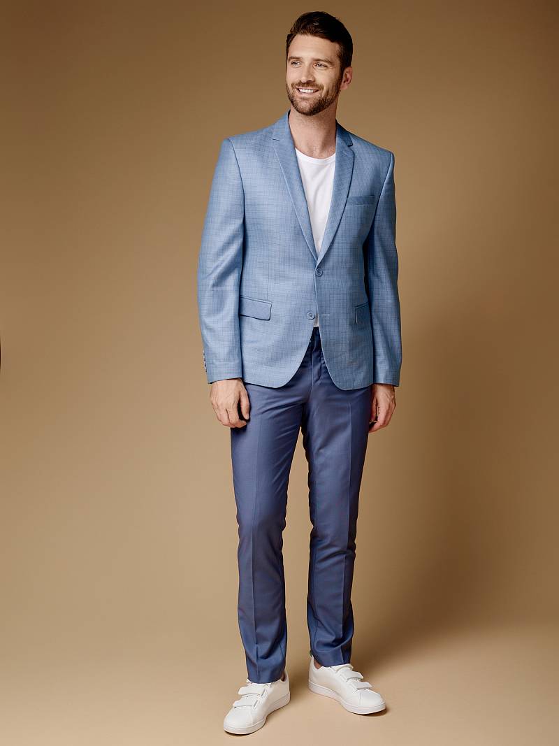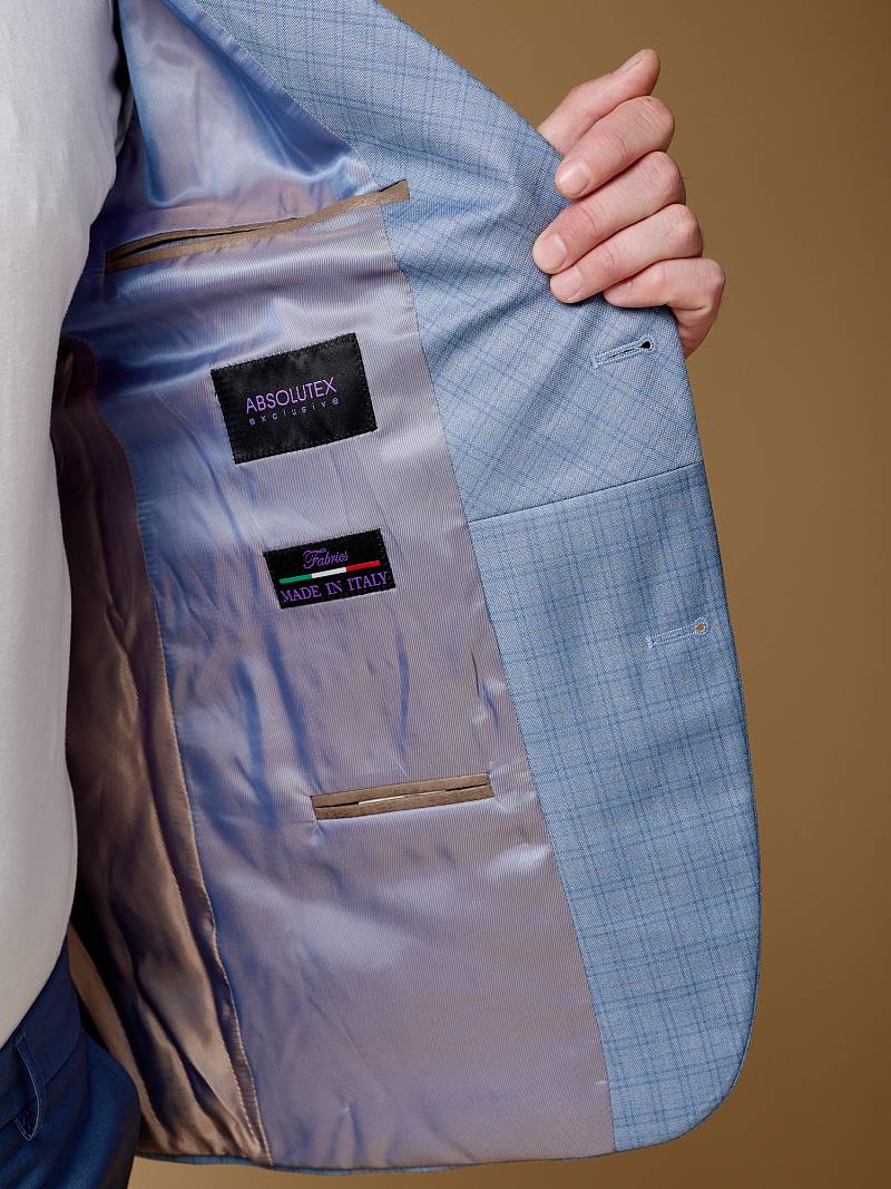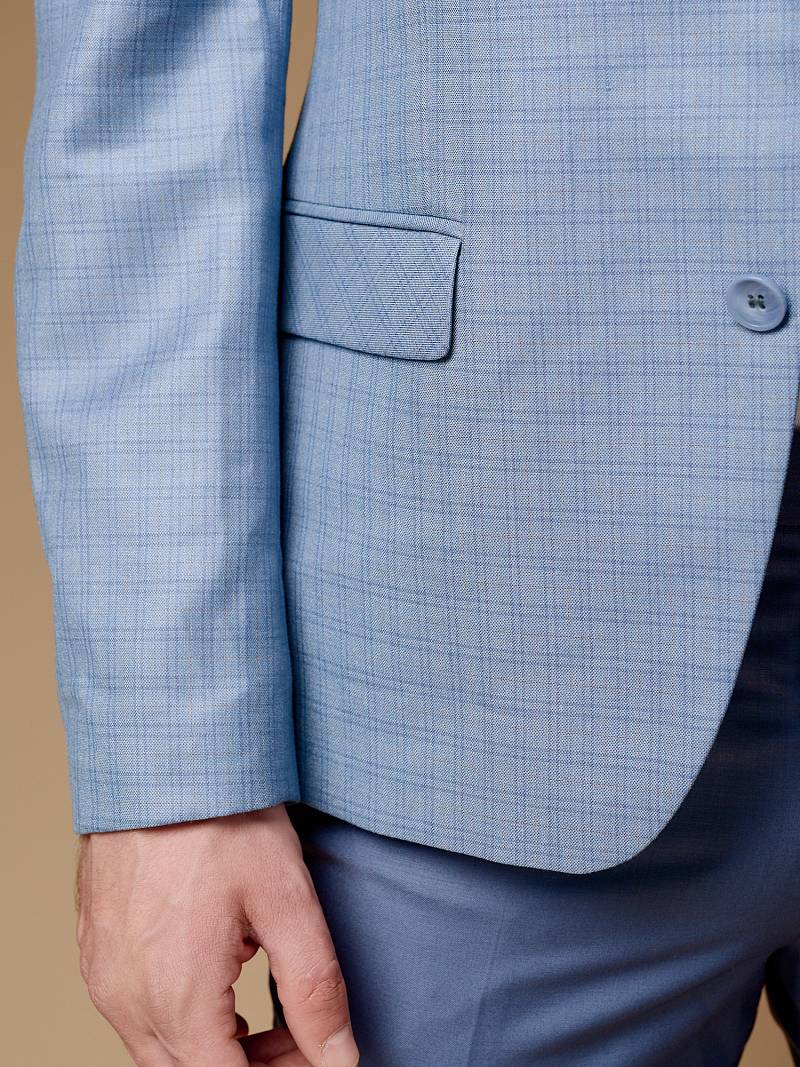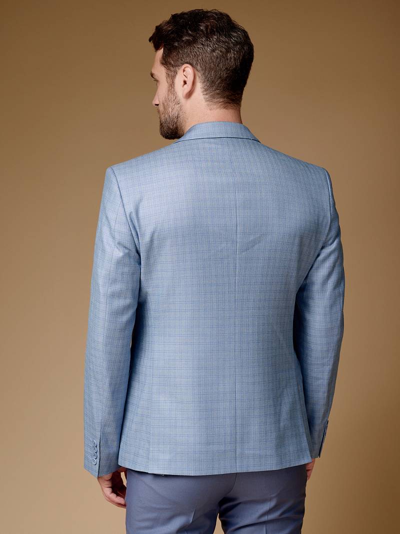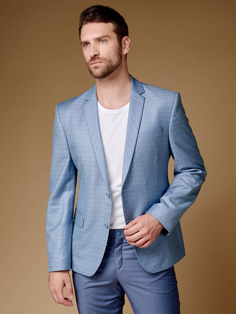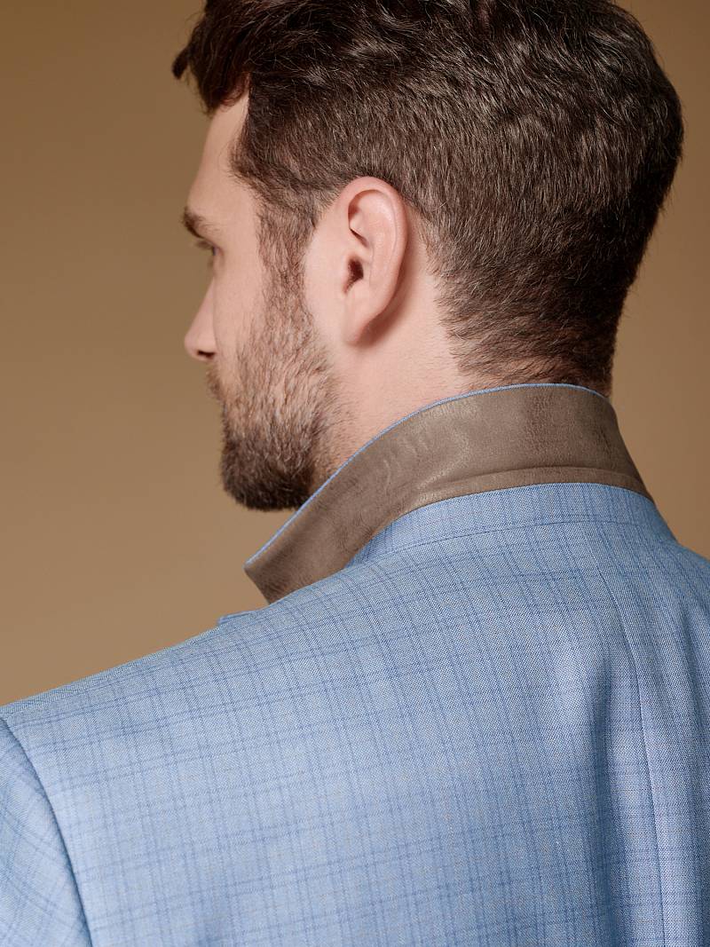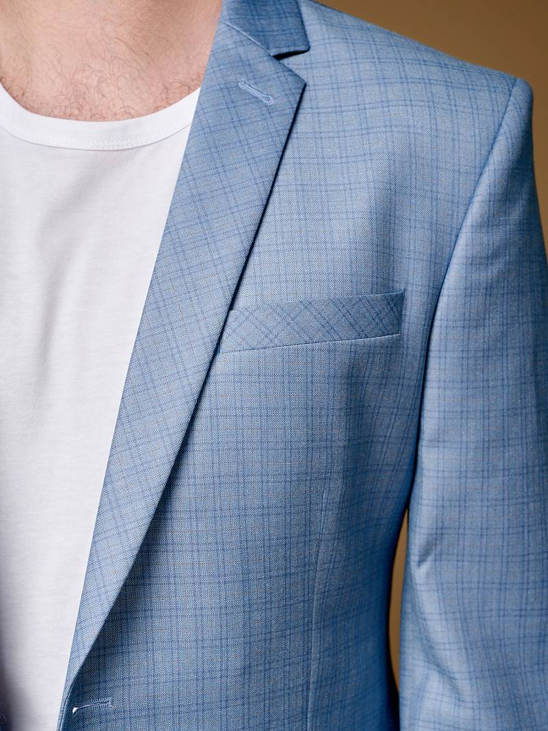 Slim fit, две пуговицы, одна шлица. Отделочная строчка по воротнику, лацканам, краю борта и клапанам