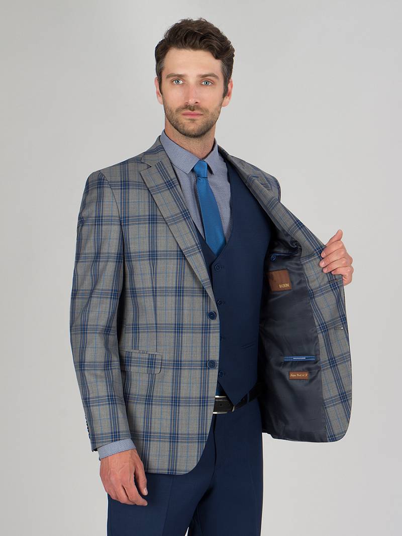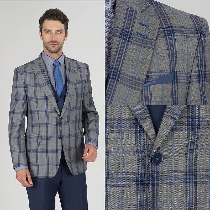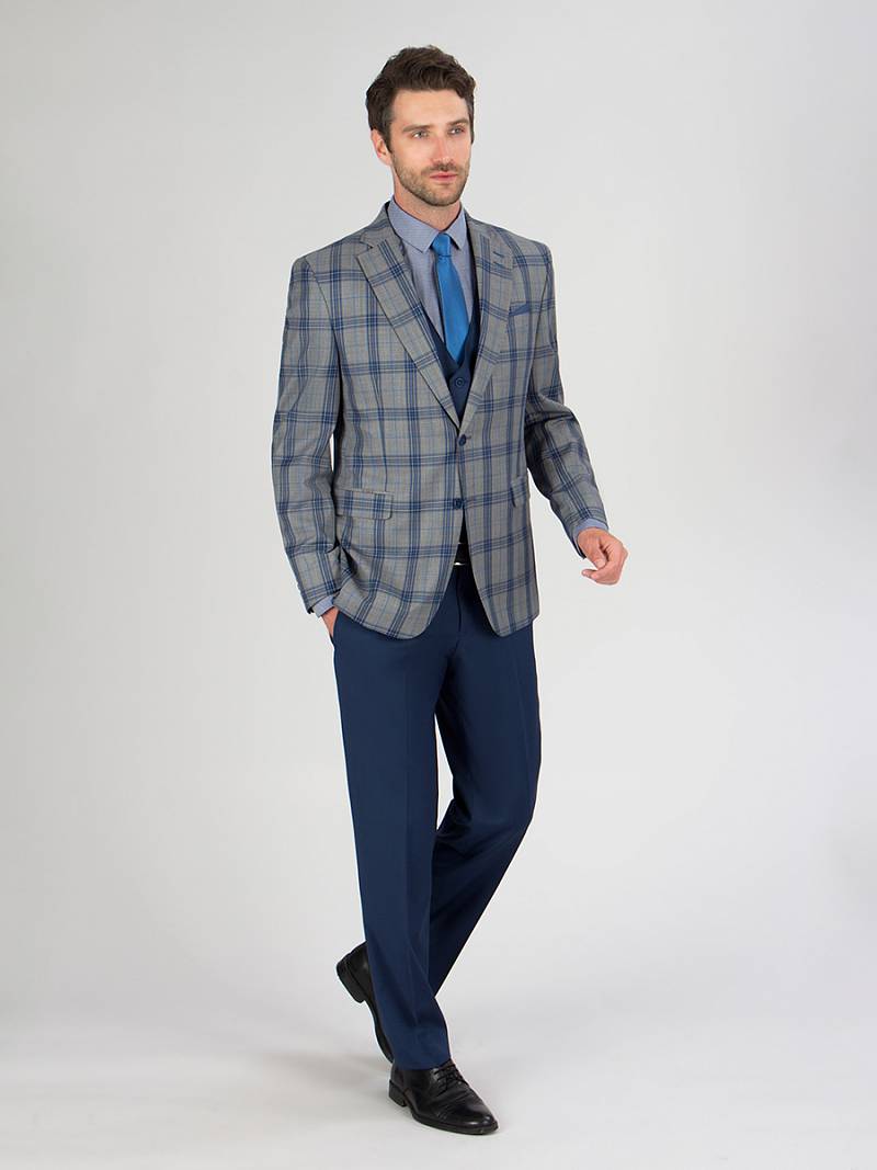 Классический костюм-тройка Classic fit. Пиджак на две пуговицы, с боковыми и нагрудным карманами, по спинке две шлицы. Брюки без защипов с боковыми и двумя задними карманами. Брюки и жилет выполнены из ткани компаньона.