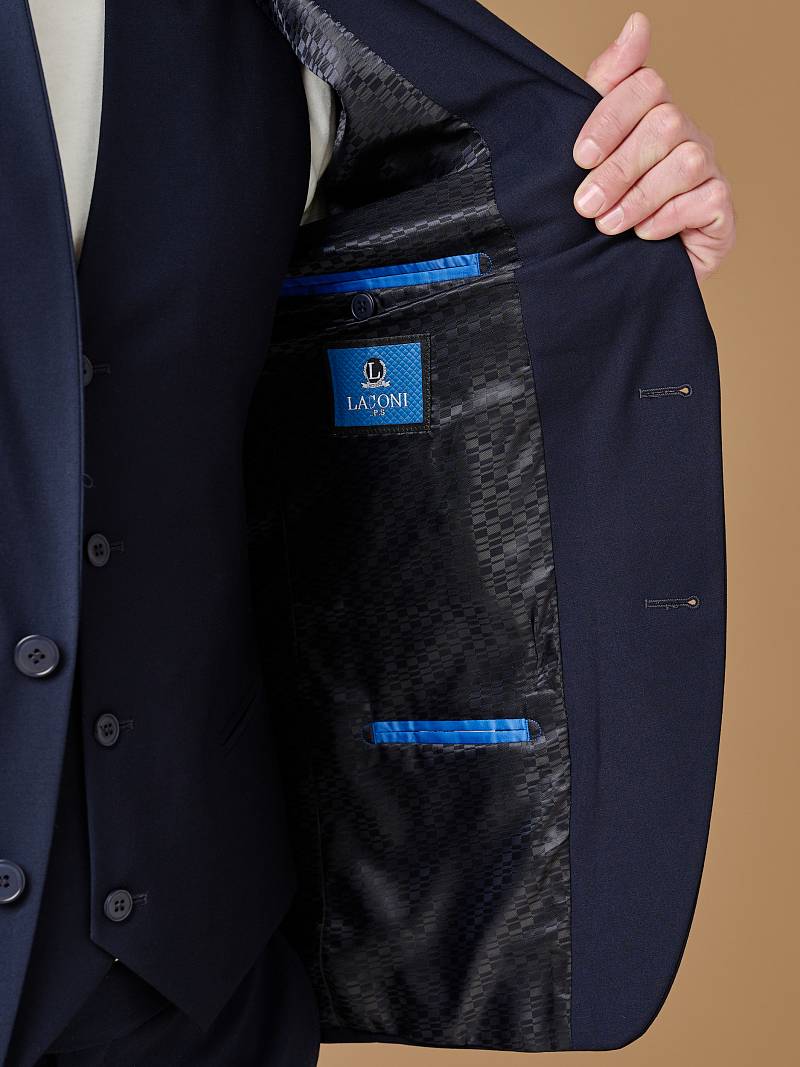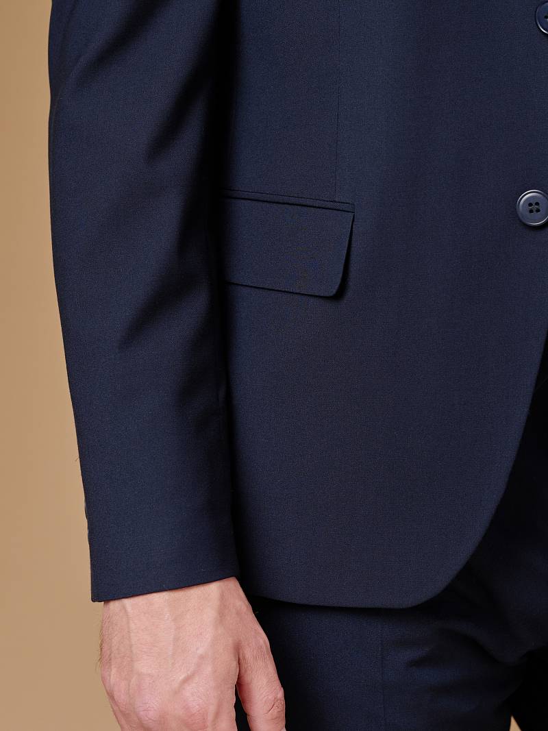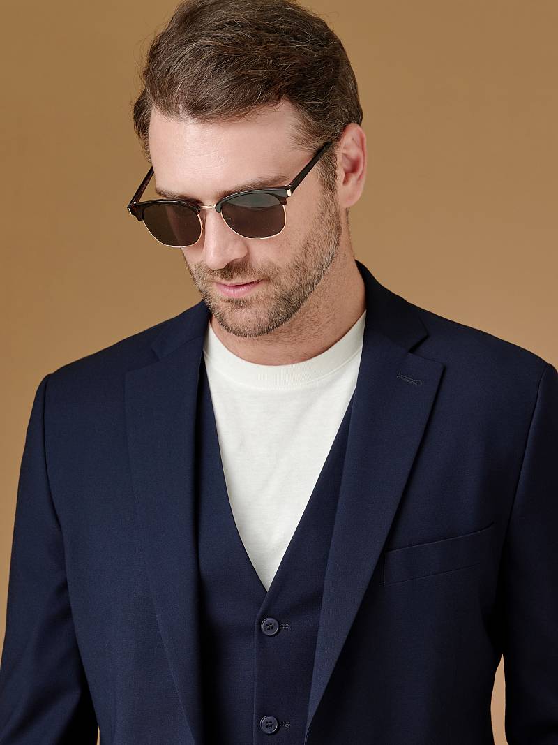Классический костюм тройка Slim fit (ПРИЛЕГАЮЩИЙ СИЛУЭТ), рекомендуется брать на размер больше.Пиджак однобортный на две пуговицы, с двумя боковыми карманами с клапанами и нагрудной листочкой. Рукава втачные, двухшовные со шлицей и четырьмя декоративными пуговицами. По спинке расположены две шлицы. Пиджак на подкладке, с двумя внутренними карманами. Брюки без защипов, с боковыми наклонными карманами и двумя задними карманами «в рамку». Передние половинки на подкладке. Верхний срез брюк обработан поясом с корсажной лентой и шлевками под ремень. Застежка обработана на тесьму-молнию, с петлей-пуговицей на поясе и усилен металлическим крючком. Жилет с двумя боковыми карманами, по спинке расположен хлястик для регулировки объема в области талии.