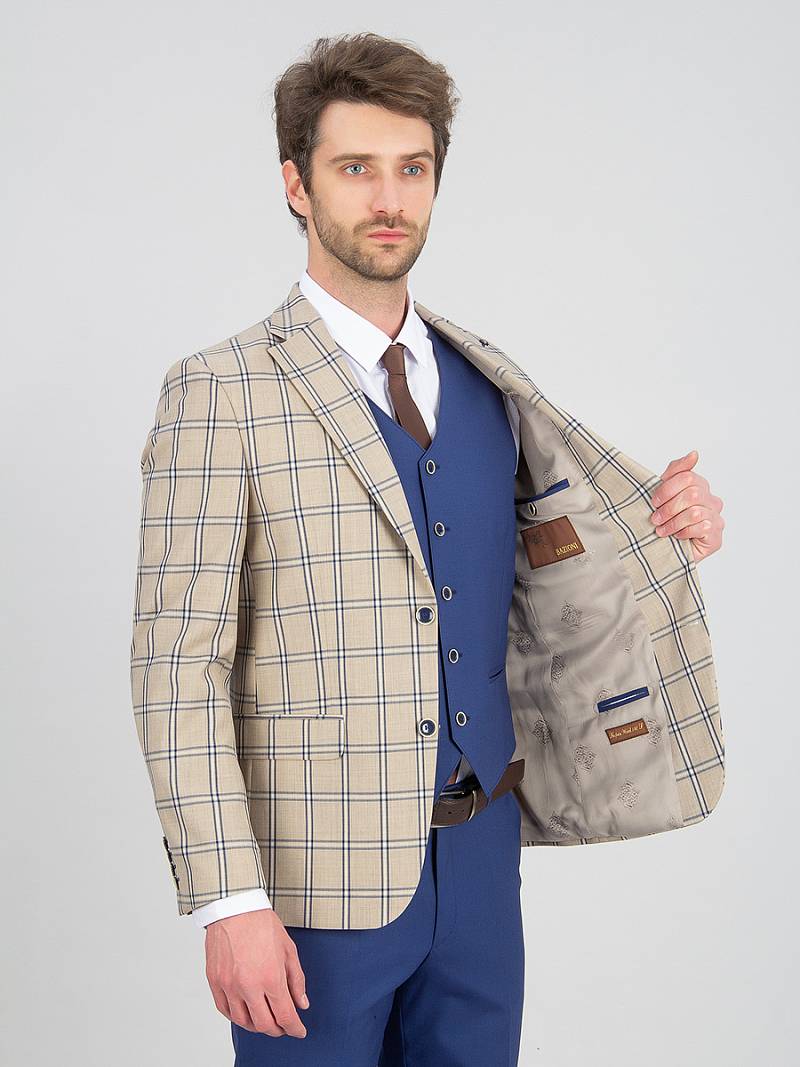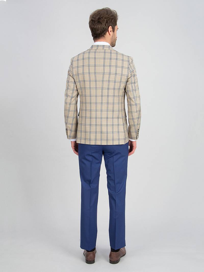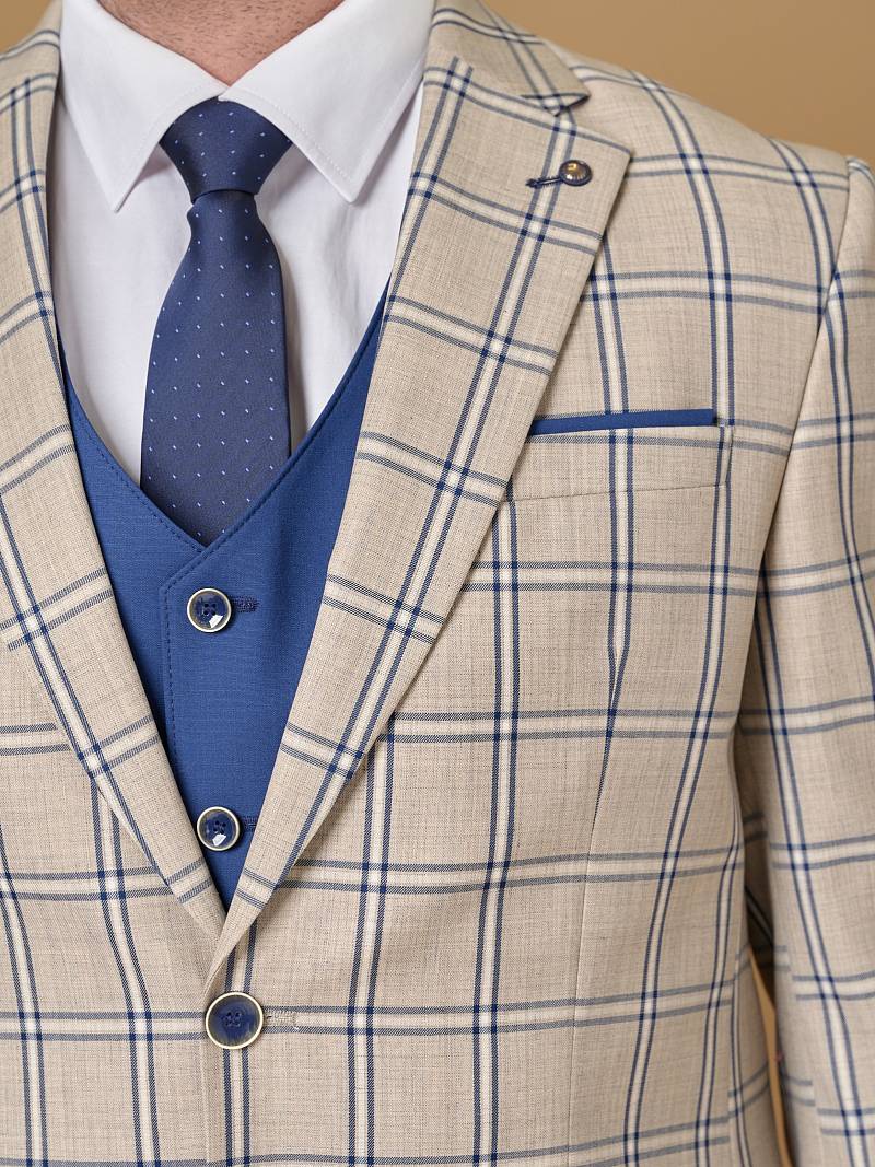 Классический костюм-тройка Classic fit . Пиджак на две пуговицы, с боковыми и нагрудным карманами, по спинке две шлицы. Брюки без защипов с боковыми и двумя задними карманами, выполнены из ткани компаньона.