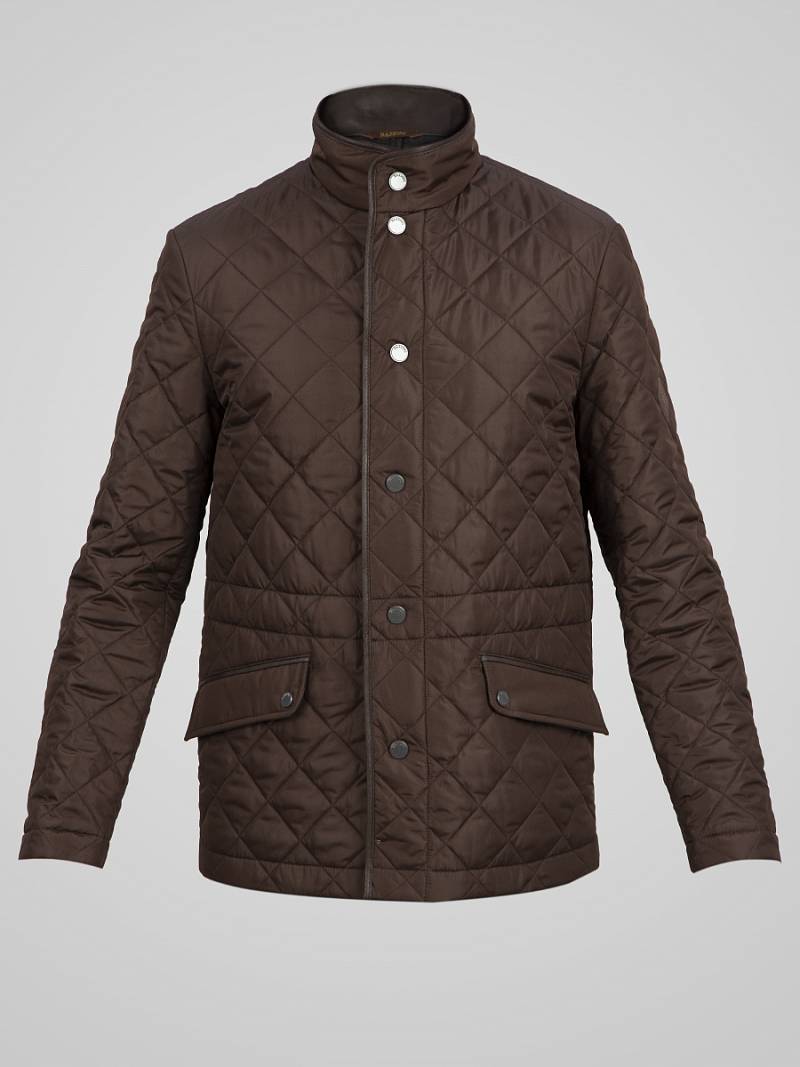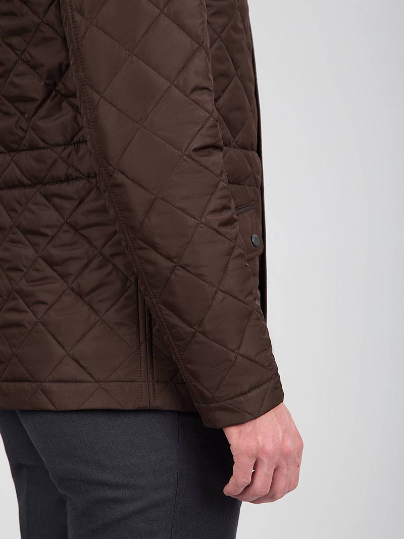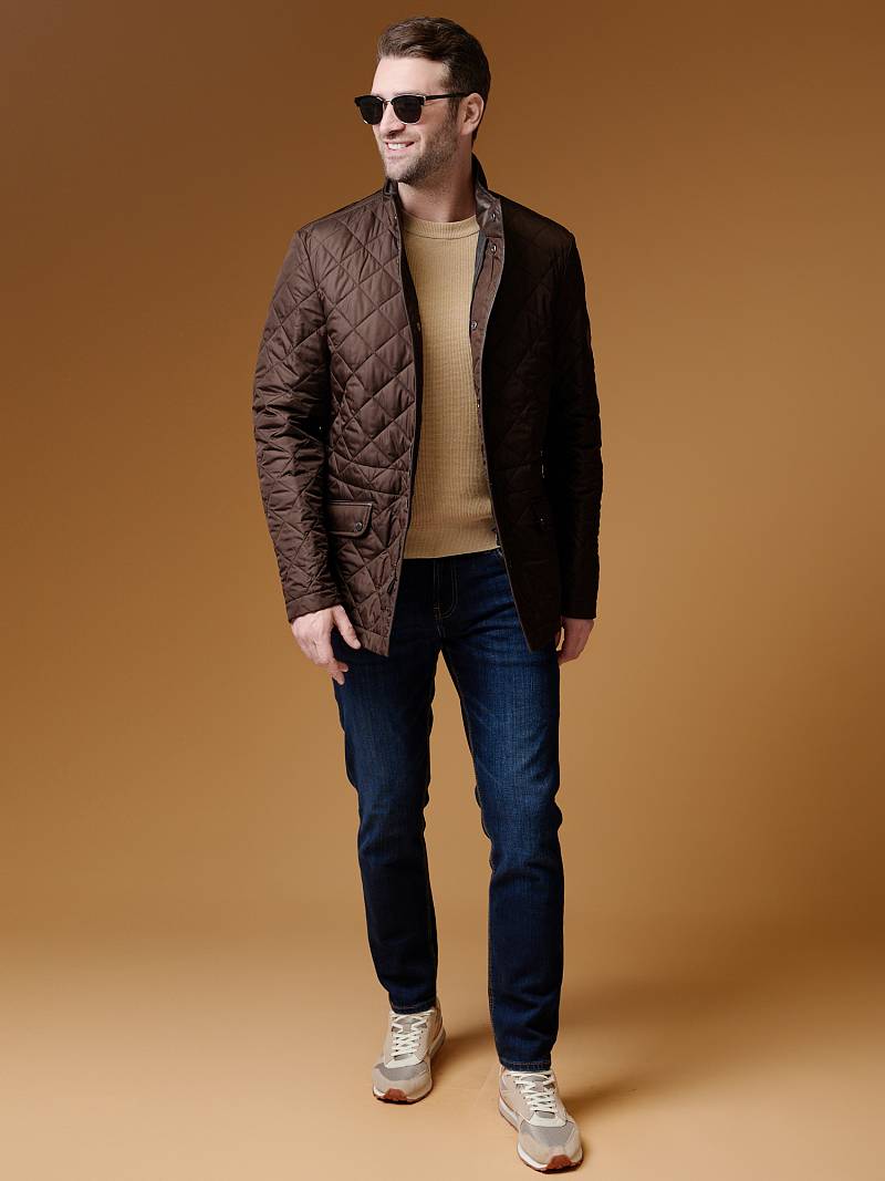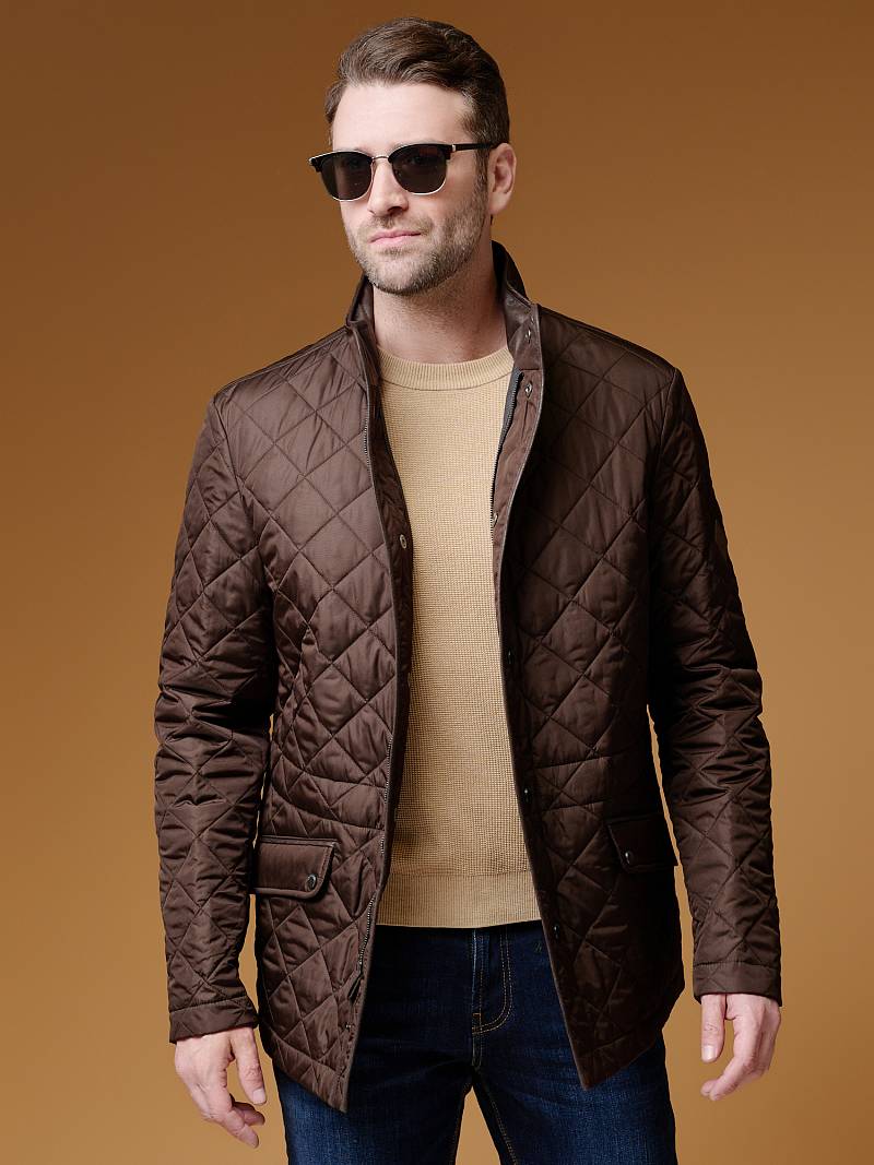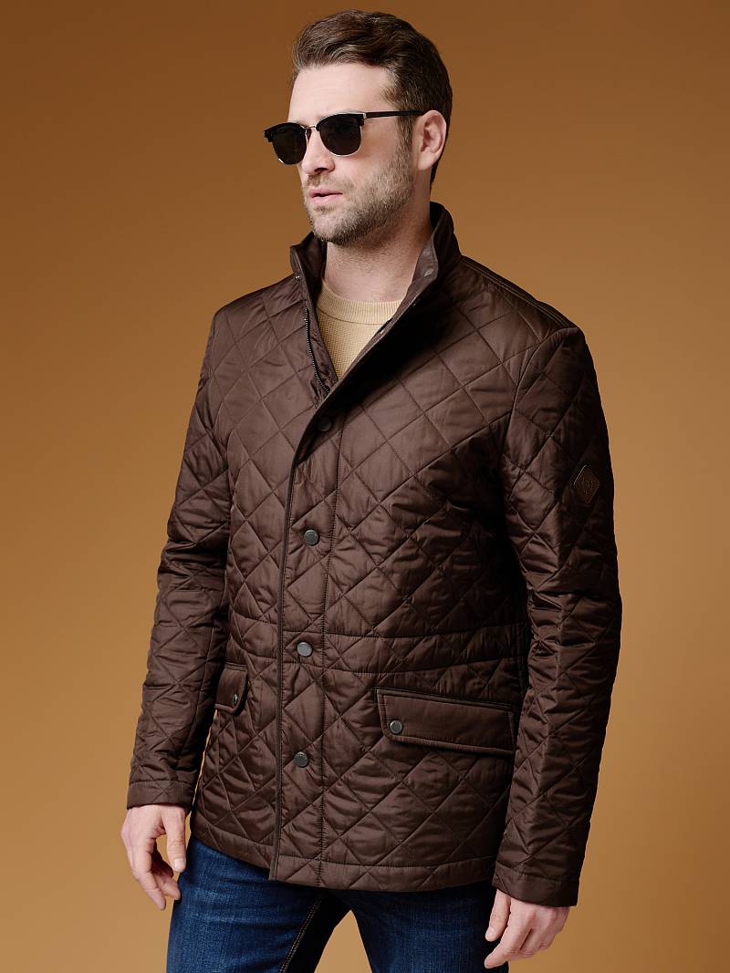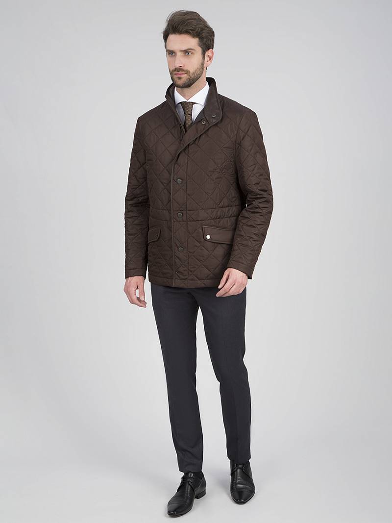 Куртка мужская из стеганой ткани, без подкладки. Все внутренние швы окантованы. Отделочная ткань-рамки карманов, окантовка борта и воротника, нижняя часть клапана, планка под нижние детали кнопки, Центральная застежка на молнию и кнопки. Воротник-стойка. Боковые карманы "в рамку" с клапаном, На линии талии кулиска, регулирующая обхват талии. Спинка со средним швом. Рукава втачные. На левом рукаве и на стойке - нашивки с логотипом. Два внутренних накладных кармана на пуговицах. Утеплитель- синтепон 100г.